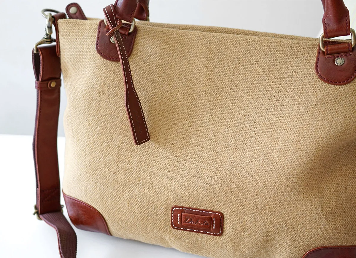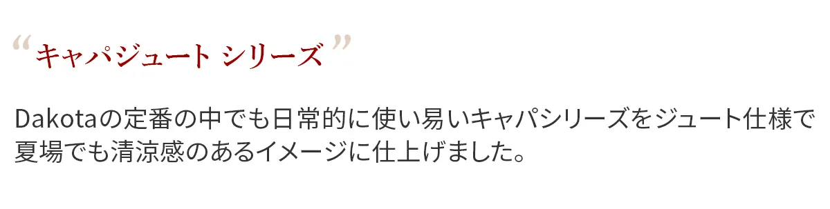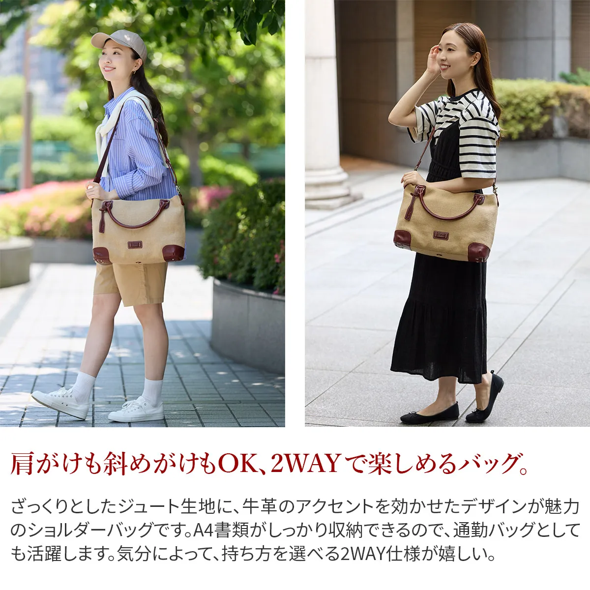 Dakotaの定番の中でも日常的に使い易いキャパシリーズをジュート仕様で夏場でも清涼感のあるイメージに仕上げました。 ジュート生地に加え、ところどころに牛革をあしらったアクセントの効いた2WAYショルダーバッグ。 サマーシーズンでも軽やかに持つことができ、日常でも使いやすいアイテムです。 A4サイズが入る大きさなのでたっぷりと収納でき、トートバッグにもショルダーバッグにもなる使い勝手の良い逸品です。