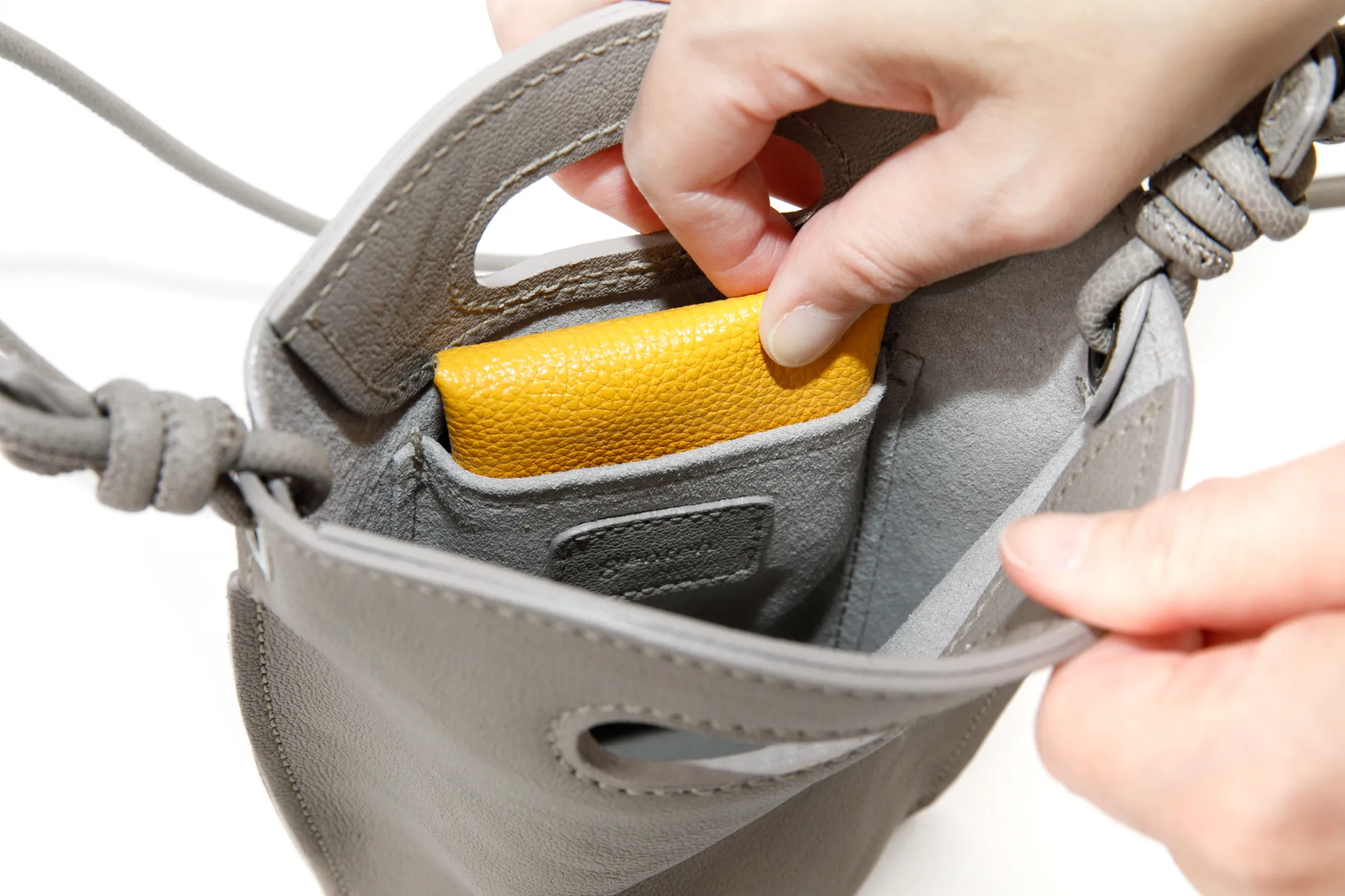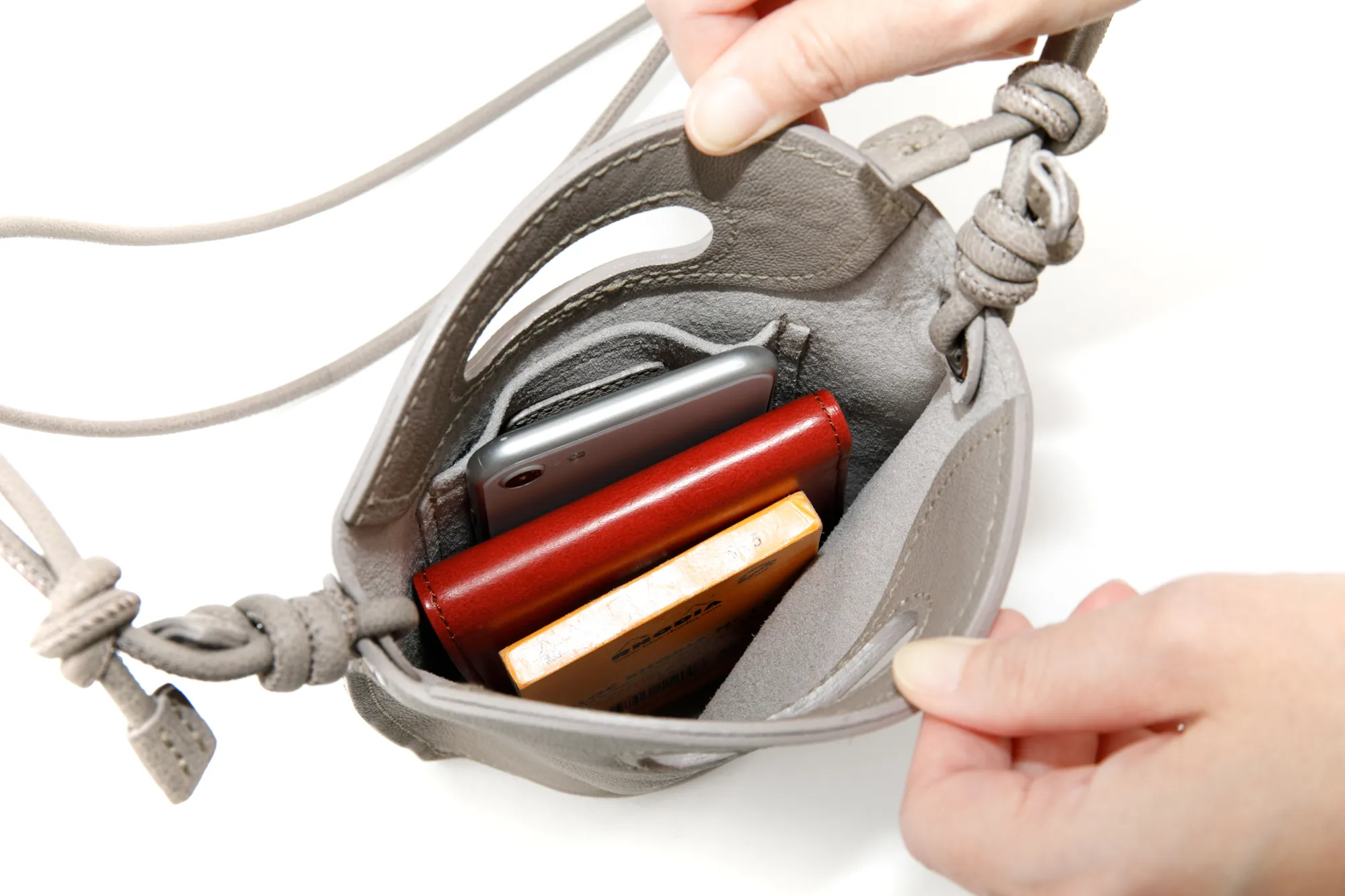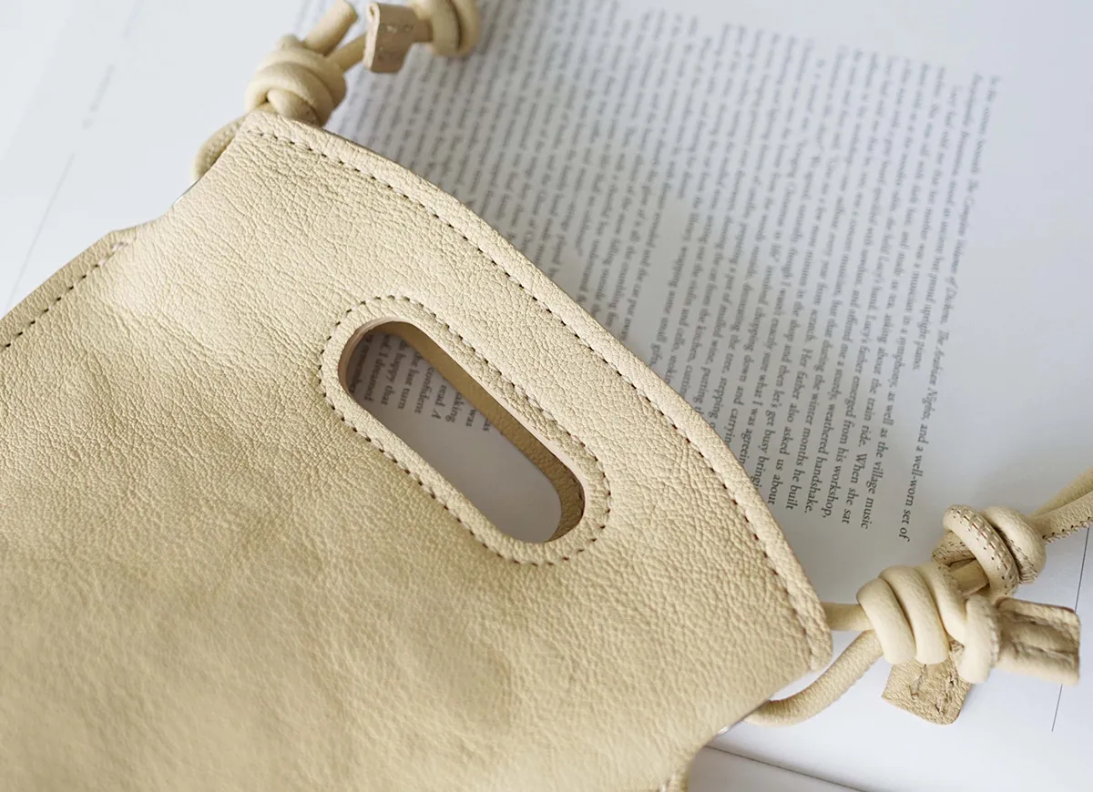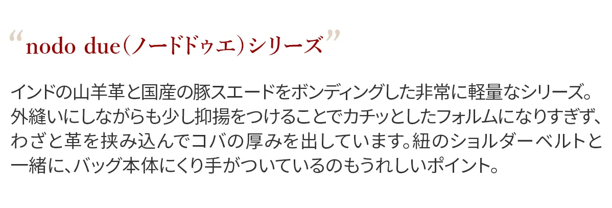 インドの山羊革と国産の豚スエードをボンディングした非常に軽量なシリーズ。 デイリーに使える2型は、2本手でも持ててショルダーとしても持てる変わり種トートと、携帯がすっぽり納まるスマホポシェット。 外縫いにしながらも、少し抑揚をつけることでカチッとしたフォルムになりすぎず、わざと革を挟み込んでコバの厚みを出しています。 紐のハンドル、ショルダーと一緒にバッグ本体にくり手がついているのもポイント。 どんなコーディネートにも合うグレーと、夏のお洋服のアクセントになる柔らかなクリームイエローの2配色です。 《素材の特性・メリット》 インド原皮の小判のゴートを使用。上品な粒シボで、軽量で銀面が強いことも特徴。 使っていると頭艶がどんどん出てきます。 貼り合わせているのは、国産の豚スエード。 必要最低限の荷物を入れてさっとお出かけいただけるサイズ感に、爽やかな明るい色味が魅力です。 すっきりとした佇まいで、カジュアルはもちろんエレガントな装いのアクセントとしてもおすすめです。 時を重ねると共に色合いは深みを増し、使うほどに柔らかく、変わりゆく革の表情をお楽しみいただけます。
