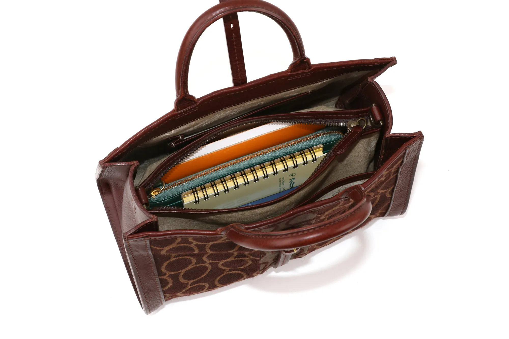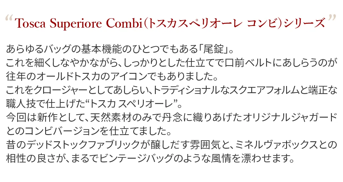 genten発足当初より続く、名シリーズである“トスカ”。 そのなかでも、初期に人気を博したモデルをスタイルや収納を現在の利便性にあわせた仕様に進化し復刻しました。 あらゆるバッグの基本機能のひとつでもある「尾錠(びじょう)」。 これを、細くしなやかながら、しっかりとした仕立てで口前ベルトにあしらうのが、往年のオールドトスカのアイコンでもありました。 これをクロージャーとしてあしらい、トラディショナルなスクエアフォルムと端正な職人技で仕上げた“トスカ スペリオーレ”。 きちんとしたスタイルはもとより、ラフなデニム、カジュアルにもマッチする汎用性の広さが魅力のシリーズです。 この復刻にあわせ、かつて天然素材のみで丹念に織りあげたオジリナルジャガードとのコンビバージョンを仕立てました。 昔のデッドストックファブリックが醸しだす雰囲気と、ミネルヴァボックスとの相性の良さが、まるでビンテージバッグのような風情を漂わせます。 どのジャガード生地も、現在は動かせる技術をもつ職人がほとんどいなくなってしまったような、古い織機で織られたもの。 昨今の薄いジャガード織りでは出せないボリューム感が魅力です。 限りある材を、余すことなく使いきる=アップサイクルを体現したものづくりでもあるので、昨今のサスティナブルな価値観にも合致するところもgentenならではのポイント。 最近の70年代リバイバルのファッショントレンドにもちょうど合わせやすいビンテージテイストを、gentenならではの手仕事、革細工でまとめた意欲作です。 gentenのロゴが散りばめられたオリジナルジャガードとミネルヴァボックスのコンビが魅力の2WAYショルダーバッグです。 端正な横長シルエットがクラシカルなムードをより一層高めてくれます。 A5対応で日常使いしやすいサイジング。ポケットを豊富に備え、デザイン性がありながら機能性も高いアイテムです。 開口部は3段階調節ができる革ベルト付きで、荷物の内容量に合わせて長さを変えられるのも嬉しいポイント。 内装の中央にマチ付きのファスナーポケットを備え、お財布などの定位置にもおすすめです。 ショルダーベルトの長さは14段階で調節できます。ナスカン金具を外せばトートバッグ単独のご使用も可能。 同素材の肩当てパッドを付属し、長時間の使用でも肩へのダメージを軽減してくれます。