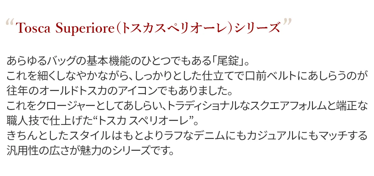 genten発足当初より続く、名シリーズである“トスカ”。そのなかでも、初期に人気を博したモデルをスタイルや収納を現在の利便性にあわせた仕様に進化し復刻しました。 あらゆるバッグの基本機能のひとつでもある「尾錠」。これを、細くしなやかながら、しっかりとした仕立てで口前ベルトにあしらうのが、往年のオールドトスカのアイコンでもありました。 これをクロージャーとしてあしらい、トラディショナルなスクエアフォルムと端正な職人技で仕上げた“トスカ スペリオーレ”。 きちんとしたスタイルはもとより、ラフなデニム、カジュアルにもマッチする汎用性の広さが魅力のシリーズです。 懐かしくもあり、あたらしくもあり。そんなニュークラシックな復刻トスカ。気負いなく存分にお楽しみください。 革ベルトがアクセントになったクラシカルな佇まいが魅力のアイテムです。マチ幅をたっぷり備えた内部はファスナーポケットの仕切りにより2室に分かれています。使用頻度の高い物はオープンになった出し入れのしやすい場所へ、貴重品類はファスナーポケットで安全に収納できます。ナチュラルな革の素材感を楽しめるアイテムは、フォーマルから大人のカジュアルスタイルまで幅広くマッチします。