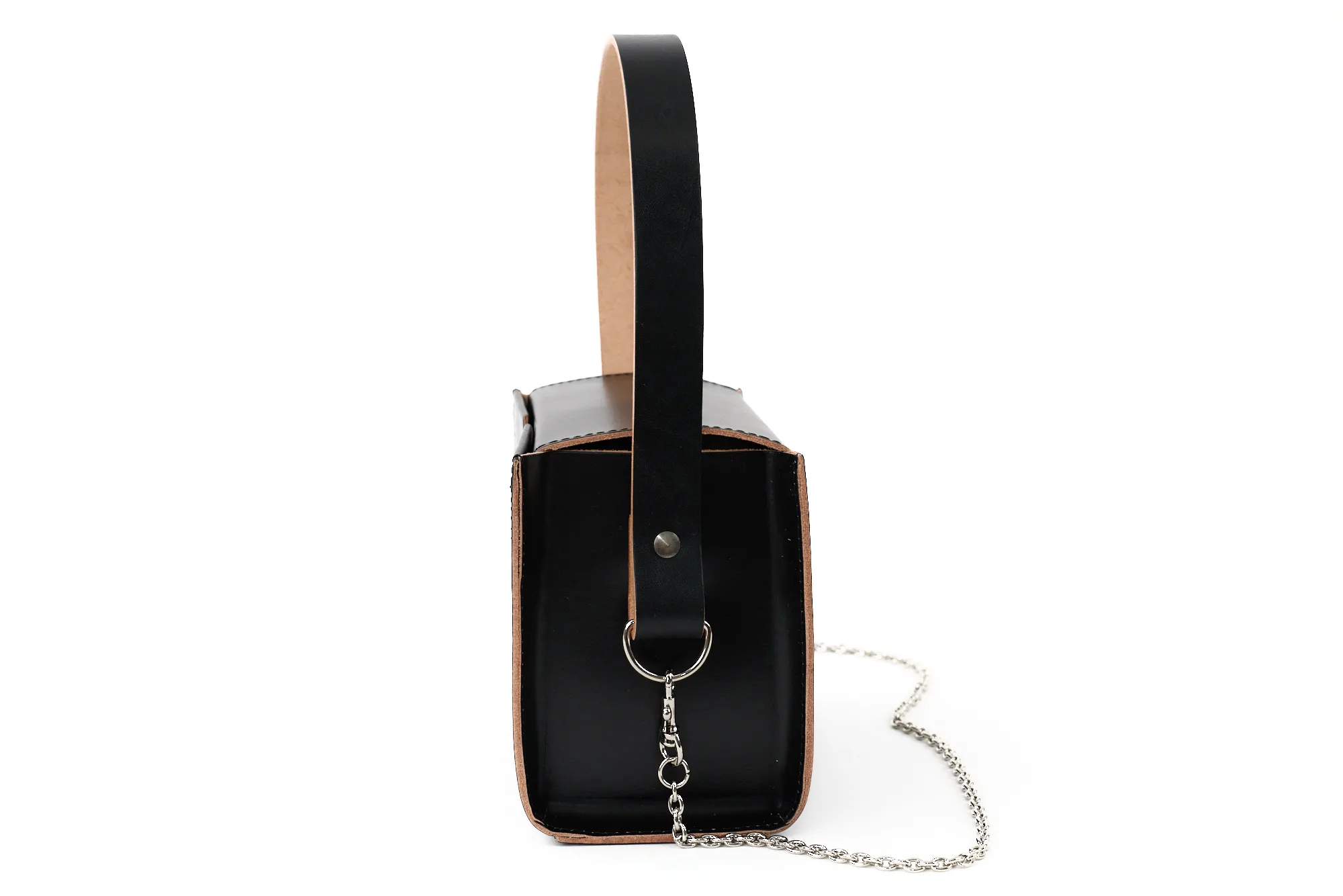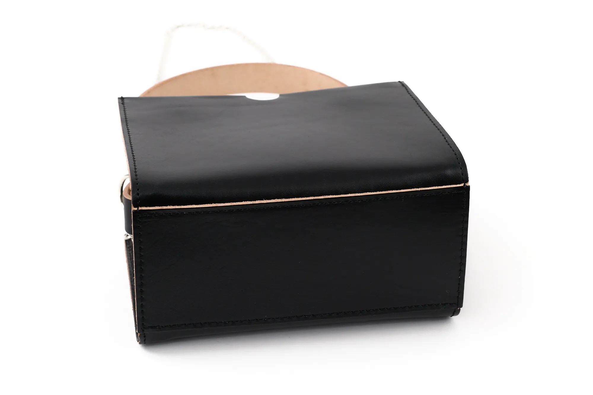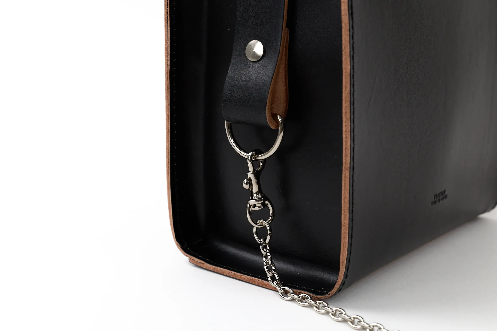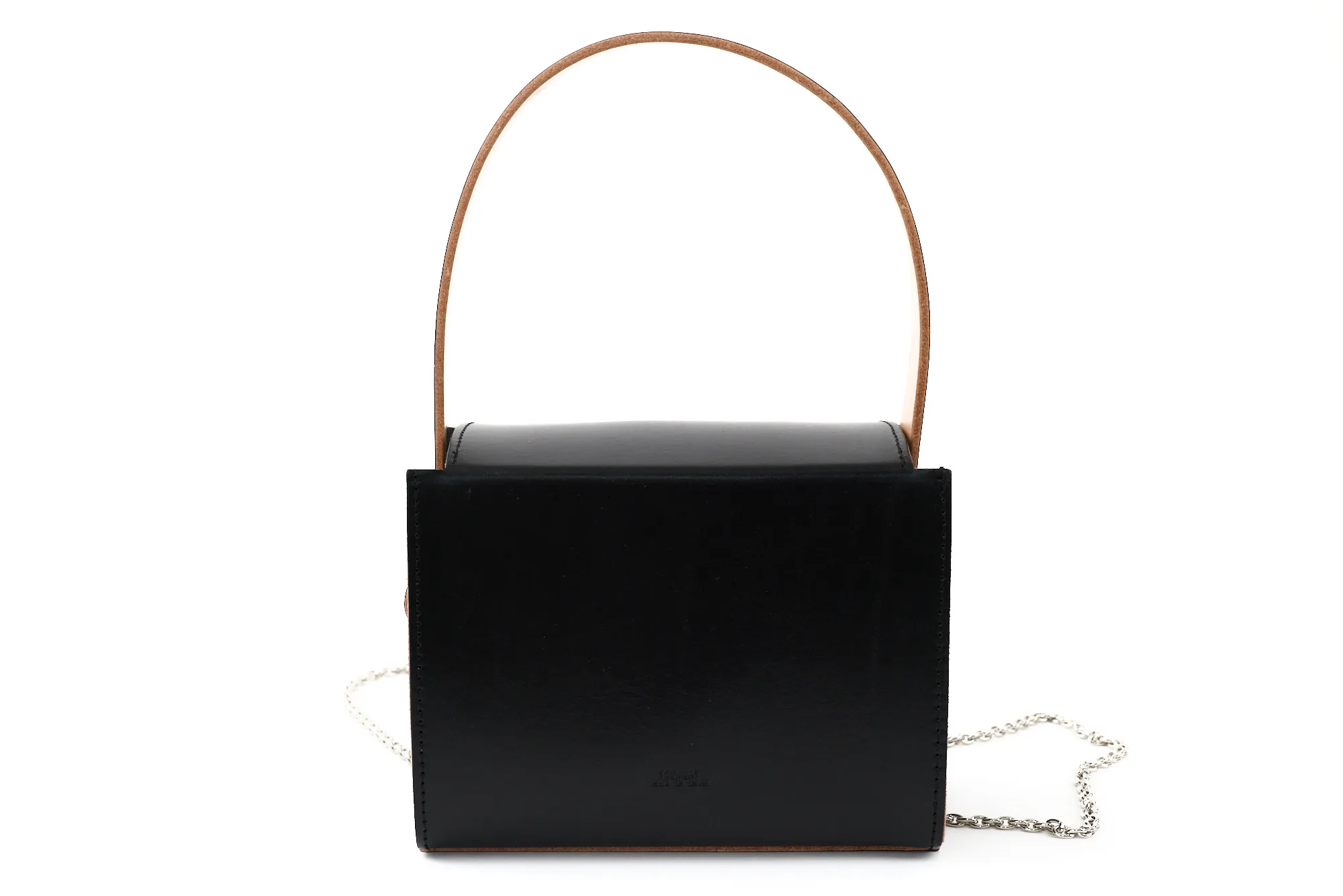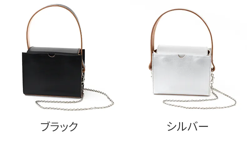 端正なスクエアフォルムが目を引くバニティバッグです。 開口部のフラップには丸いくぼみがついており、開閉しやすい工夫がされています。 ハンドルは回転金具で装着しており、付属のチェーンショルダーを使用する場合は底側に反転させることが可能です。 普段使いから大切なお出かけにも活躍してくれるアイテムです。