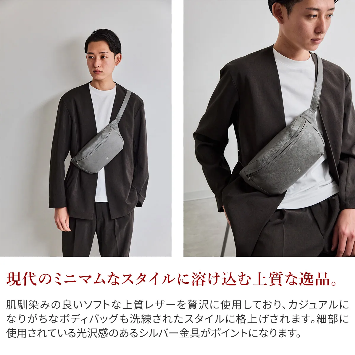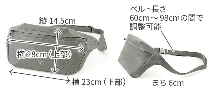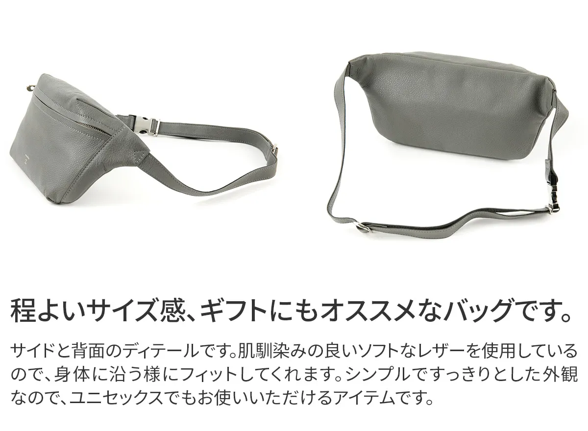 素材は原皮選びから鞣(なめ)し、仕上げまで、革の本場であるイタリアのタンナーで品質管理され作られています。 この原皮は、タンナーが扱うトップクオリティーの生地のみから選ばれ、長時間ゆっくりとミーリングされた天然のシュリンクレザーです。 革の質感をしっかり感じられるように表面はごく薄いコーティングにしているのは、同時に衣類への色移りがしないような特別な加工でもあります。 上質なソフトシュリンクレザーは着用時のフィット感が良く、快適に使用できます。 程よいサイジングでボディバッグとしてもお持ちいただけるので、自転車やバイクの移動時にも活躍します。