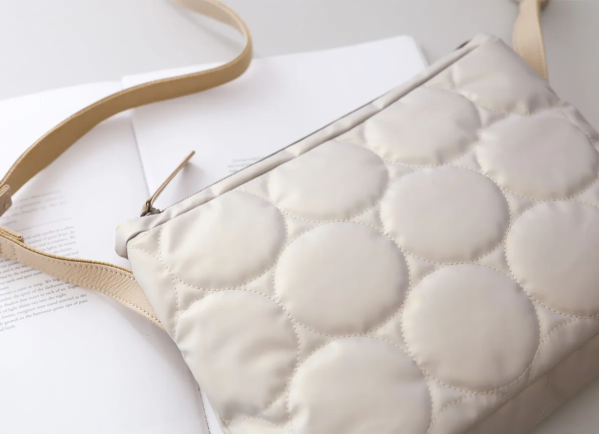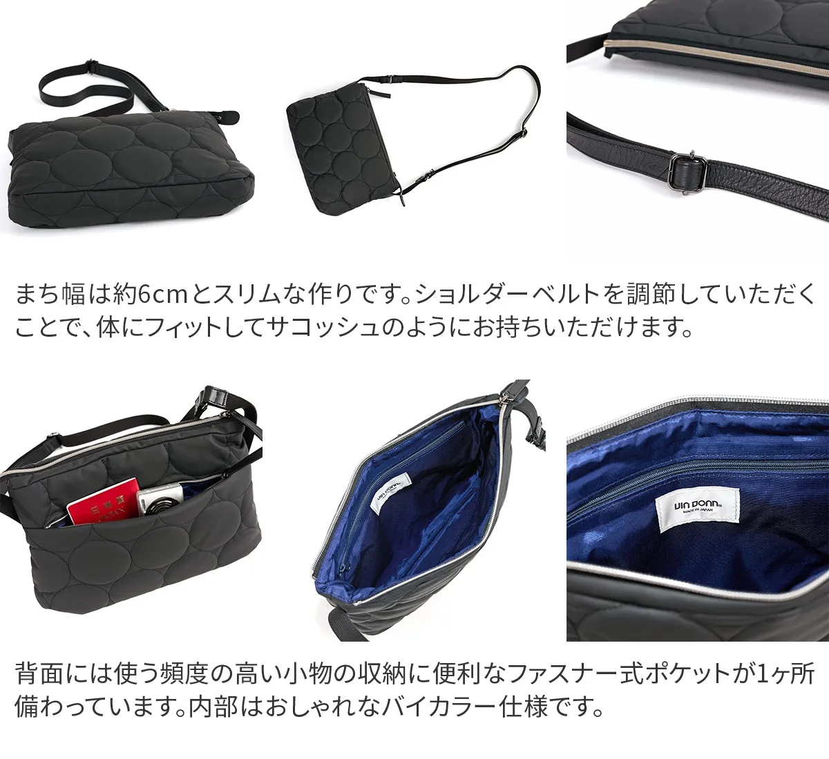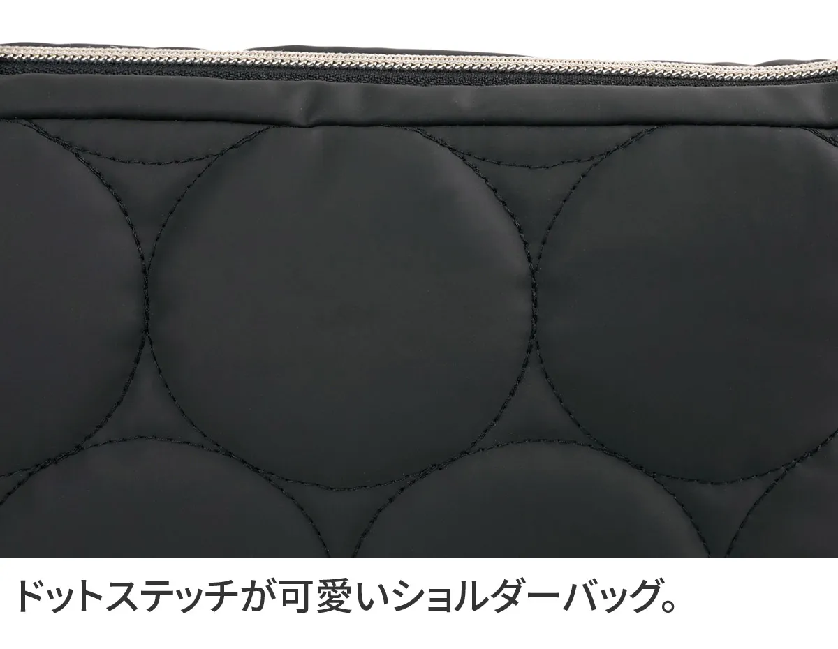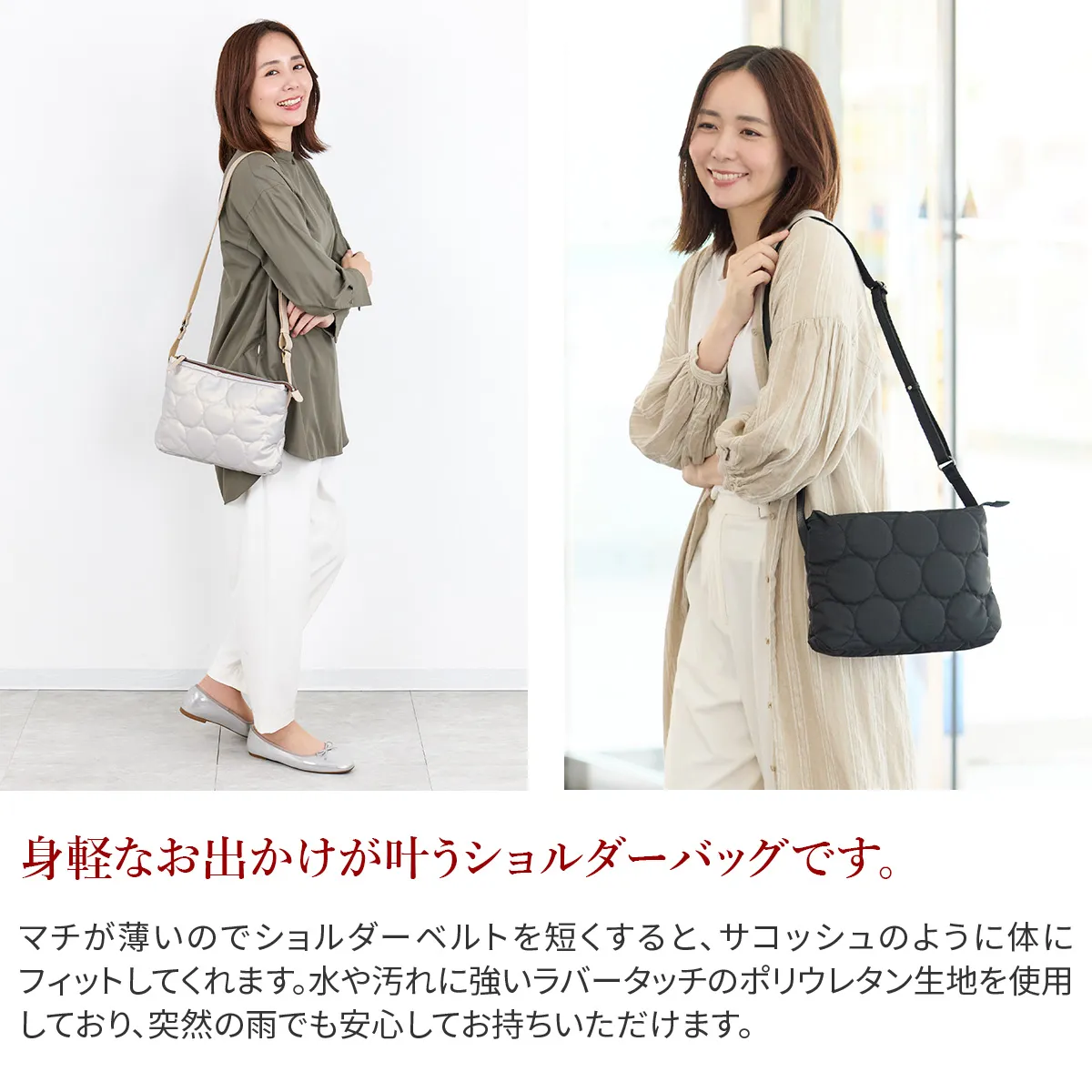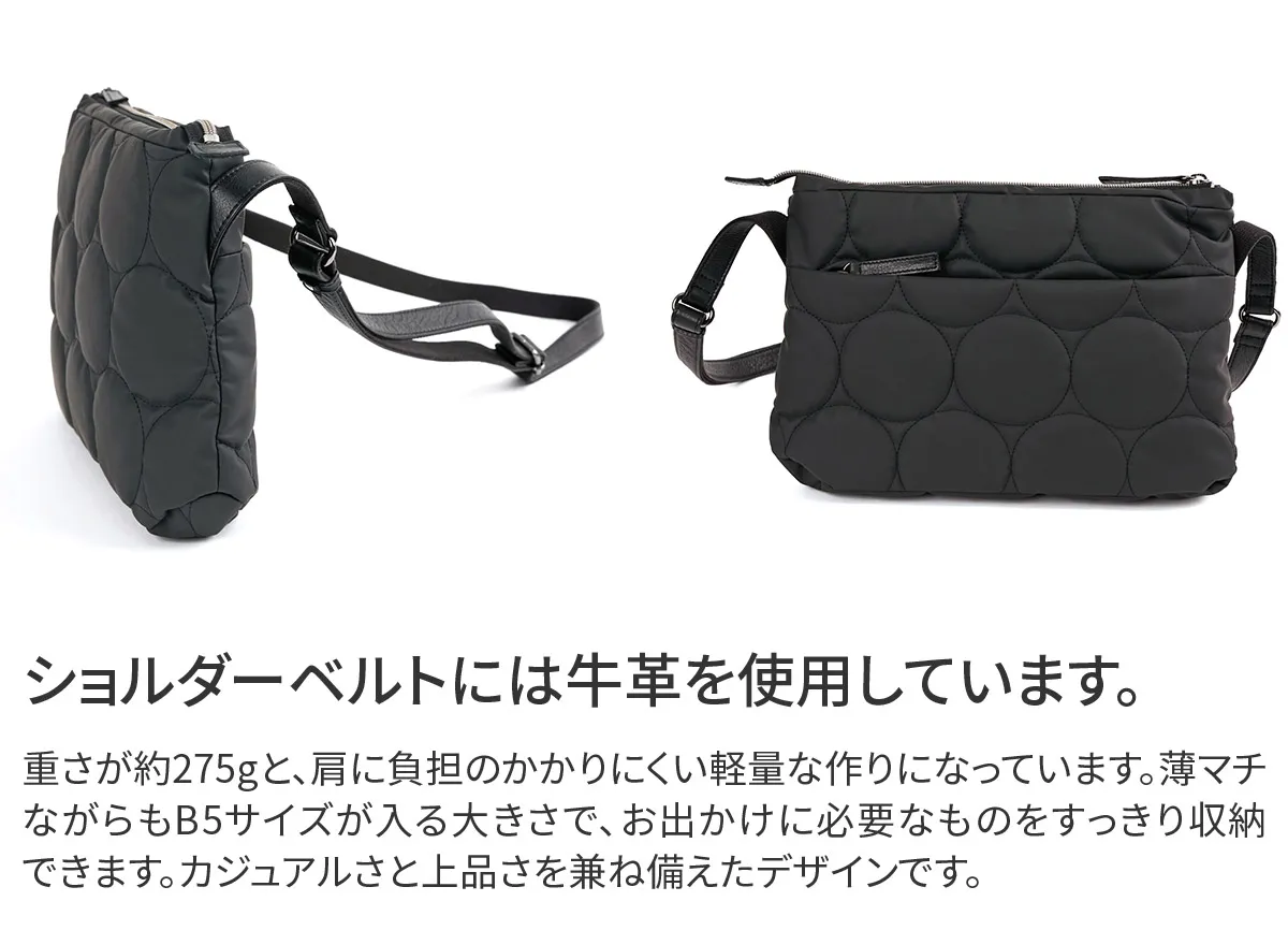 ふっくら軽やかなドットキルティングバッグシリーズ。 雨や汚れに強いラバータッチのポリウレタン生地を使用しています。 《素材の特性》 ・アルコール系や防水スプレー等の薬品を吹きかけると変色の恐れがあるので使用しないでください。 ・汚れた場合は乾いた柔らかい布か、水で濡らして強く絞ったもので、優しく拭くようにしてください。 ・状態により、色や質感など写真と多少異なる場合がございます。 ・模様の指定できません。予めご了承ください。 ・革の特性上、細かいキズ・しわ・点などが見られる場合がございますが、不良品ではございません。 マットな質感で大きめのドットステッチが目を惹くショルダーバッグ。 薄マチながらもB5サイズが入る大きさでお出かけに必要なものをすっきり収納できます。 ショルダーベルトには牛革を使用しているため、カジュアルと上品を兼ね備えた逸品です。