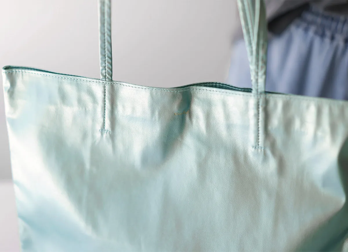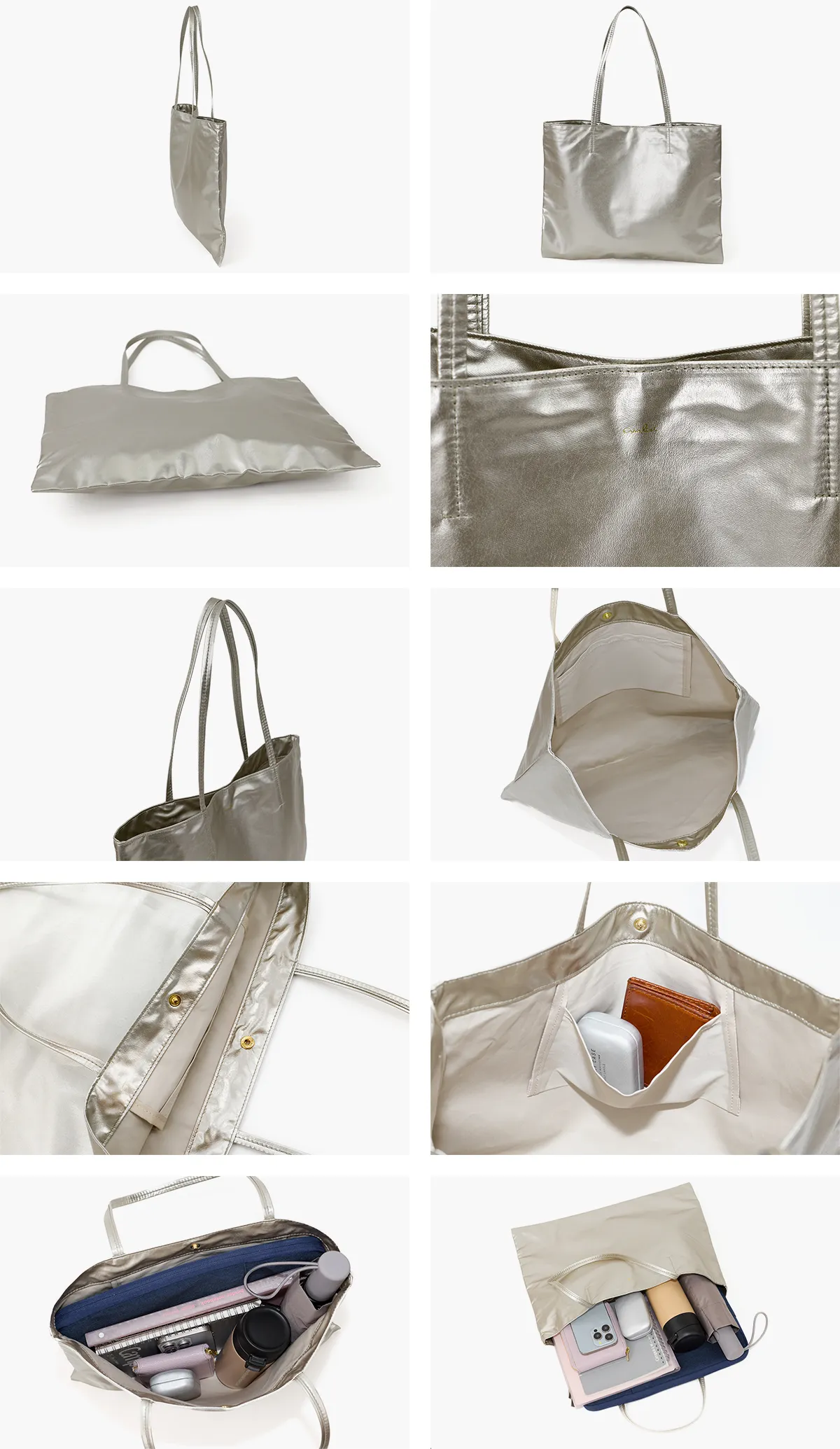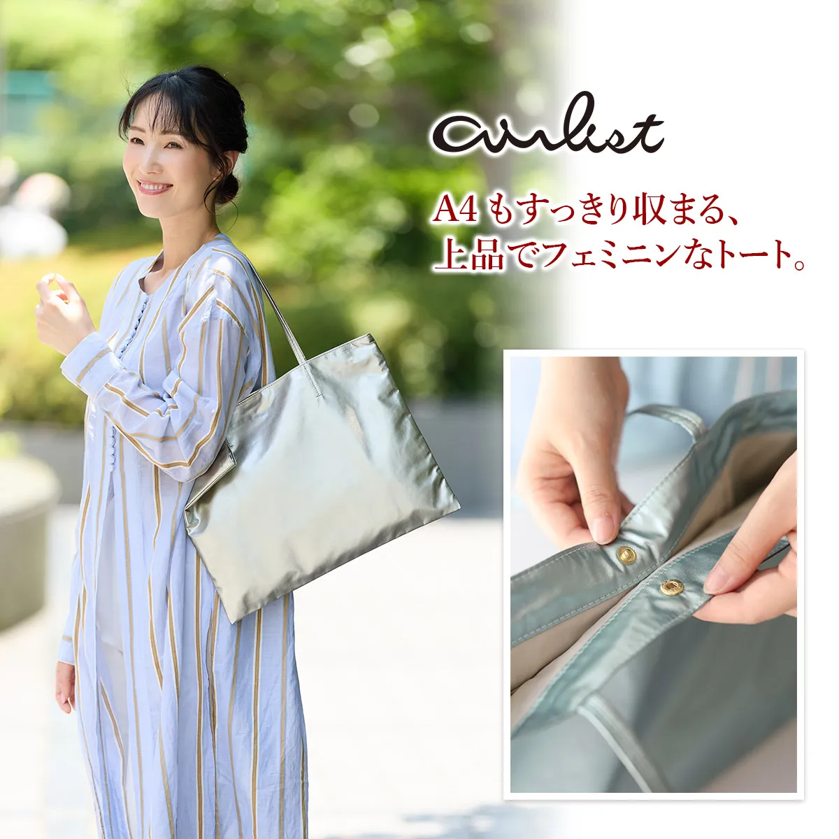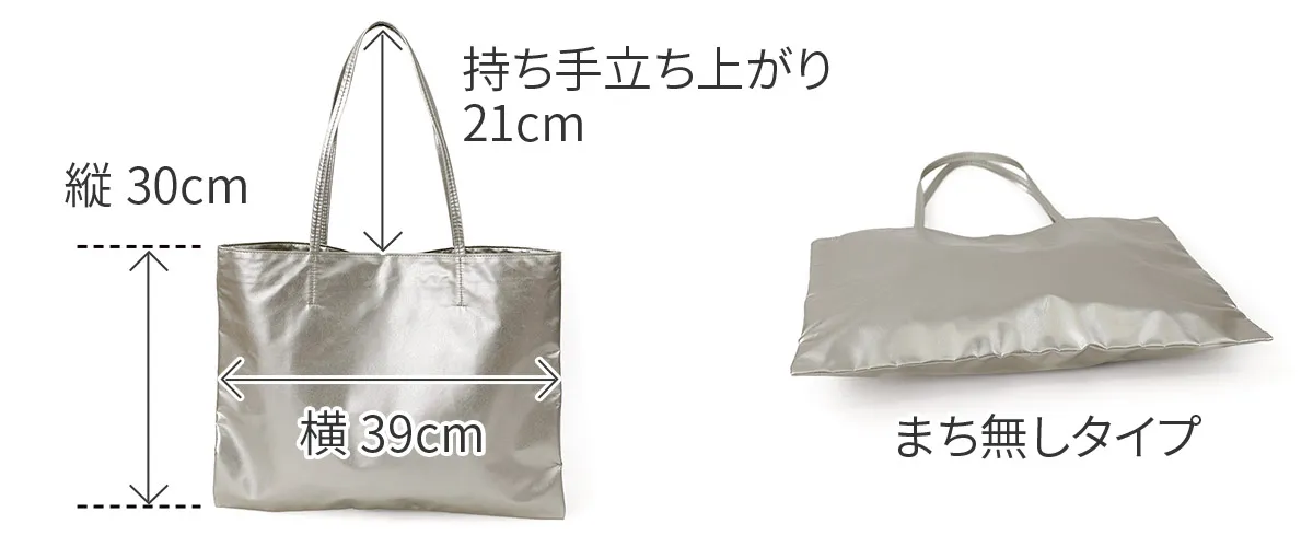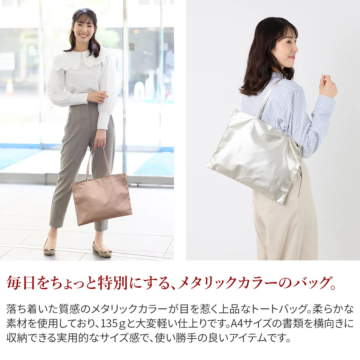 “羽根のように軽い”トートバッグ。 「シンプルなトートバッグやサブバッグはカジュアルなものが多い。」 「おしゃれなものがなかなか見つからない」という声から生まれたバッグが“フェザー”シリーズです。 落ち着いた質感のメタリックカラーが目を惹く上品なトートバッグ。 柔らかな素材を使用しており、135gととっても軽い仕上りです。 マチを設けていないフラットでスリムな佇まいの為、バッグに折りたたみサブバッグとして持ち運べます。 A4書類を横向きに収納できる実用的なサイズ感で、使い勝手の良いアイテムです。