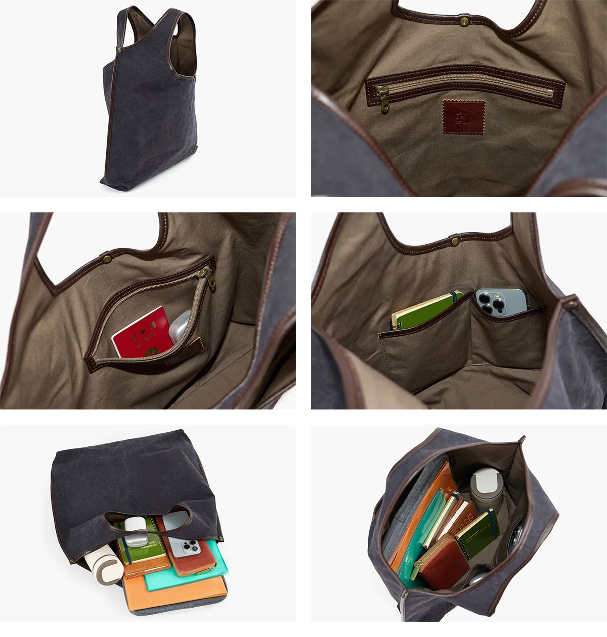素材には、ヌメ革などに使われるタンニンで染め、洗いをかけ深みを増した国産9号帆布を使用しています。洗いをかける事により1度濡れた糸が乾く際に引き締まり生地に強度が増します。また、洗うことにより色の深みと優しい表情が特徴的な素材です。 B4サイズに対応した大きさでありながら、とても軽量で普段使いにお勧めのトートバッグです。本体部分に綿素材を使用し、パイピング等の細部に牛革を使用しています。開口部はオープンタイプですが、上部にかけてマチなしの作りになっていますので、広がらずにスマートにお持ちいただけます。