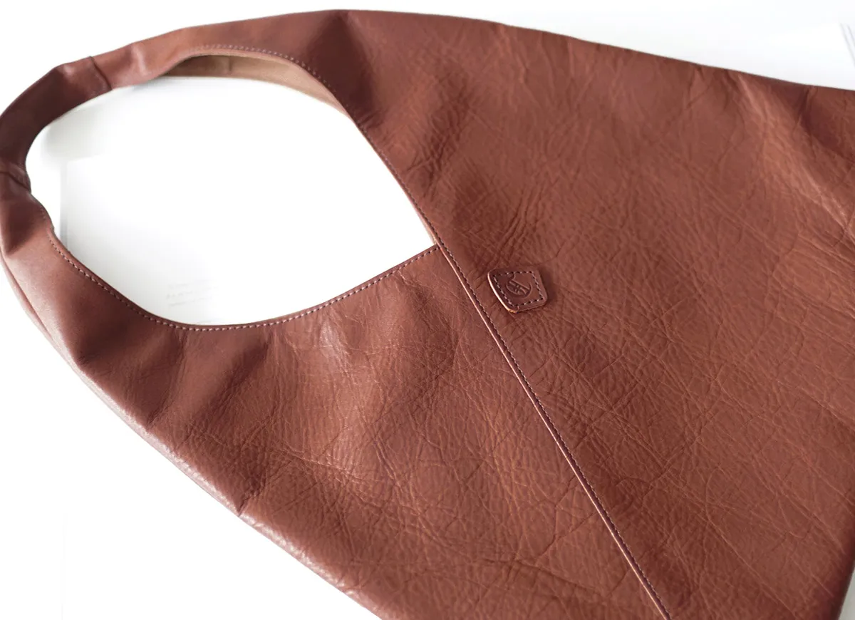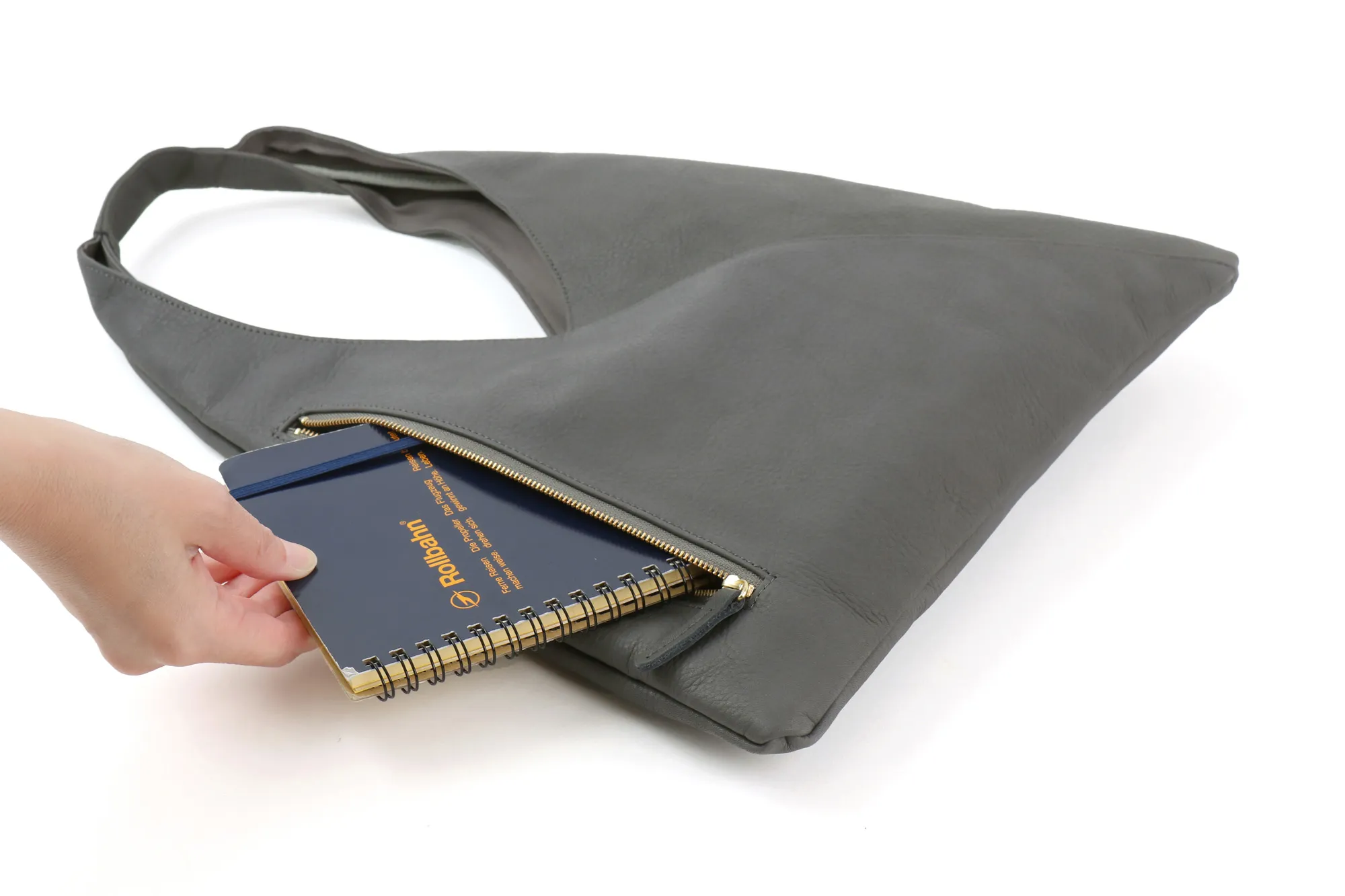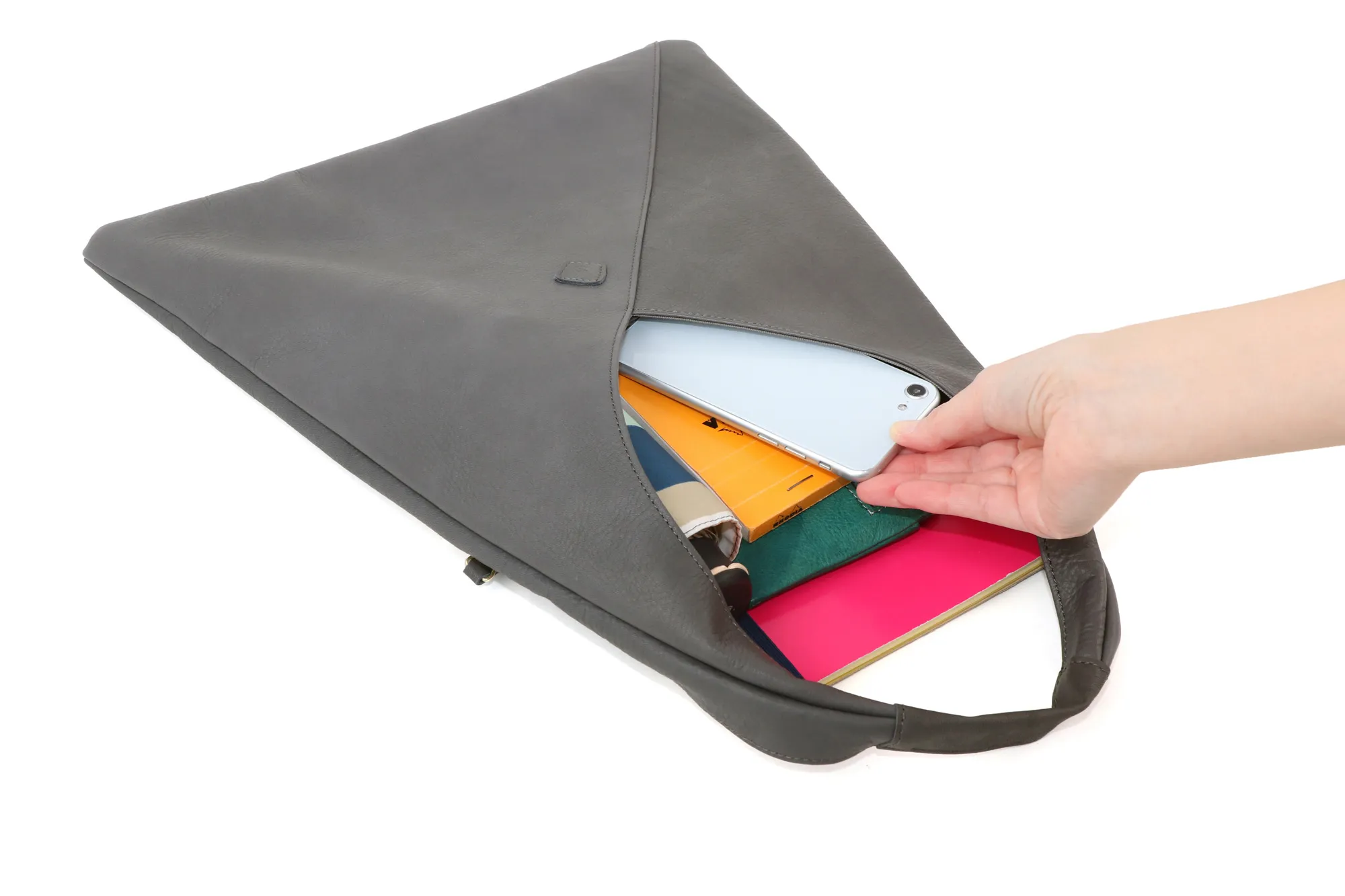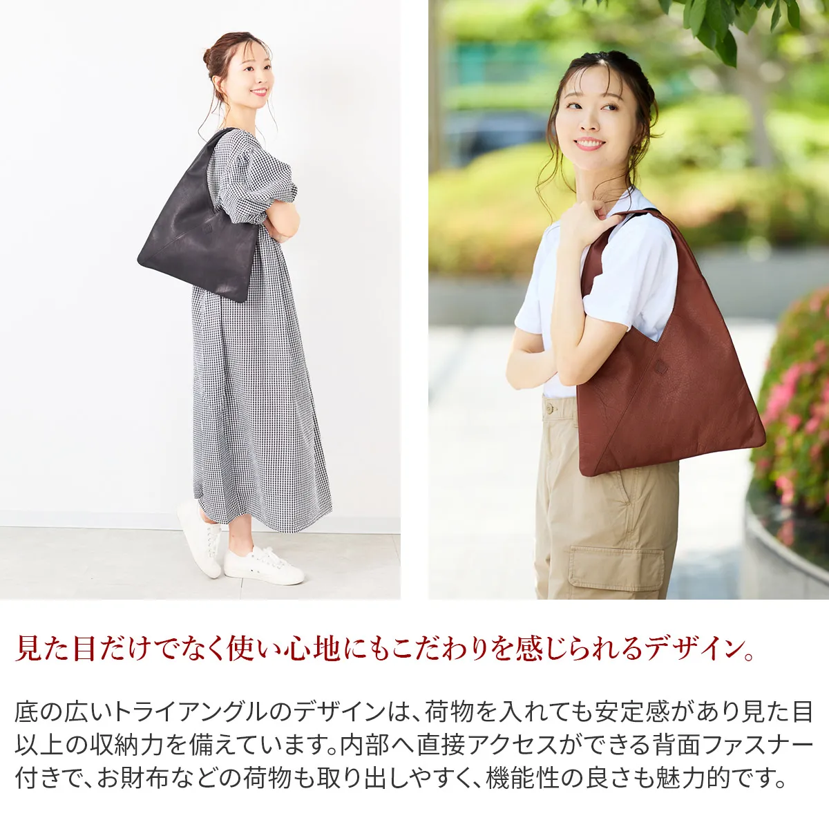 トライアングルのフォルムがモダンな印象のトートバッグです。マグネット式のメイン開口部を開ける事なく、背面ファスナーから内部にアクセスができる機能性の良さが魅力的。軽くてしなやかなレザーとスリムなフォルムで見た目以上の収納力を持った、デイリー使いにピッタリのアイテムです。