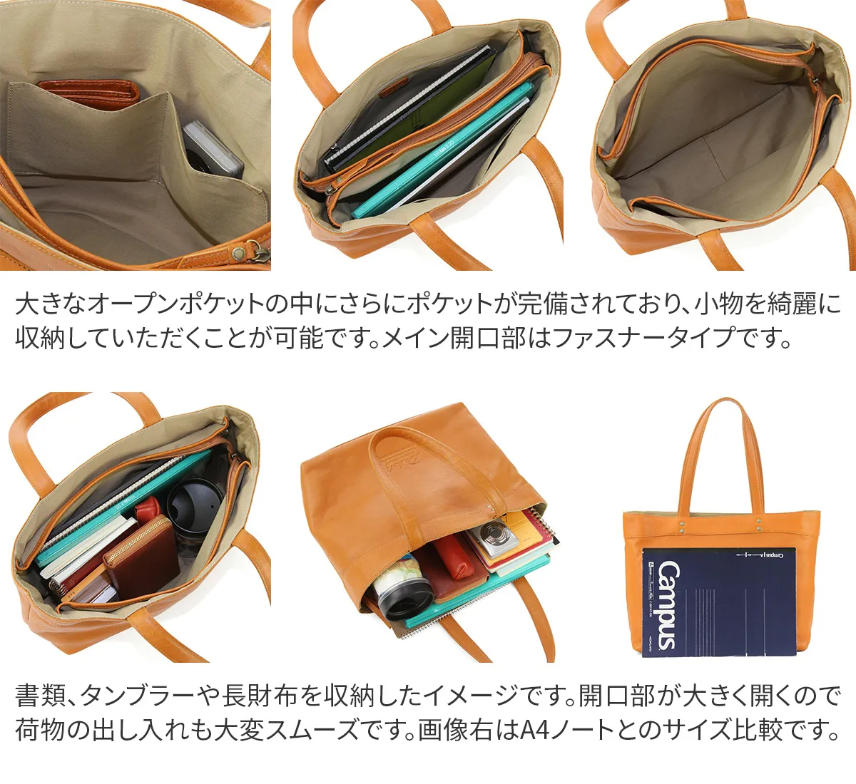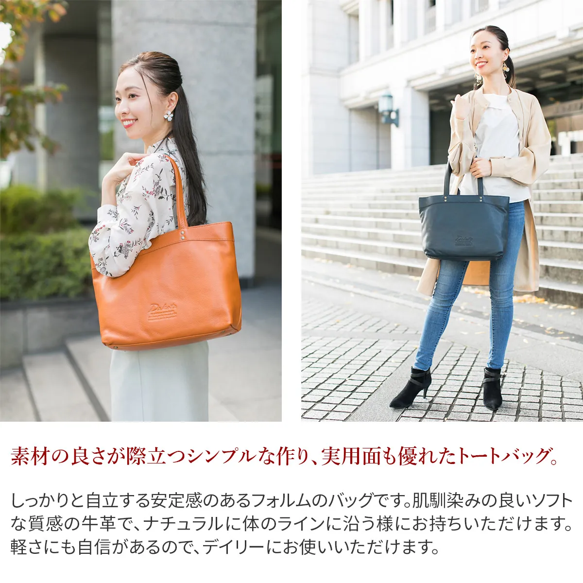 軽量でソフトな牛革を使用したデイリーユースなシリーズ。サイズ感やフォルムにこだわりつつ、素材の軽さを活かした作りで、毎日のコーディネートに合わせやすいようにデザインはシンプルに仕上げられています。 メイン開口部の両サイドにポケットが備わっており、荷物を分けて収納でき、使用頻度の高いスマホやパスケースなどを入れていただくのにも役立ちます。 持ち手立ち上がりが23cmあるので、肩がけしてお持ちいただけます。A4サイズ対応の嬉しいサイズ感は通勤や通学にも最適です。