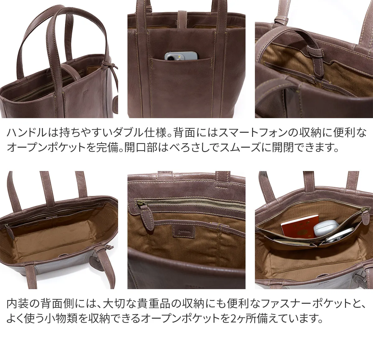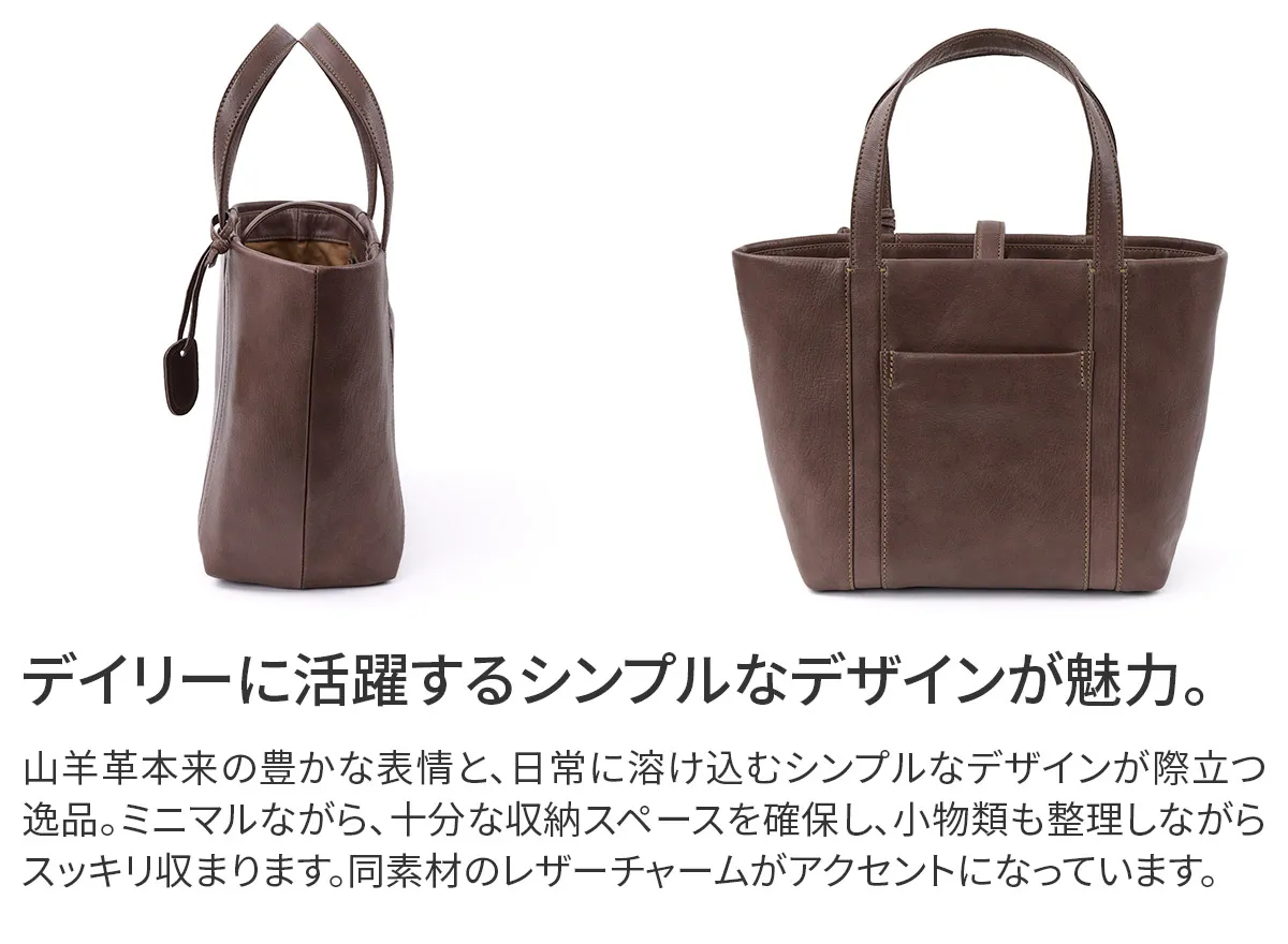 ゴートの魅力は、軽くて丈夫なこと。薄い革ですが、繊維質が緊密で弾力があるため、銀面(革の表面)の強度があります。それでいて、しなやか。さらに雨染みにも強く、扱いやすい革です。 ムラ染めをしたあとに、革の表面にメノウなどの石をあてて磨き上げ、摩擦によって透明感のある艶や色の濃淡を出す、グレージング加工というひと手間がかけられています。 <取り扱い上の注意・お手入れ方法> ゴートは比較的摩擦に強く、多少の汚れは乾いたタオルなどでサッと拭くだけでキズやシミが付きにくいのが特徴です。 使い勝手の良いシンプルなデザインのトートバッグです。 耐久性の高いゴートレザーを使用している為、気軽に日常使いしやすくお仕事バッグとしても重宝します。 シンプルな外観ですが内部には、大小様々なサイズのポケットを設けており、 小物の定位置を決めて収納することができます。