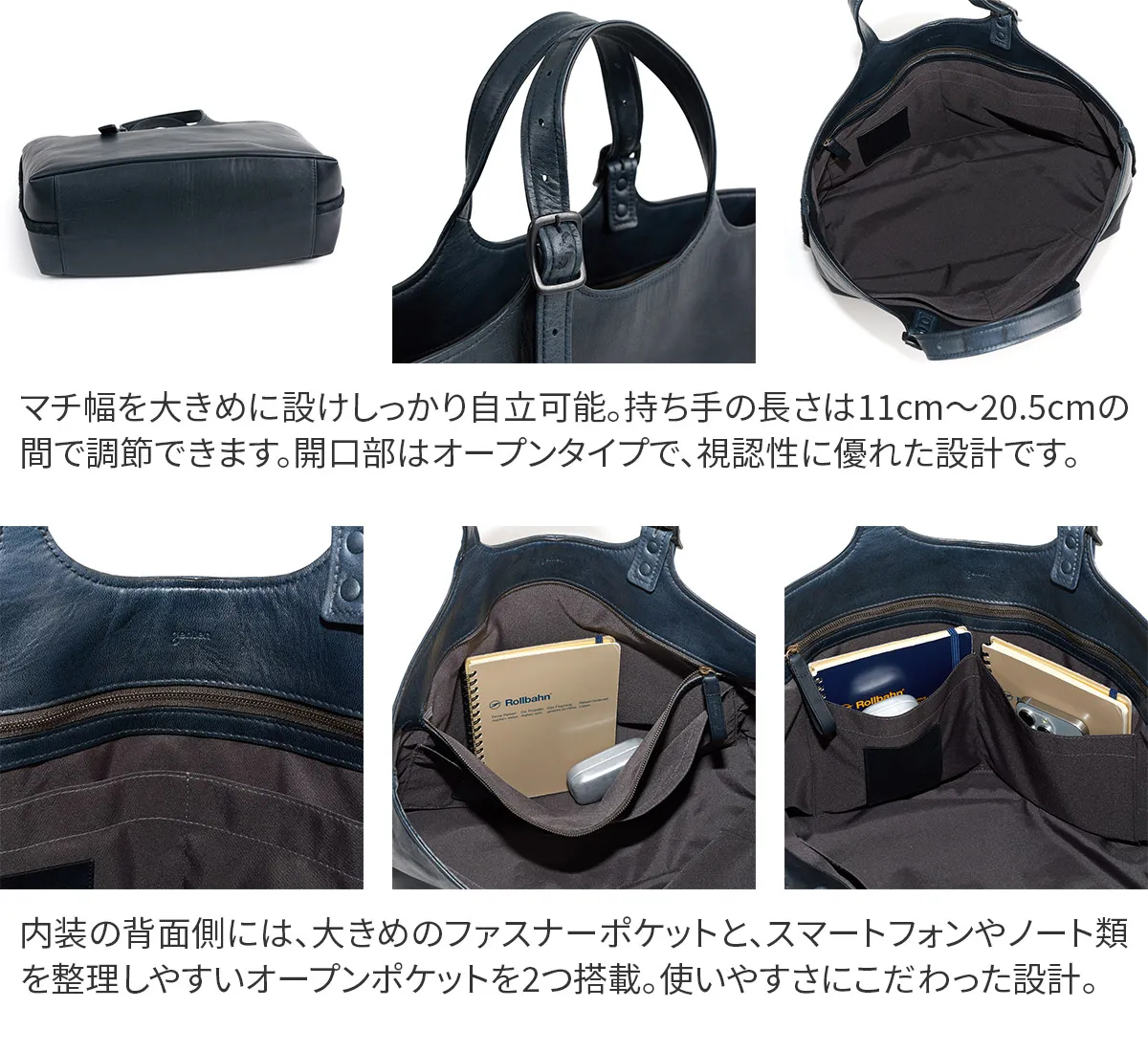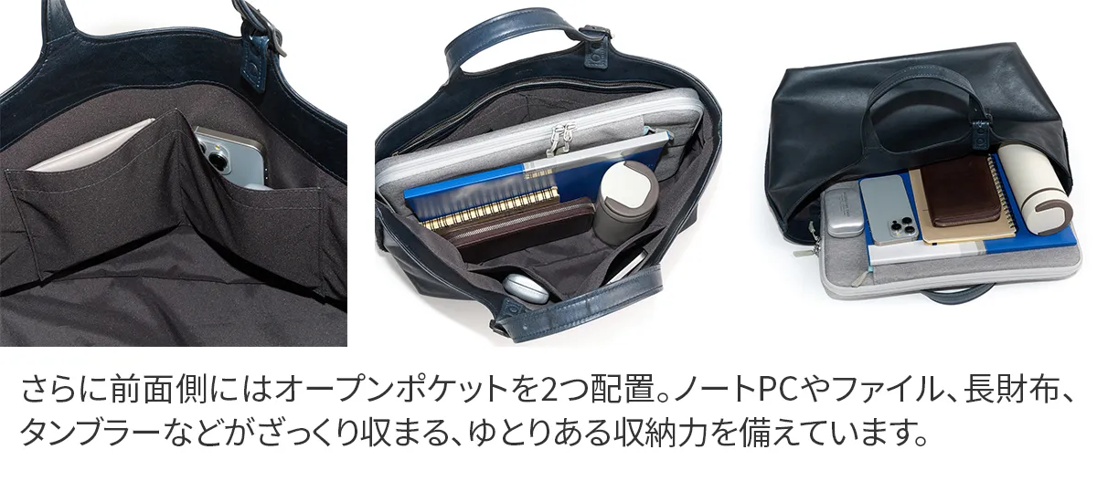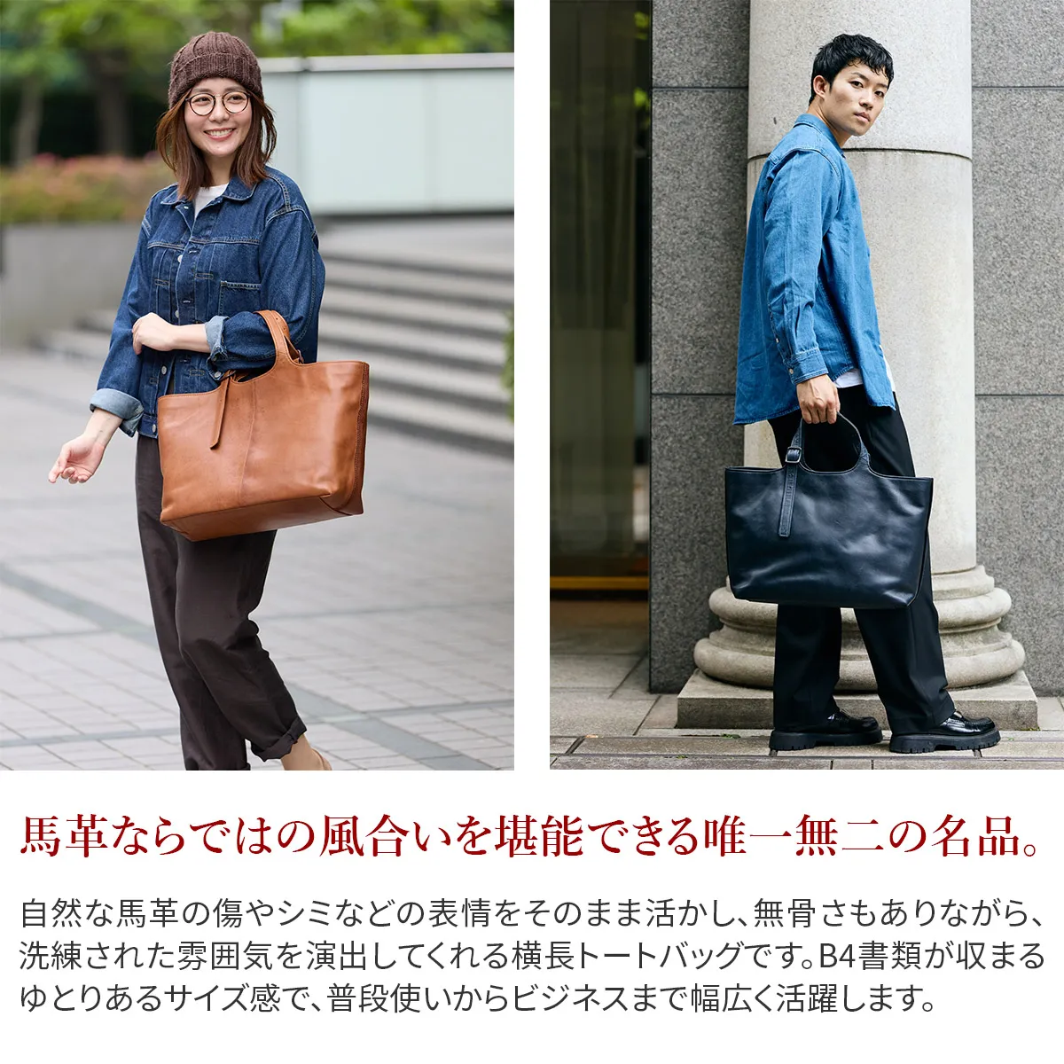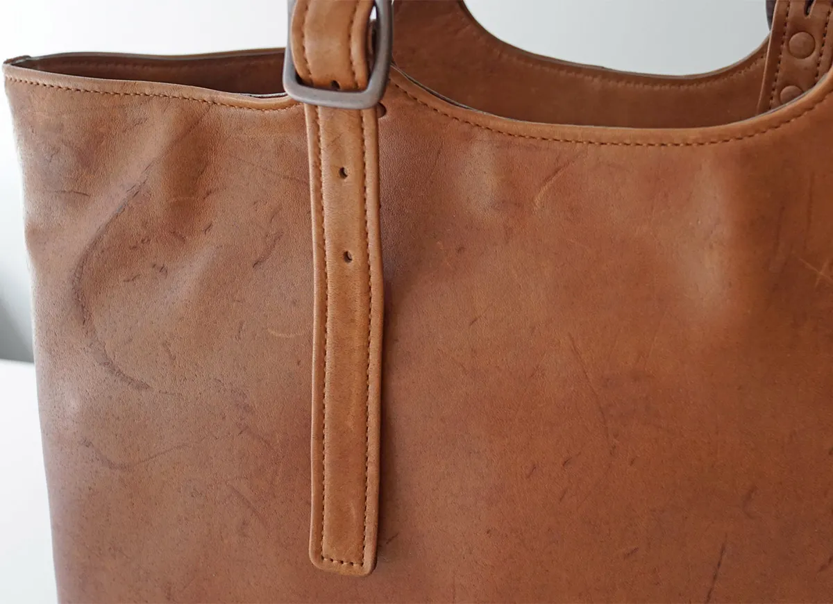 「本革の景色」を表現したゲンテンならではの【馬革】のバッグシリーズ。(馬革は、他の動物と比べて行動範囲が広い故に、キズやシミが多いためにバッグとして使われることが少ない素材。また使う場合も表面を強くコーティングするため素材の特性が活きにくいのが特徴。)キズやシミの表面、質感など、一点一点の違いが馬革ならではの個性と捉えて仕上げられています。 使うほどタンニン鞣しならでの、艷やかで表情豊かな経年変化をしてゆきます。革の中と表面で染色の色を変え、キズやシミを「豊かな革の景色」として表現した、オリジナルで開発した軽量な馬革シリーズをお楽しみください。 ※各種クリーム、クリーナーは使用するとすぐに艶があがり濃色になります。 ・馬革ならではの耐久性のある厚みながらに軽量 ・他にない独特のもっちりとした質感 ・水や汗じみに強い革の仕上がり ・革の中と表面で、染色の色を変え、キズやシミを「豊かな革の景色」を表現したオリジナル素材 <素材の特性>かぶせ裏面(床面)は、素材の柔らかさを重視しているため、加工をしていません。それ故、多少の革のケバなどが衣服につく場合がありますので、ご了承ください。 また裏面は色落ちしますので、ご承知おきください。 馬革ならではの、キズやシミなど革の表情を堪能できる逸品。 ひとつひとつ違ったキズやシミがあしらわれているので唯一無二のデザインを楽しむことができます。 持ち手部分は、7段階調節が可能で肩掛けできる仕様となっています。 B4サイズが入る大きさなので、普段使いはもちろん、ビジネスでも大活躍のアイテムです。