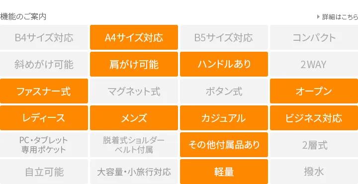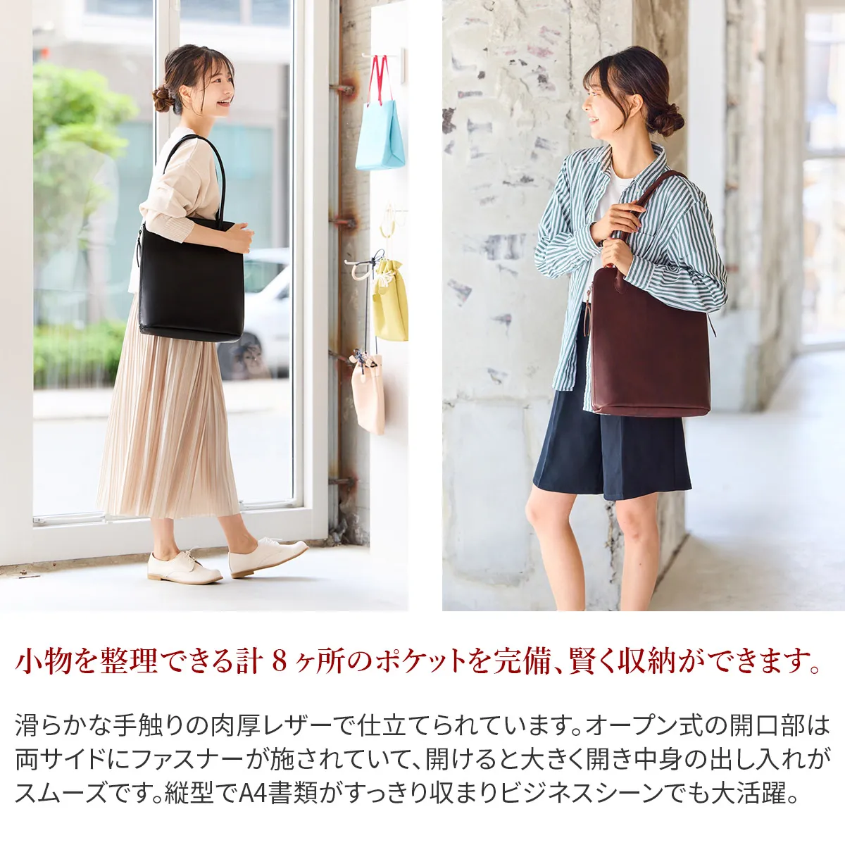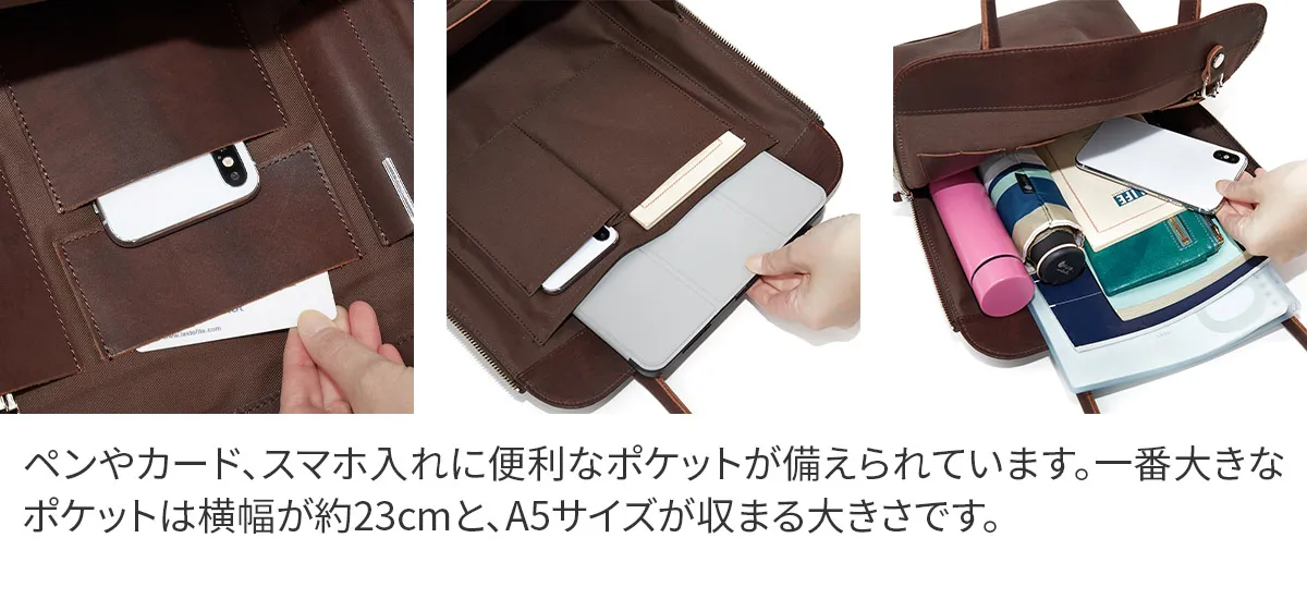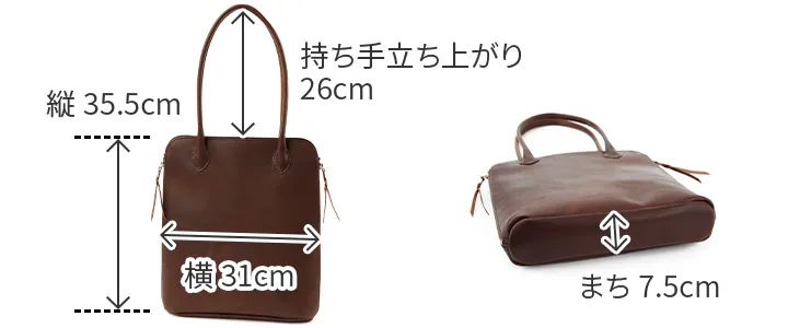 独自のオイル調整で厚みを持たせながらしなやかなレザーをつくり、表面に幾度もワックスをすり込み浸透させ、上品なツヤと深みを与えているTIDEWAYオリジナルレザーです。 《素材の特性》 ※気温が低いと、ブルームと呼ばれるワックス成分が白く浮き出てくる現象が起こる事があります。(ブラシや柔らかい布で擦るとなくなります) ※水濡れや摩擦等によって色落ち・色移りが生じる事があります。 ご使用中や保管時の洋服等への色移りには十分ご注意下さい。 両サイドのファスナーがアクセントになり、端正なデザインが印象的なA4トートバッグです。開口部はサイドと上からのどちらからでも中身へアクセスできる使い勝手の良いつくりになっています。持ち手が26cmと高めなのが特徴で、分厚いアウターでも楽々対応できるのが魅力です。内側はそれぞれ大きさの異なるオープンポケットが配置されたユニークなデザイン。全体的にすっきりとしたシルエットでオンオフ問わず活躍してくれるアイテムになっています。