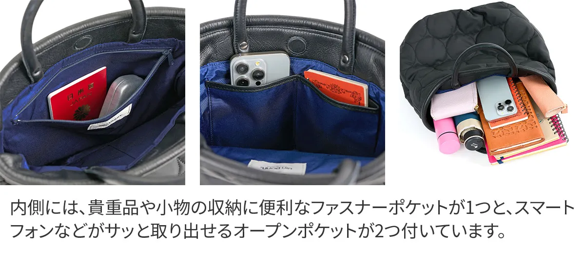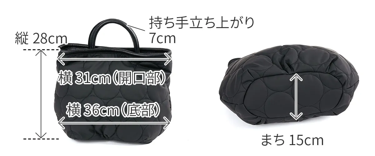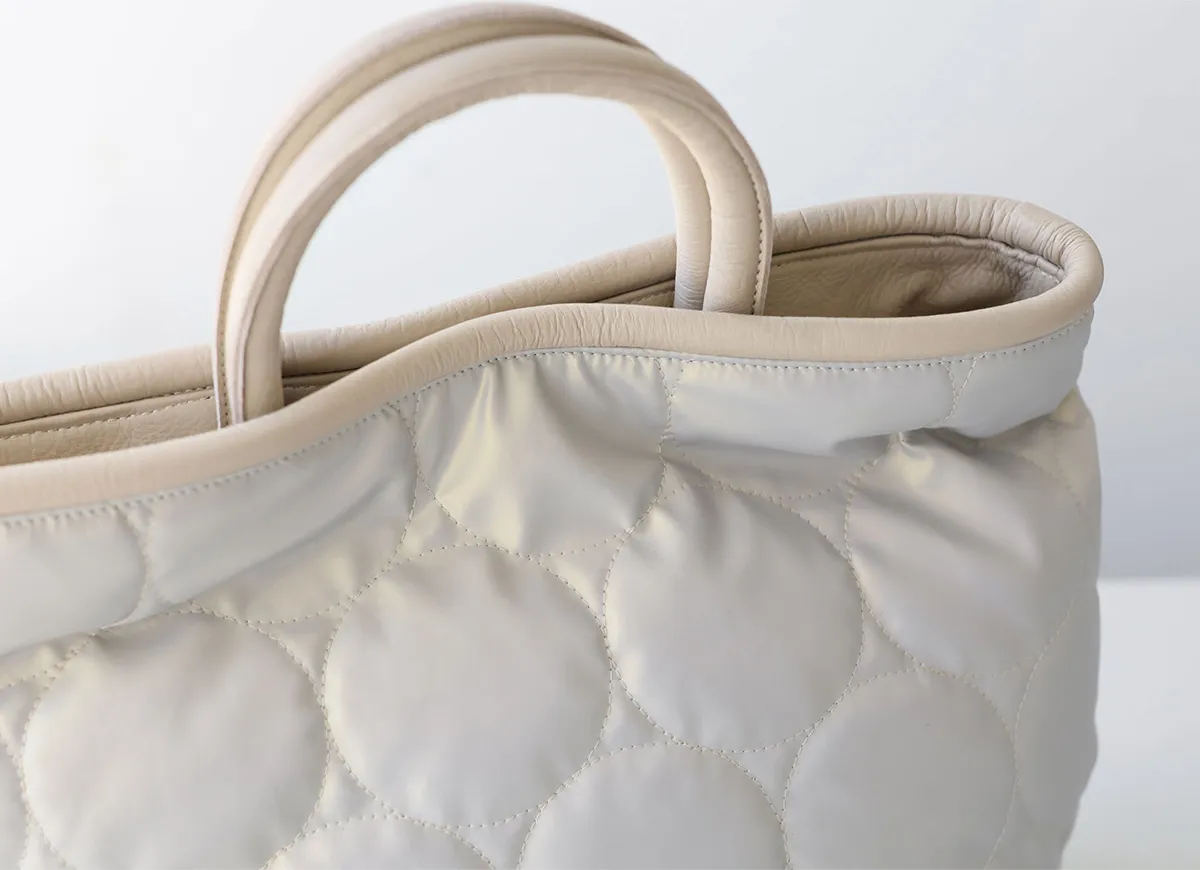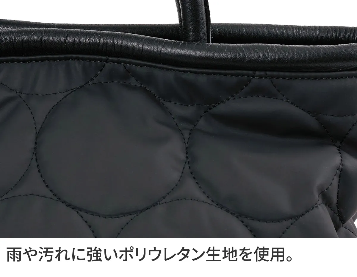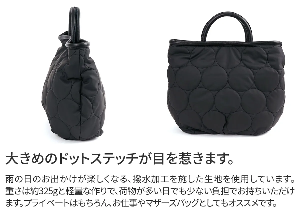 ふっくら軽やかなドットキルティングバッグシリーズ。 雨や汚れに強いラバータッチのポリウレタン生地を使用しています。 《素材の特性》 ・アルコール系や防水スプレー等の薬品を吹きかけると変色の恐れがあるので使用しないでください。 ・汚れた場合は乾いた柔らかい布か、水で濡らして強く絞ったもので、優しく拭くようにしてください。 ・状態により、色や質感など写真と多少異なる場合がございます。 ・模様の指定できません。予めご了承ください。 ・革の特性上、細かいキズ・しわ・点などが見られる場合がございますが、不良品ではございません。 マットな質感で大きめのドットステッチが目を惹く手さげバッグ。 太マチなので、お出かけに必要なものをたくさん収納できます。 持ち手部分は、牛革を使用しているため、カジュアルと上品を兼ね備えた逸品です。