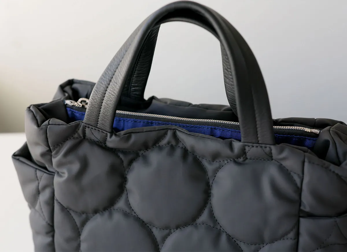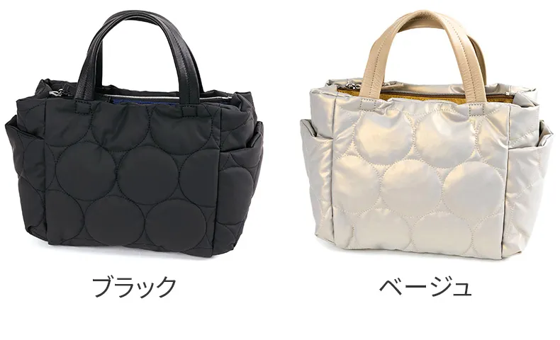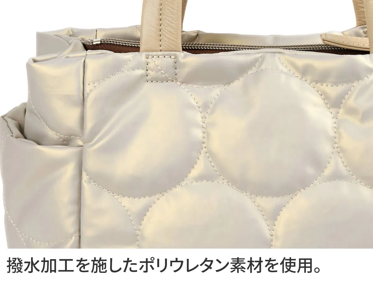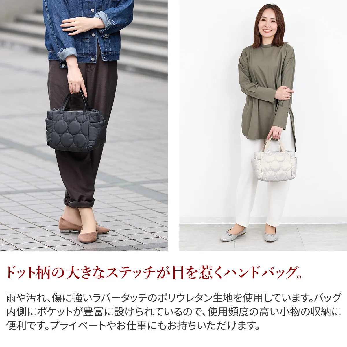 ふっくら軽やかなドットキルティングバッグシリーズ。 雨や汚れに強いラバータッチのポリウレタン生地を使用しています。 《素材の特性》 ・アルコール系や防水スプレー等の薬品を吹きかけると変色の恐れがあるので使用しないでください。 ・汚れた場合は乾いた柔らかい布か、水で濡らして強く絞ったもので、優しく拭くようにしてください。 ・状態により、色や質感など写真と多少異なる場合がございます。 ・模様の指定できません。予めご了承ください。 ・革の特性上、細かいキズ・しわ・点などが見られる場合がございますが、不良品ではございません。 マットな質感で大きめのドットステッチが目を惹く手さげバッグ。 マチがしっかりあるので、お出かけに必要なものをたくさん収納できます。 ポケット豊富に設けられているので、使用頻度の高い小物の収納に便利です。 持ち手部分は、牛革を使用しているため、カジュアルと上品を兼ね備えた逸品です。