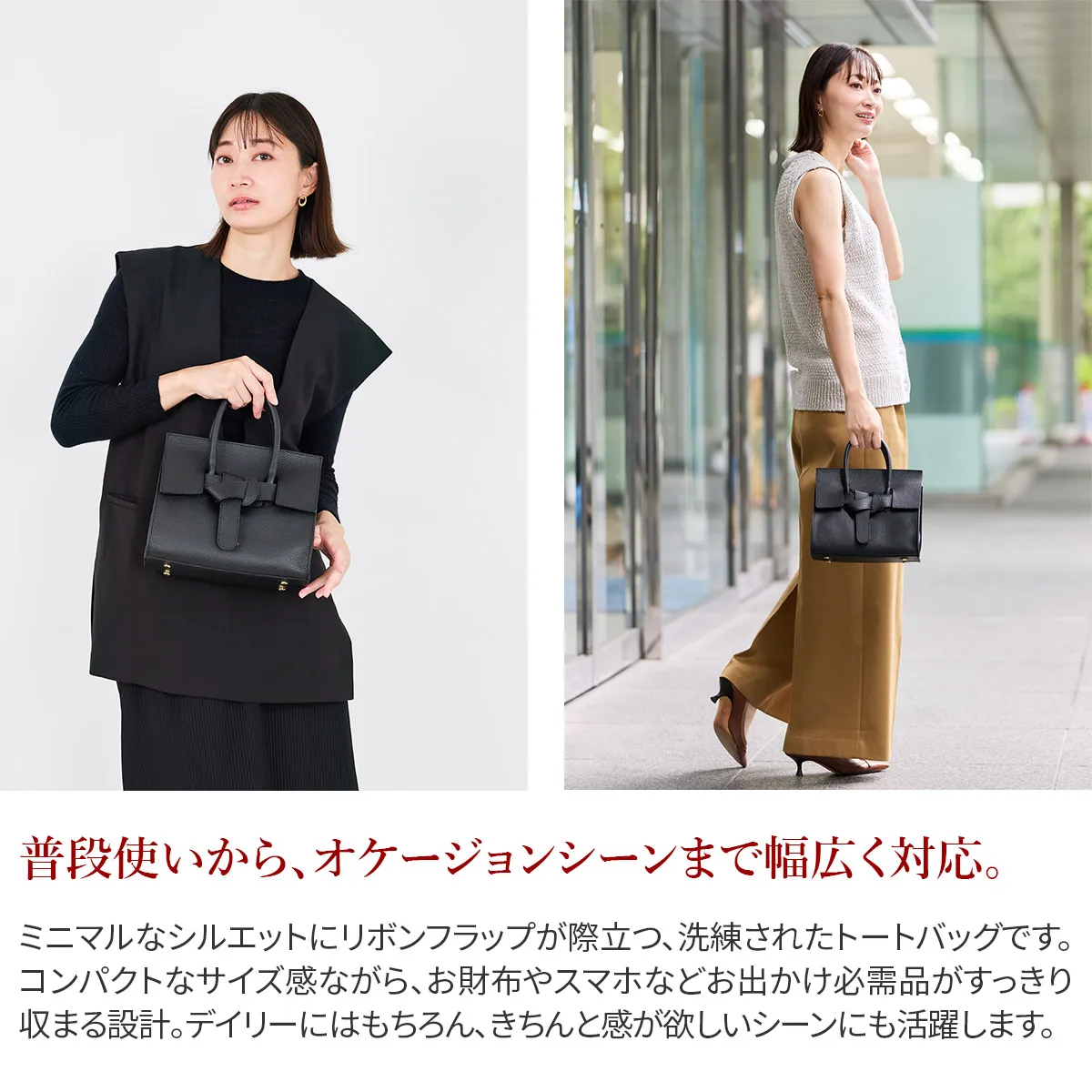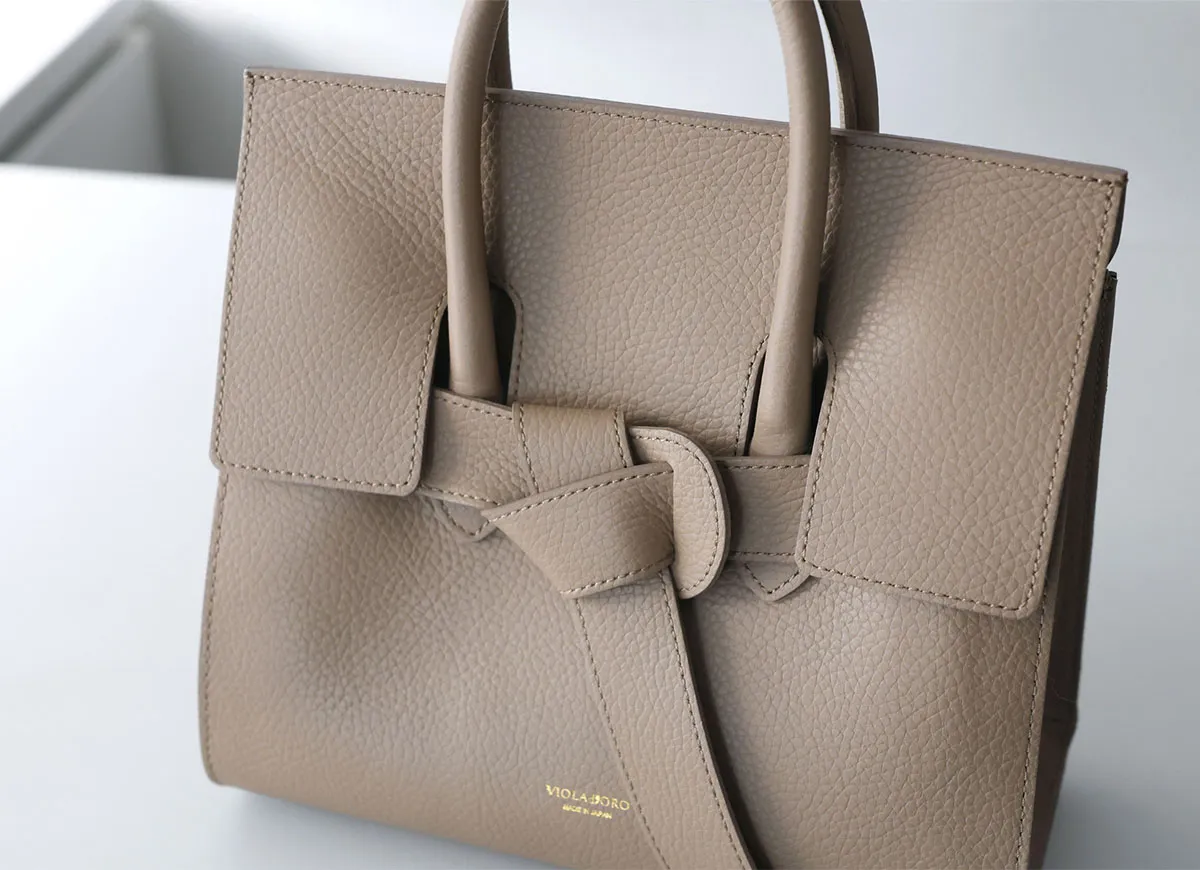 結び目のようなデザインのベルトが存在感を放つトートバッグです。 コンパクトながら長財布や500mlペットボトルが入るちょうどいいサイズ感で、休日のお出かけや街歩きにも最適。 底面には底鋲付きでバッグの傷や汚れから守り、型崩れ防止にも役立ちます。 洗練されたデザインで、カジュアルからオケージョンまで幅広いシーンで活躍します。