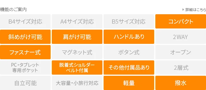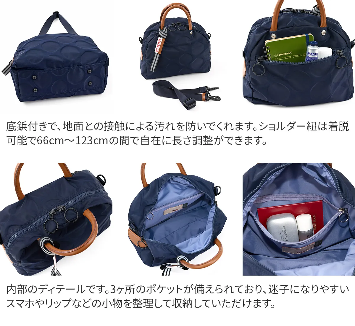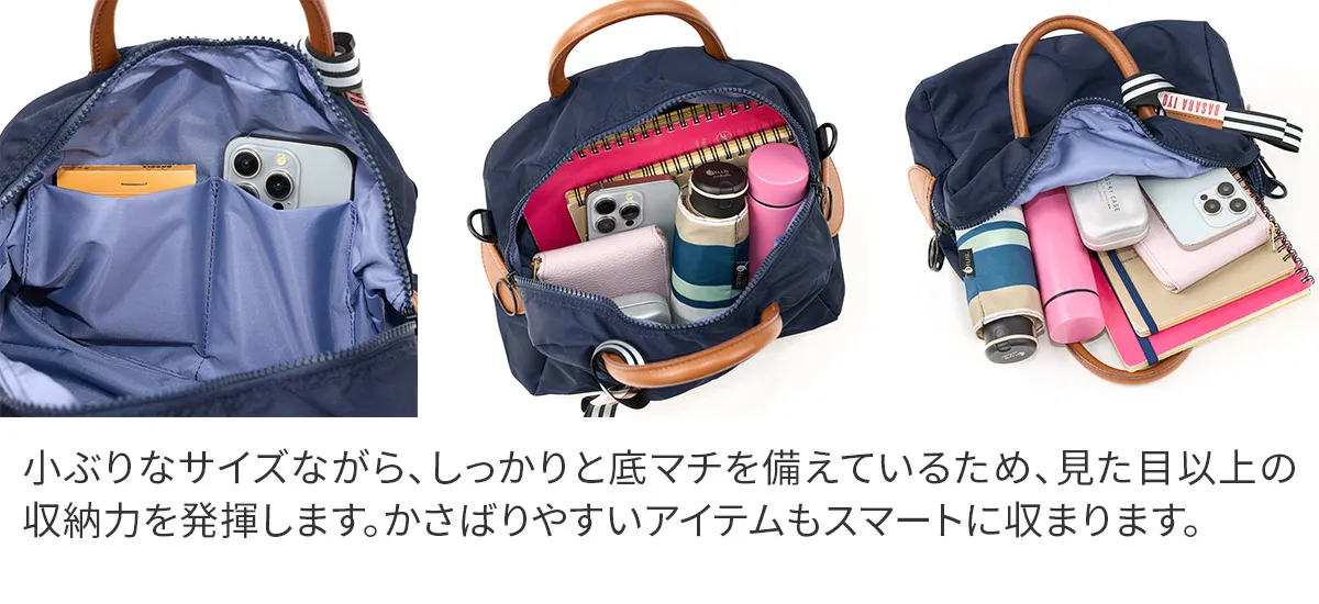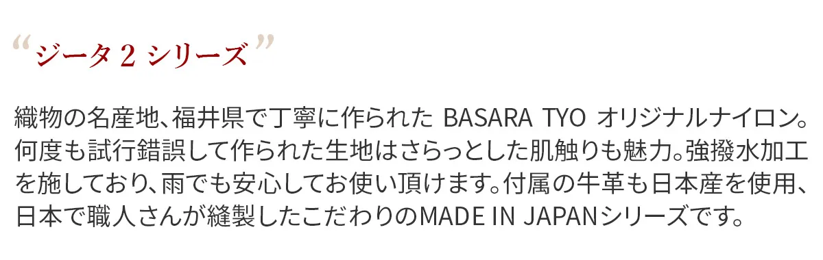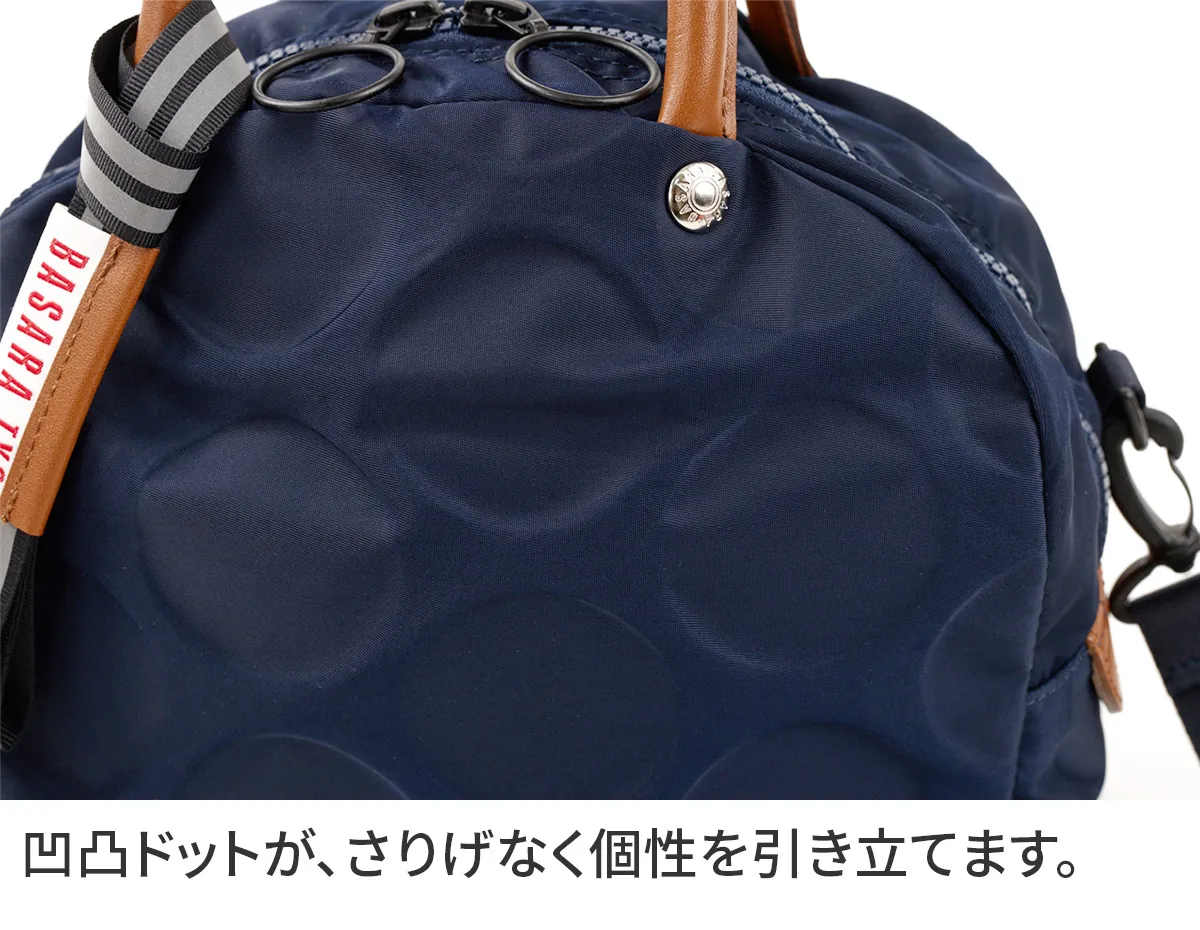 日本が誇る織物の名産地、福井県で丁寧に作られた BASARA TYO オリジナルナイロン。何度も試行錯誤して作られた生地はさらっとした肌触りも魅力。強撥水加工を施しており、雨でも安心してお使い頂けます。付属の牛革も日本産を使用、日本で職人さんが縫製したこだわりのMADE IN JAPANシリーズです。 撥水加工が施された軽量ナイロン仕立てで、日常使いにぴったりなボストンバッグ。リング仕様のダブルファスナーは、滑らかな引き心地で開閉もスムーズ。両サイドまでファスナーが伸びるため、大きく開口し、荷物の出し入れも簡単です。暗い場所でライトに反射して光るチャーム付きで、安全性を高めるとともに、バッグのアクセントとしても存在感を放ちます。