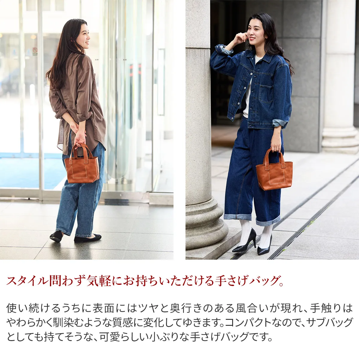 フルタンニンなめしの素上げ革を使用しています。 使った分だけ傷も日焼けもしみも付きますが、その色、ツヤが経年変化の最大の味で、世界にただ一つだけの表情になります。 使うほどに自分だけの表情が楽しめるのが魅力的ですね♪ サブバッグとしても持てそうな、可愛らしい小ぶりな手さげバッグ。 コンパクトなので、スタイル問わず気軽にお持ち頂けます。