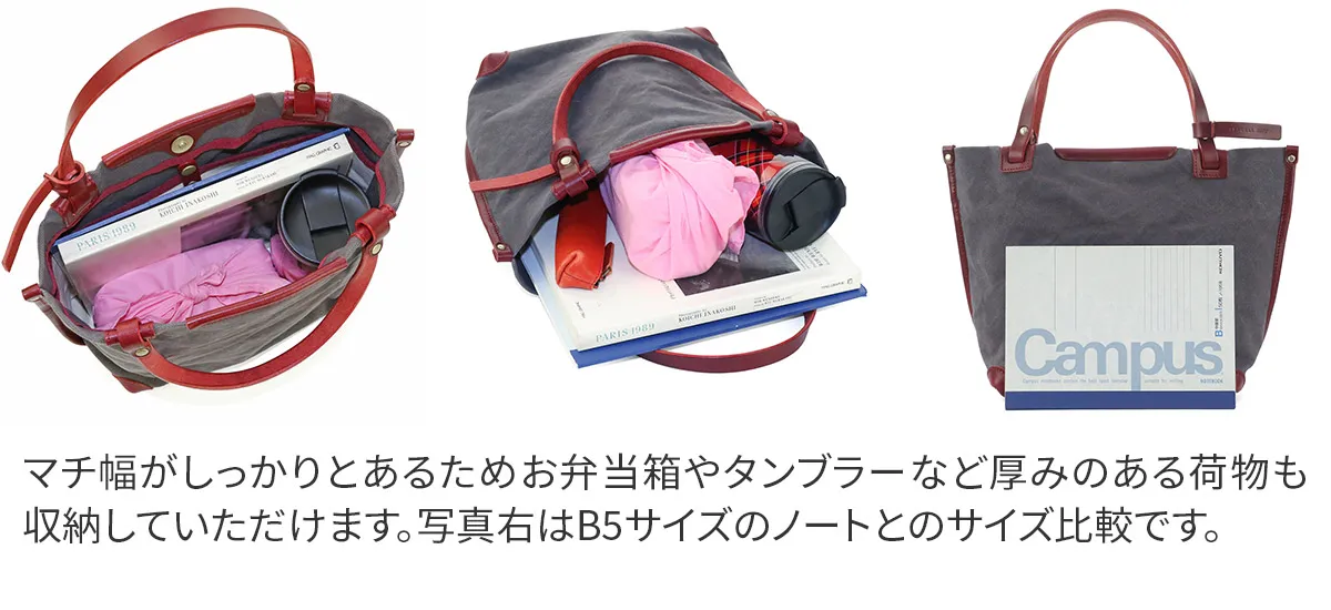 大人カジュアルなデザインで、気軽に使える帆布トートバッグ。コンパクトなサイズ感ですがまち幅がしっかりあるので、見た目以上の収納力があります。お買い物や休日のお出かけはもちろん、通勤や通学にもおすすめです。 本体生地はシーガルシップのメイン素材である、「ドゥーマンフレーバー」の防水帆布です。厚い生地の中にたっぷりと蝋が入っているので、汚れも付きにくく、水に濡れると糸が膨張するため水の侵入を防ぎます。 付属のレザーは栃木レザーで、特別に厚みがある少し柔らかいオイルスムースレザーを使用しています。