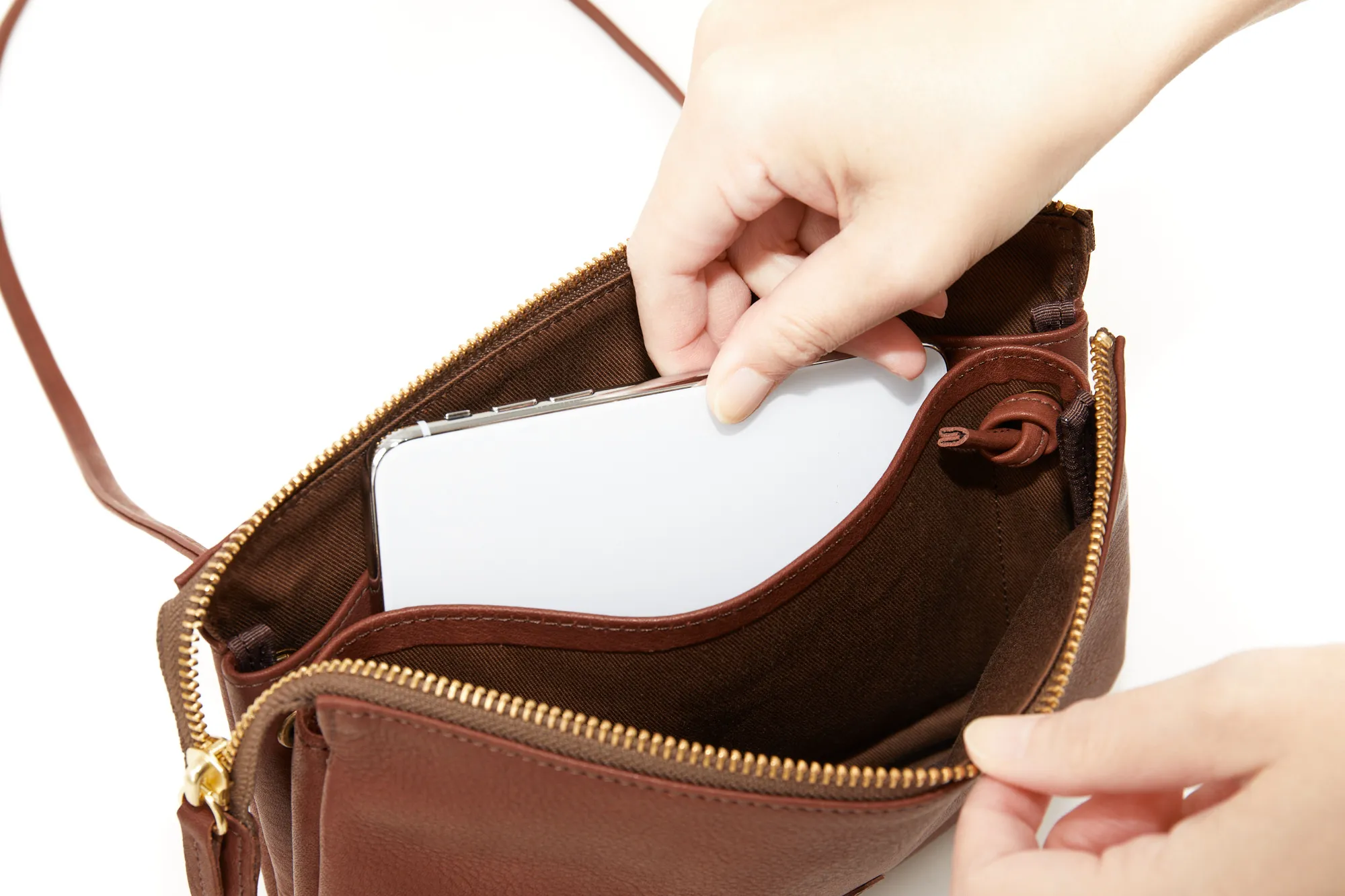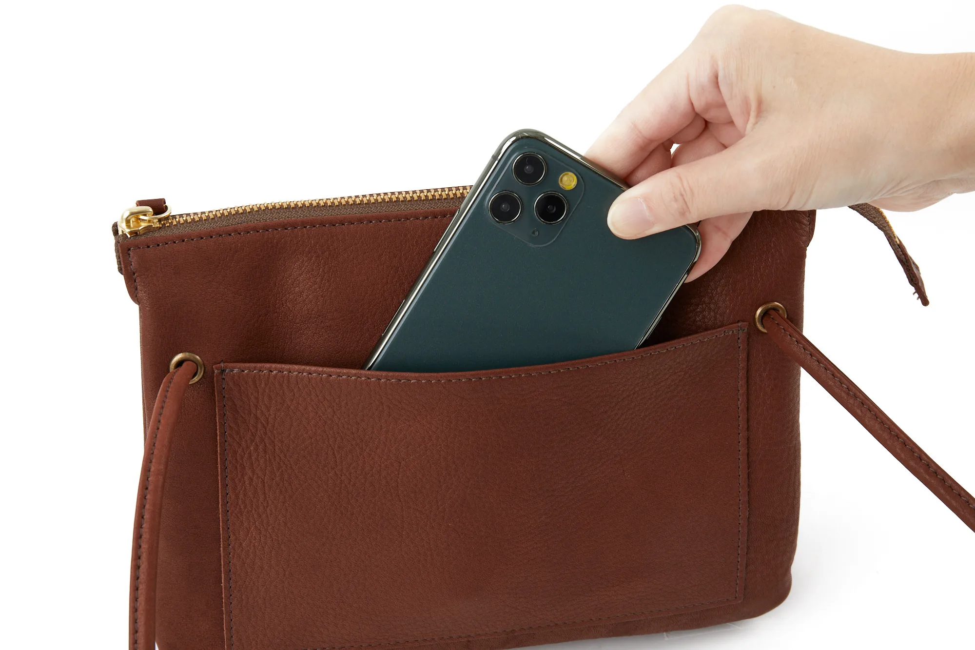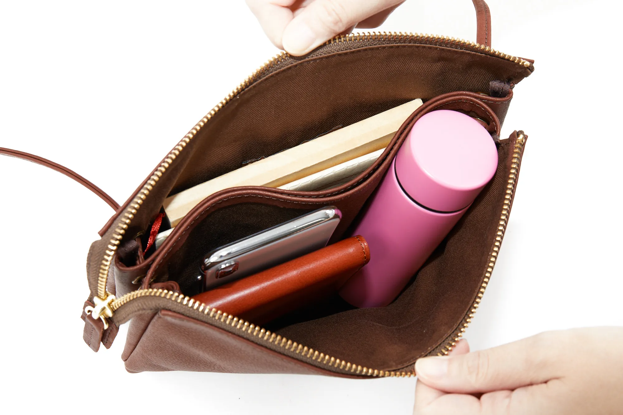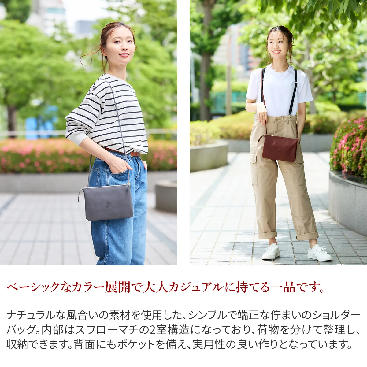 すっきりとしたシルエットで邪魔にならず、持ち運びに便利なショルダーバッグ。メイン収納部の他にあおりポケットが2ヶ所備えられており、荷物を整理して収納していただけます。ショルダーベルトは華奢で上品な印象を与えてくれる細目の仕様。レザーがしなやかで柔らかい為、肩への負担も少なくご使用いただけます。