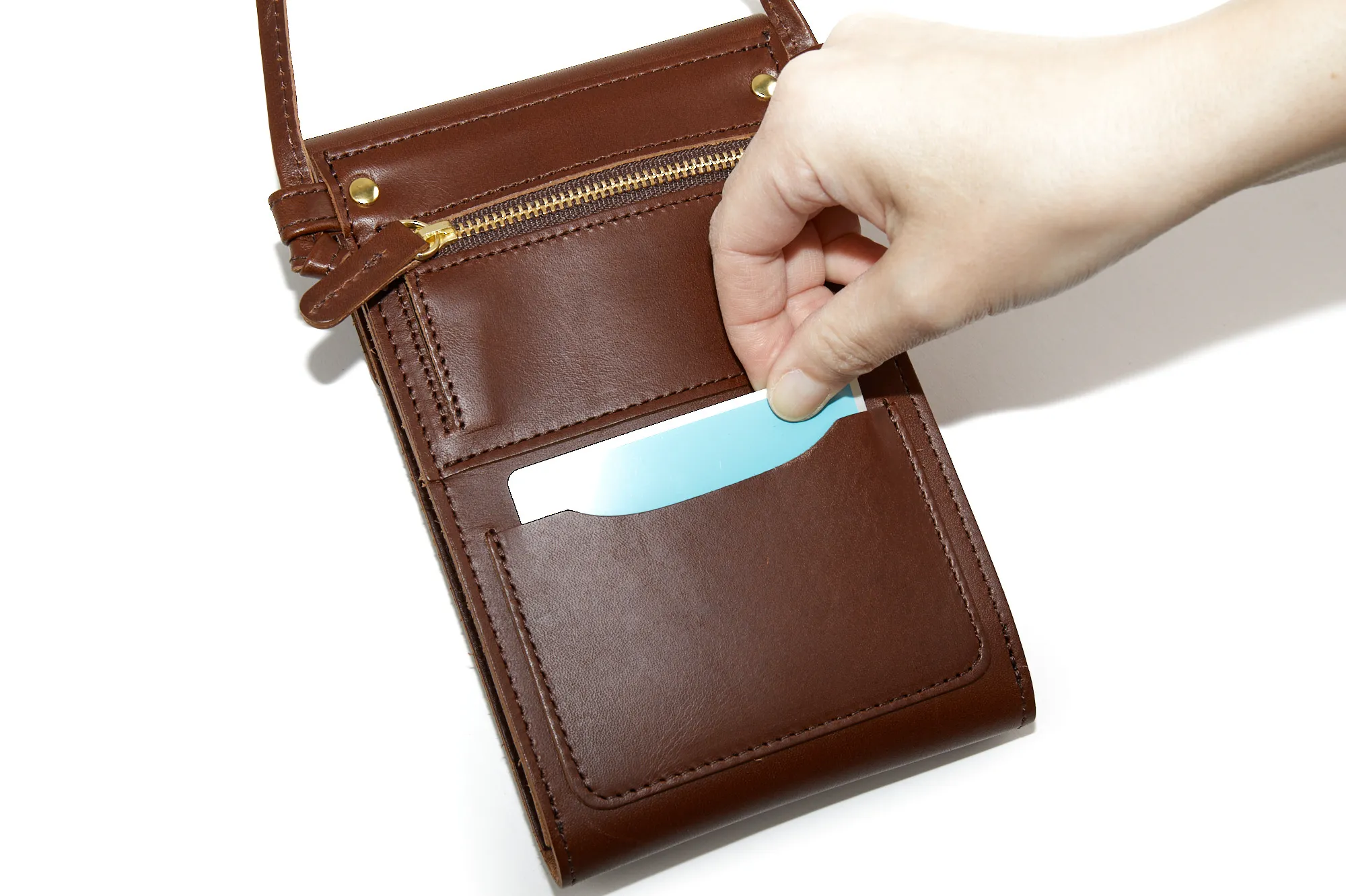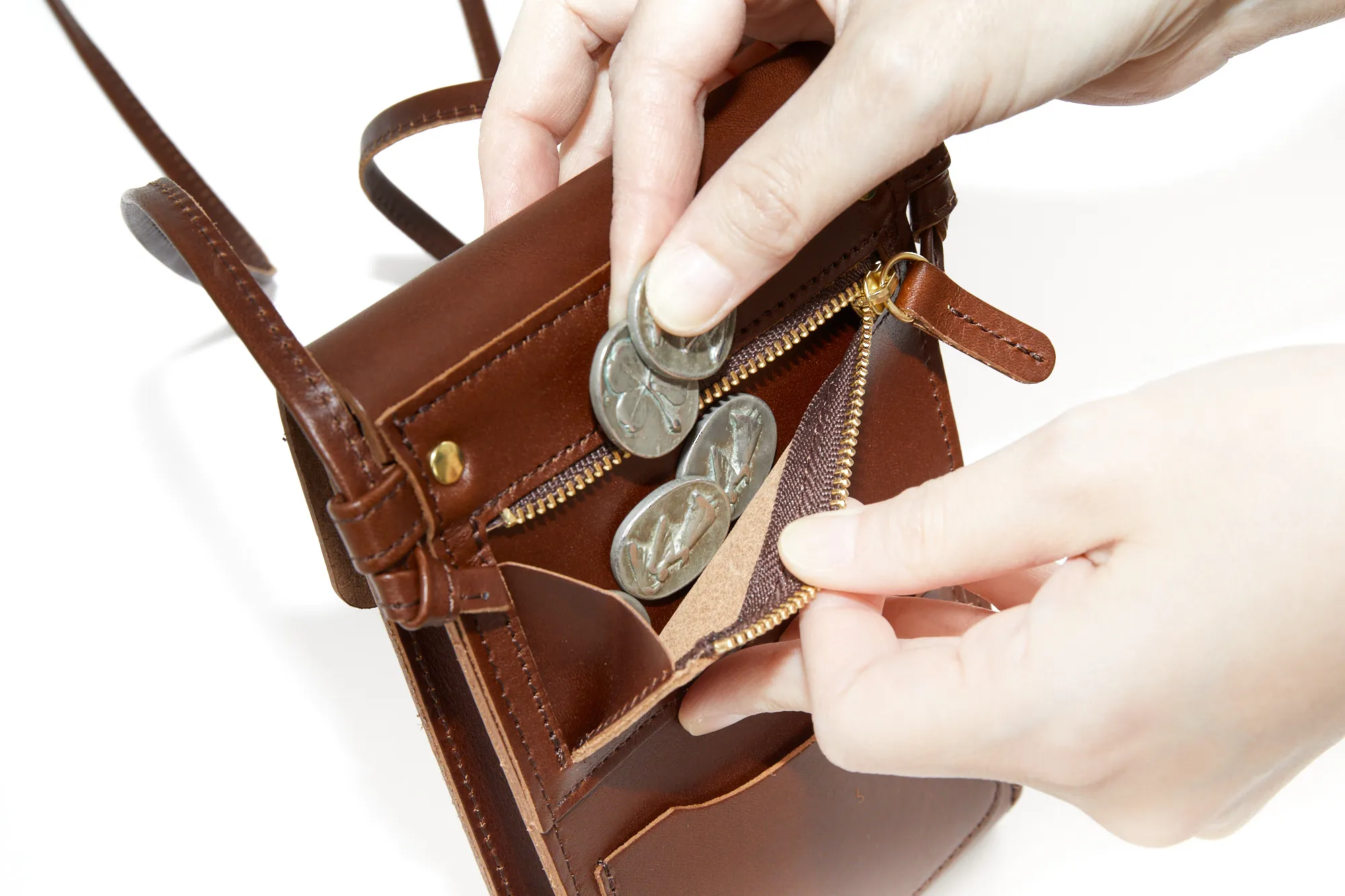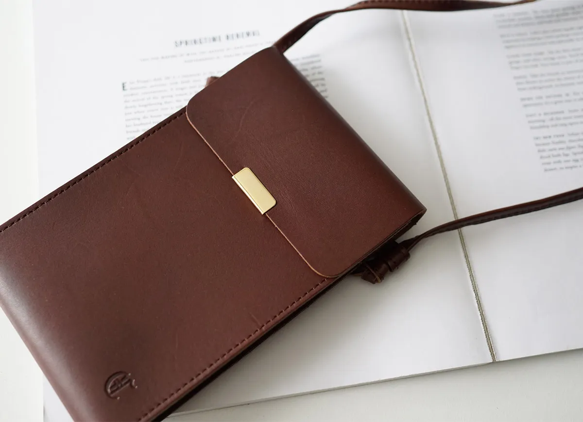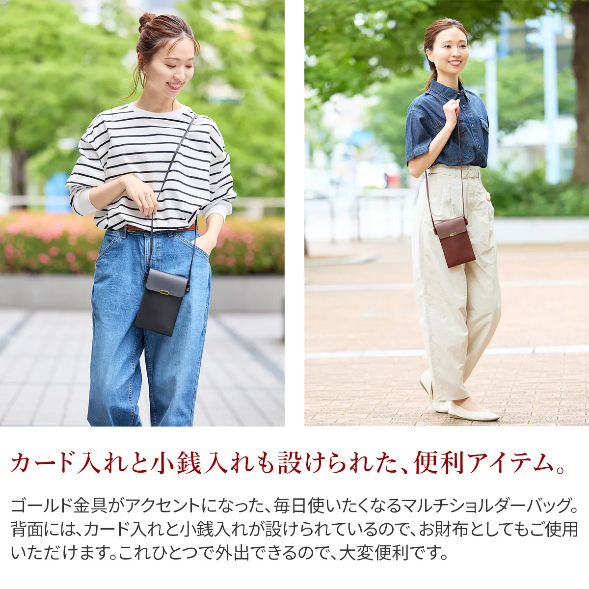 端正なスクエアフォルムが印象的なマルチショルダーバッグです。 ゴールド金具がポイントで、アクセサリー感覚としても活躍してくれるアイテムです。 スマホや必要最低限の携行品を収納できるコンパクトなサイズ感になっています。 背面にはカード入れと薄型のコインケースが備わっているので、お財布としてもご使用いただけます。 ショルダーベルトは結び目を解いて長さを調節する仕様で、最長127cmまで自由自在にアレンジが可能です。