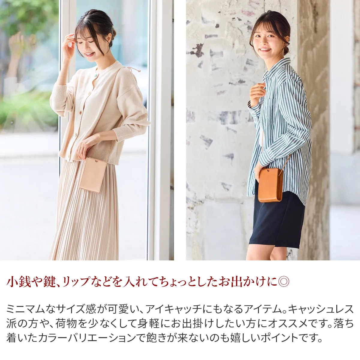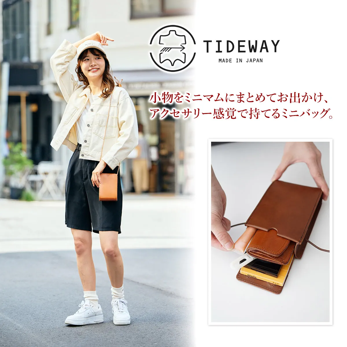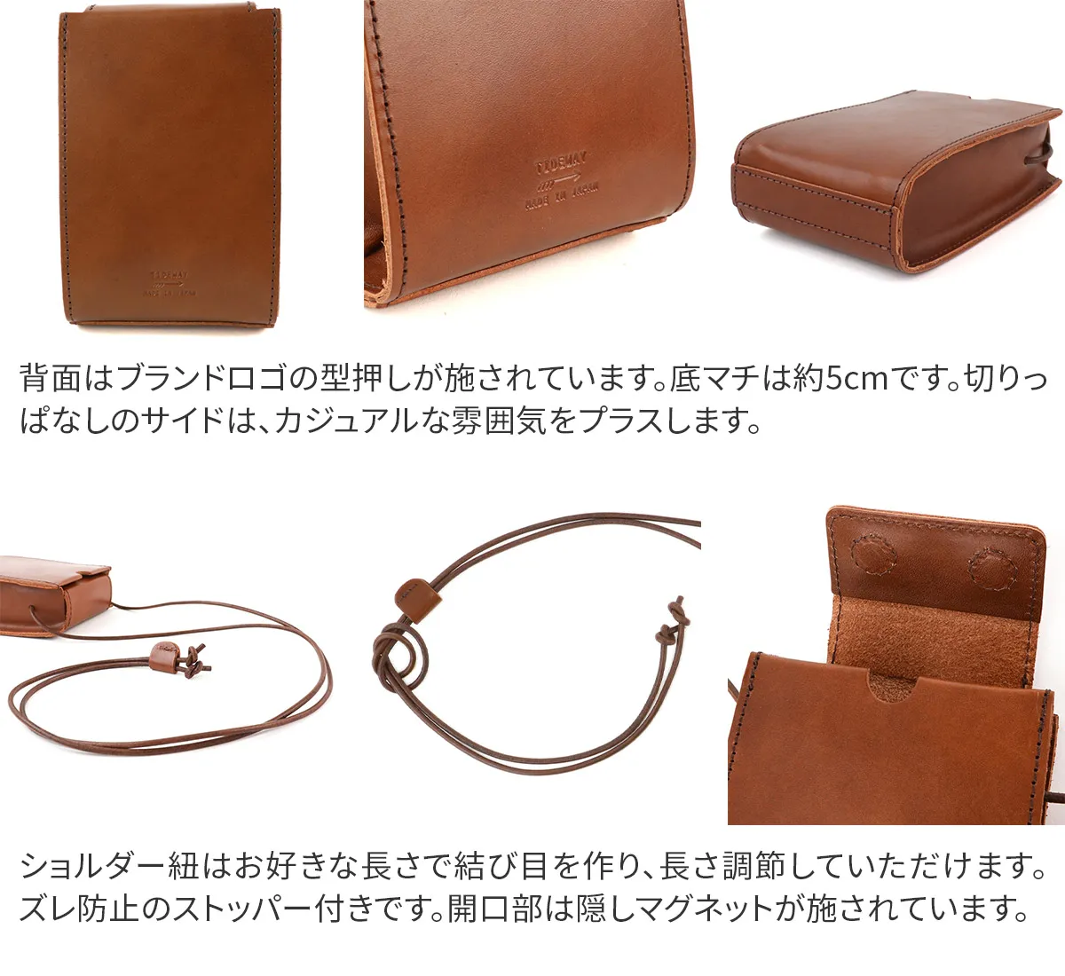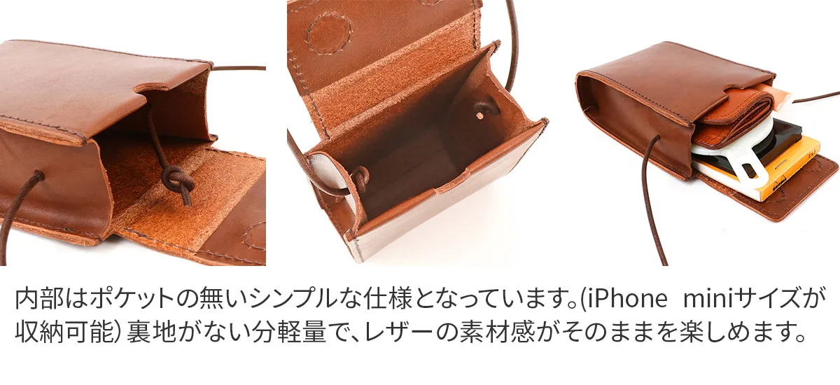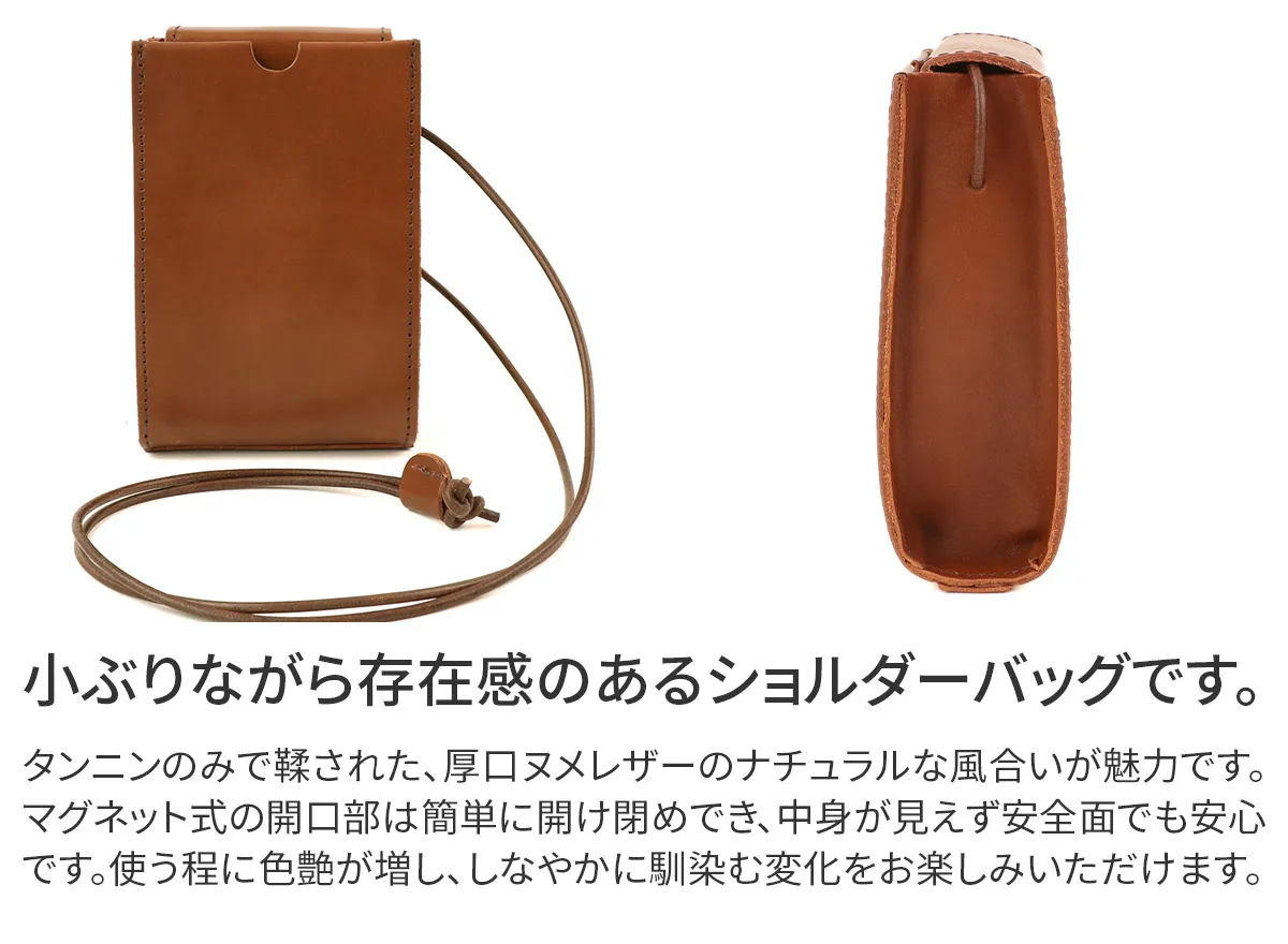 高級感のある厚口ヌメ革(タンニン鞣しを使用しただけの染色・塗装がされていない革)を使用し高い強度と長く使うほど馴染んでくるという革本来の魅力を併せ持っています。 ※カラー「NUME」は染料を一切使用せず、革本来の色味で仕上げています。 使用前は薄いベージュ色(肌色/薄ピンク色等)をしていますが、日光や摩擦により革に元々含まれる油分が染み出す事によって徐々に色艶を増し、やがて飴色へと変化していきます。革の経年変化を楽しみたい方におすすめです。(水や傷に弱いため、取り扱いにはご注意下さい。) 小ぶりなサイズ感で身軽にお出掛けができるミニショルダーバッグ。ミニサイズで、リップや鍵、鏡などお好きな小物を収納できます。メイン開口部は蓋の様な形状で、マグネットでカチッと閉まります。中が見えにくく、安全面でも安心です。使う程にしなやかに変化し、色艶が増すエイジングを楽しめます。