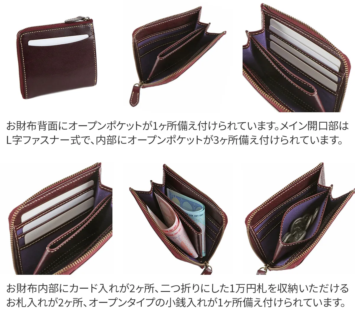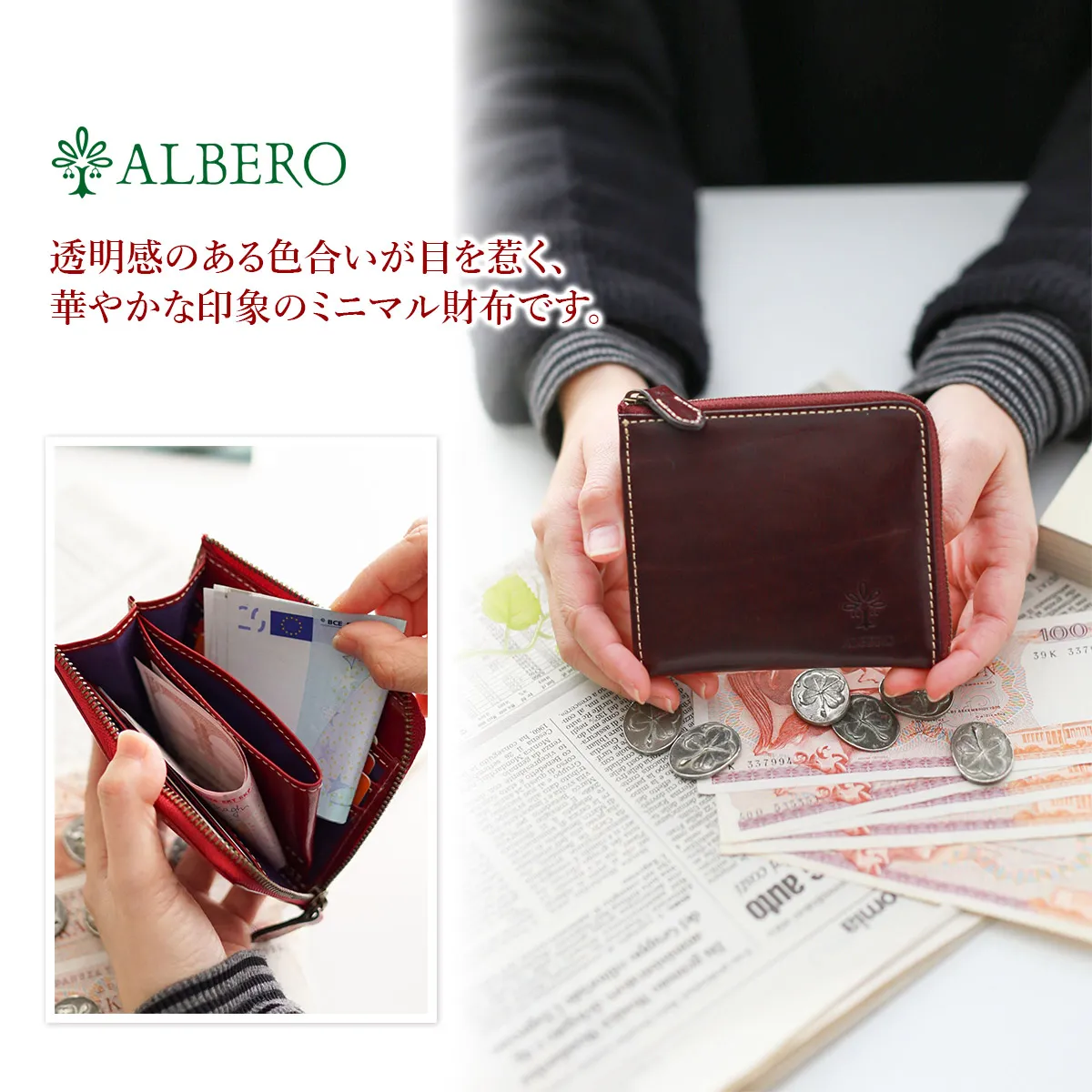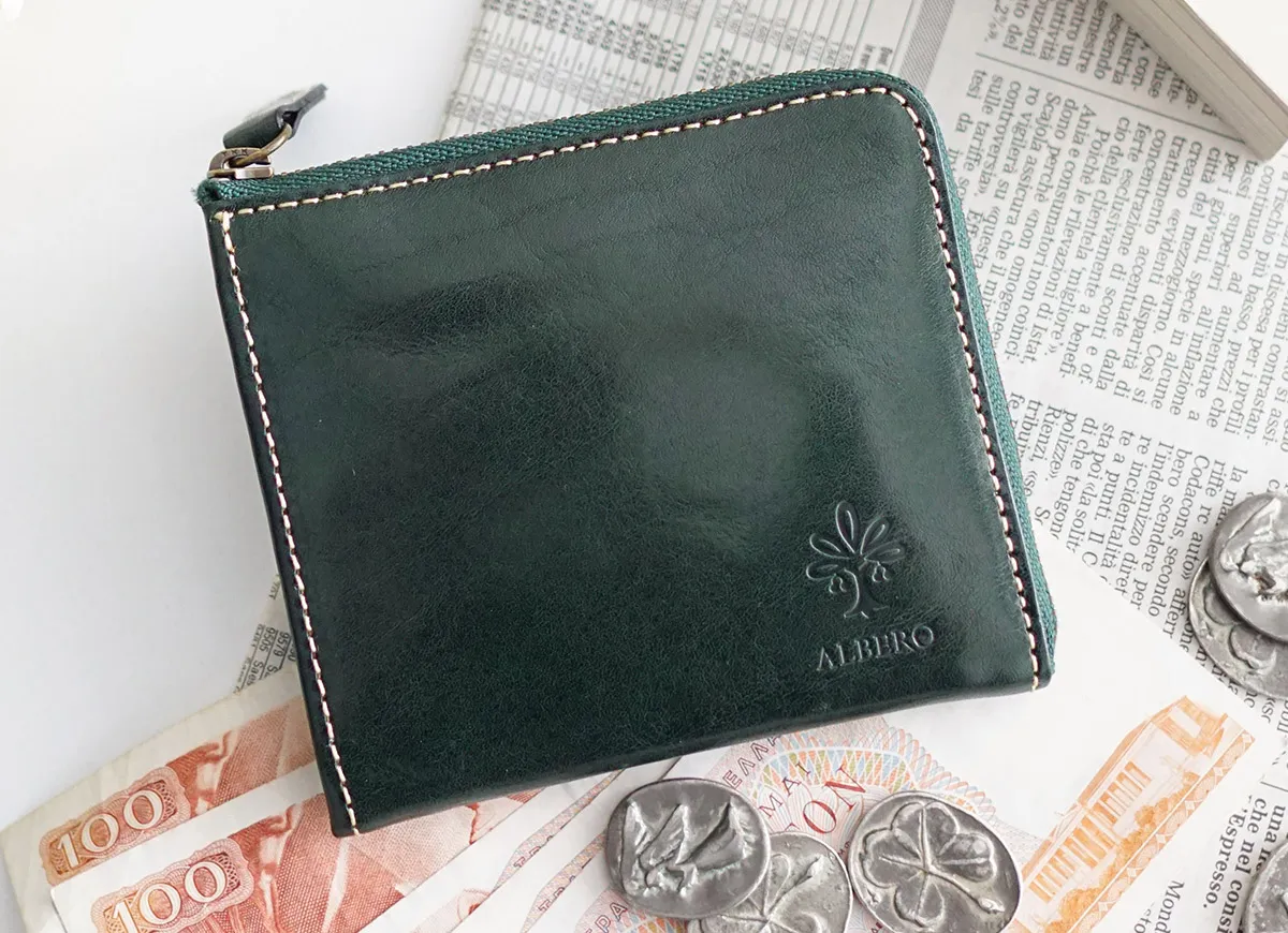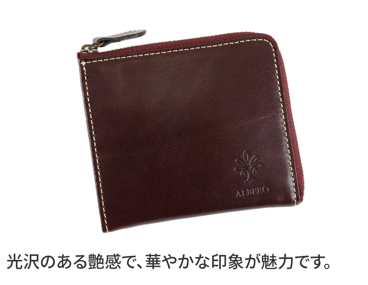 イタリア製牛革のフロント部分にタンポナートと呼ばれる手染めを施し光沢を出した素材。素材の透明感と、素材のショルダー(肩)に刻まれたトラ(シワ)が特徴。 光沢のある艶感と、革本来の表情が魅力のアイテムです。深みのある色合いで上品な印象です。薄まちのコンパクトなサイズ感で、小さなバッグやポケットにも収まります。L字ファスナー式で、ワンアクションで内部にアクセス可能です。