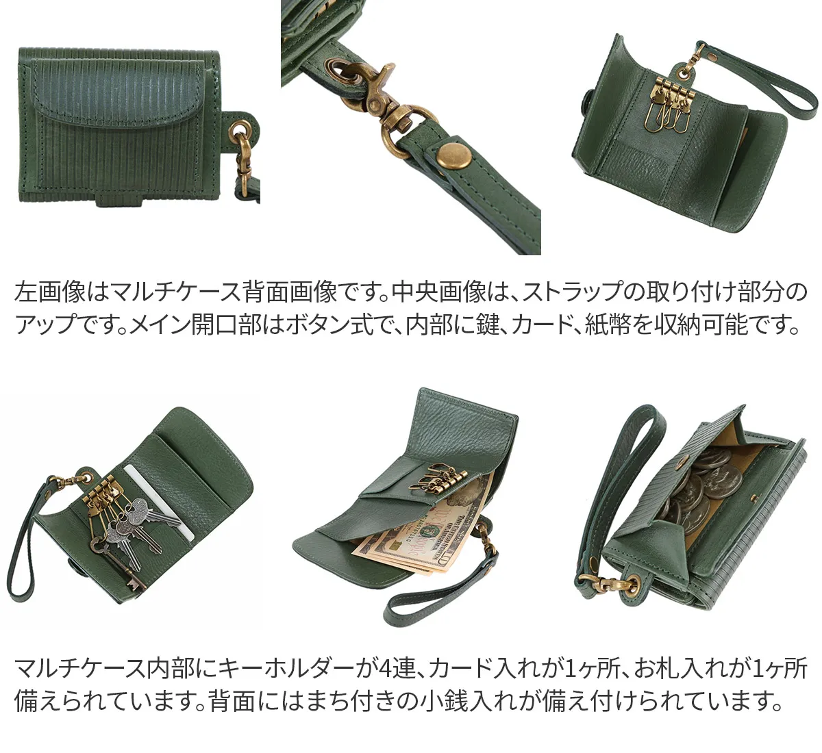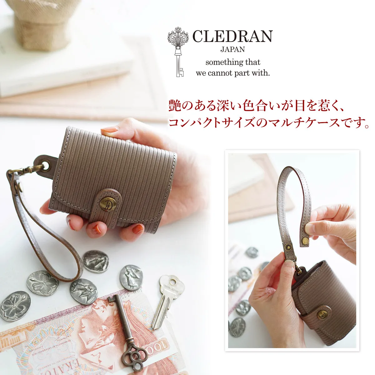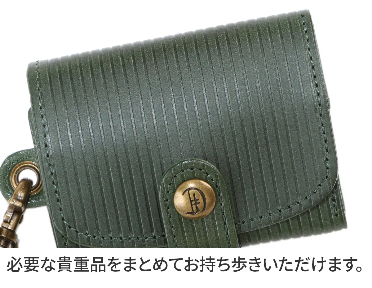 女性らしい上品なデザインと色合いが魅力で、必要な貴重品をひとつにまとめてお持ち歩きいただける、コンパクトなサイズ感が特徴のマルチケースです。ストラップ部分は取り外しが可能で、ミニマム派の方におすすめの逸品です。