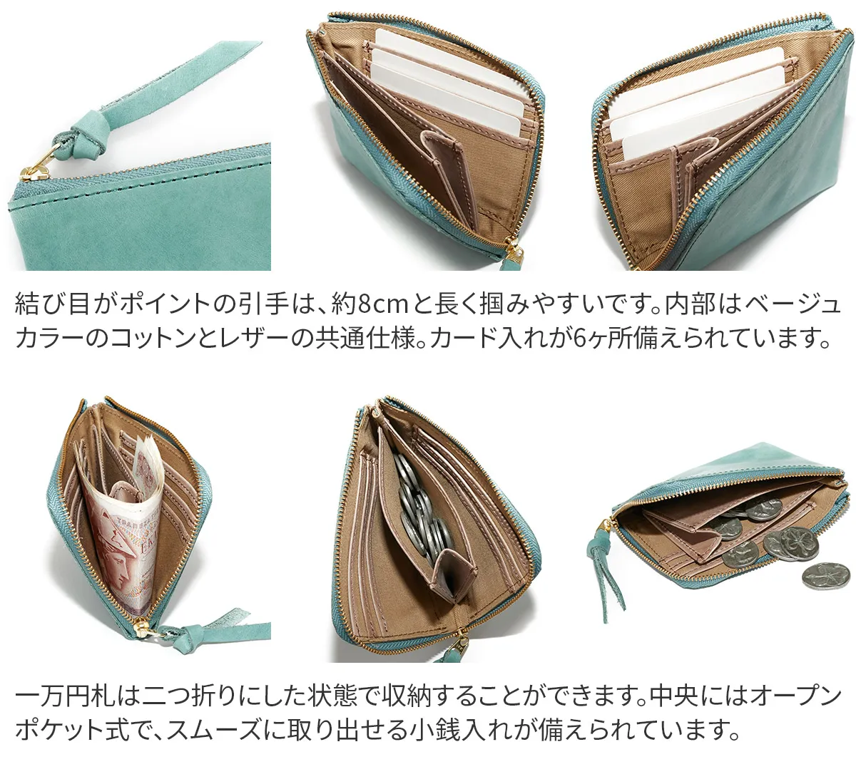 レザーの素材感や風合いを感じられるシンプルな外観に、ブランドロゴの型押しと引手が目を惹きます。L字ファスナーを開けると、左右に3ヶ所ずつカード入れが備えられています。中央のオープンポケット式の小銭入れが仕切りとなって、お札を2ヶ所に収納していただけます。ワンアクションで全てにアクセスができる、便利な仕様となっています。