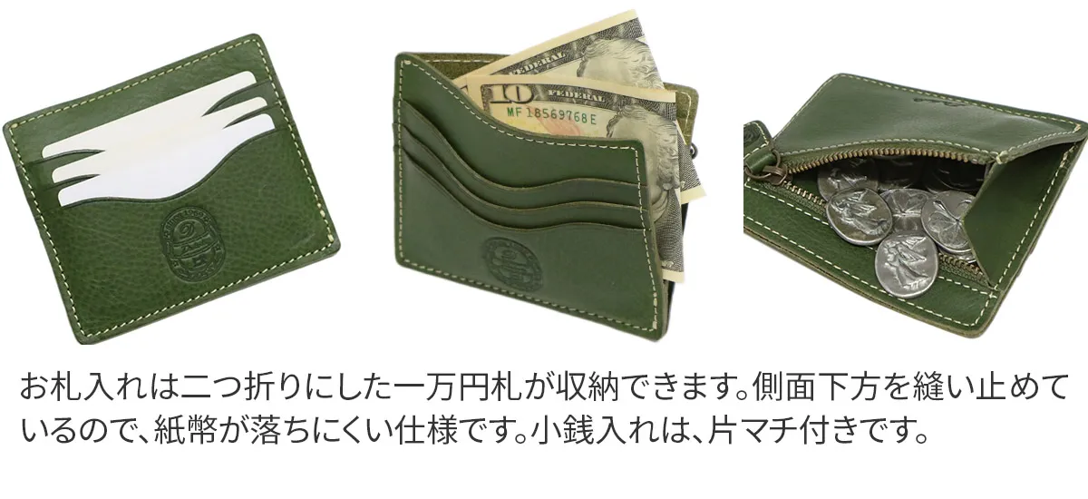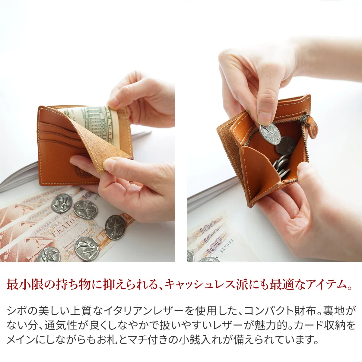 イタリア・トスカーナ州にある老舗タンナーで、じっくりと丁寧に作られたフルベジタブルタンニン鞣しの牛革を使用しています。イタリアンレザーの香りや手触り、日々使うことで馴染んでいく経年変化をより楽しんで頂けるよう、生地は使用せず中作りまで贅沢に革で仕立てました。 キャッシュレス派の方にオススメなカード収納をメインとしたミニ財布。必要最低限の貨幣入れも備わっているので、万が一の時でも安心です。荷物を少なく、身軽にお出掛けしたい時に便利です。