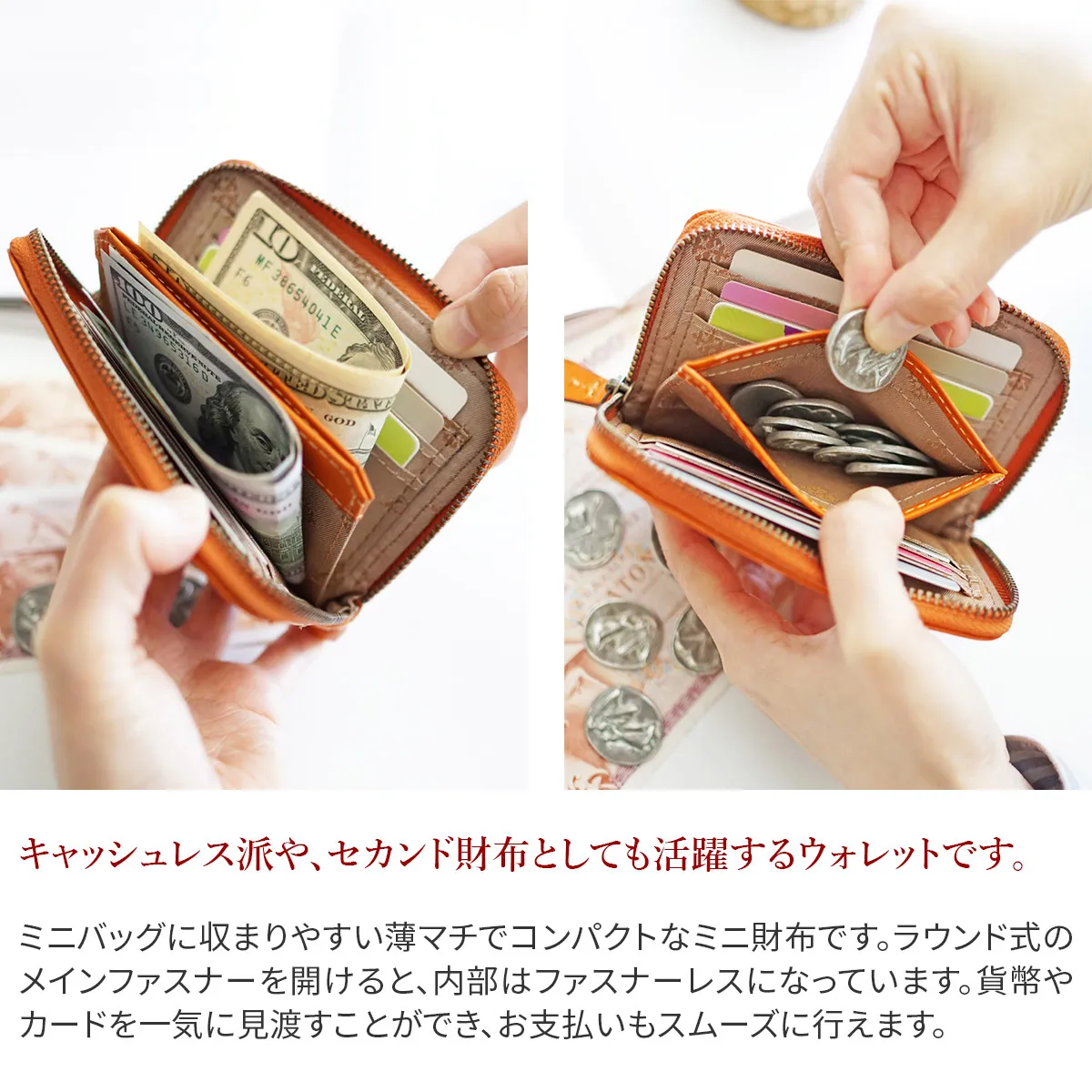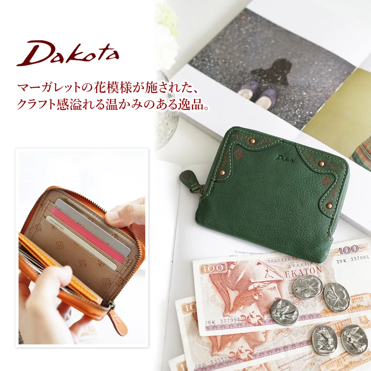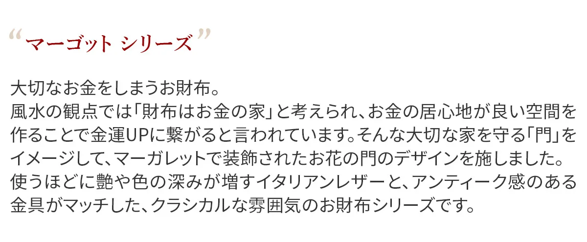 大切なお金をしまうお財布。風水の観点では「財布はお金の家」と考えられ、お金の居心地が良い空間を作ることで金運UPに繋がると言われています。そんな大切な家を守る「門」をイメージして、マーガレットで装飾されたお花の門のデザインを施しました。使うほどに艶や色の深みが増すイタリアンレザーとアンティーク感のある金具がマッチした、クラシカルな雰囲気のお財布シリーズです。 柔らかな曲線を描くカットワークとマーガレットの花模様が魅力のアイテムです。トレンドのミニマムなサイズ感ながら、カード入れが6ヶ所と貨幣入れを完備しています。荷物を減らしたい方やキャッシュレス派にもオススメです。