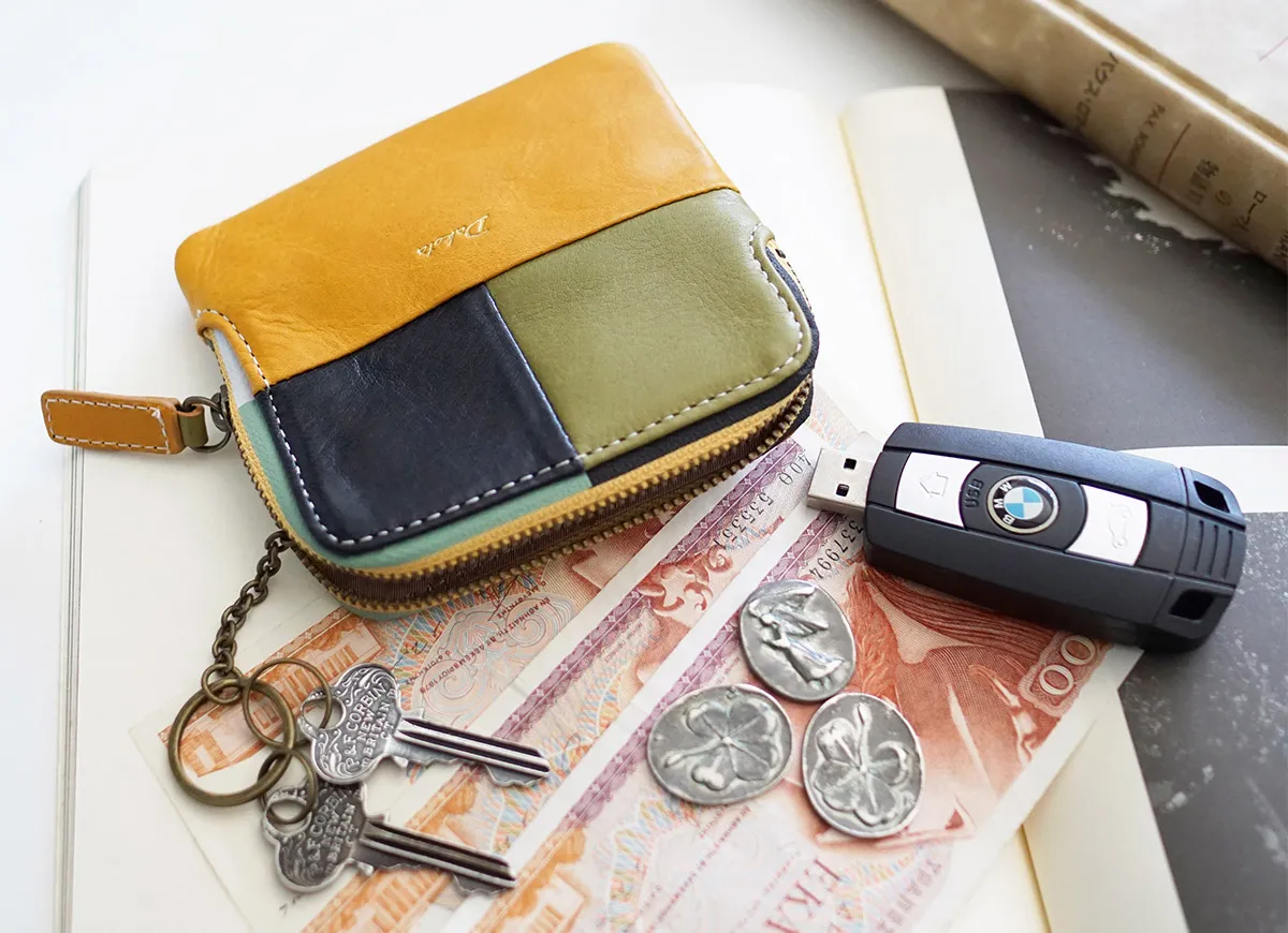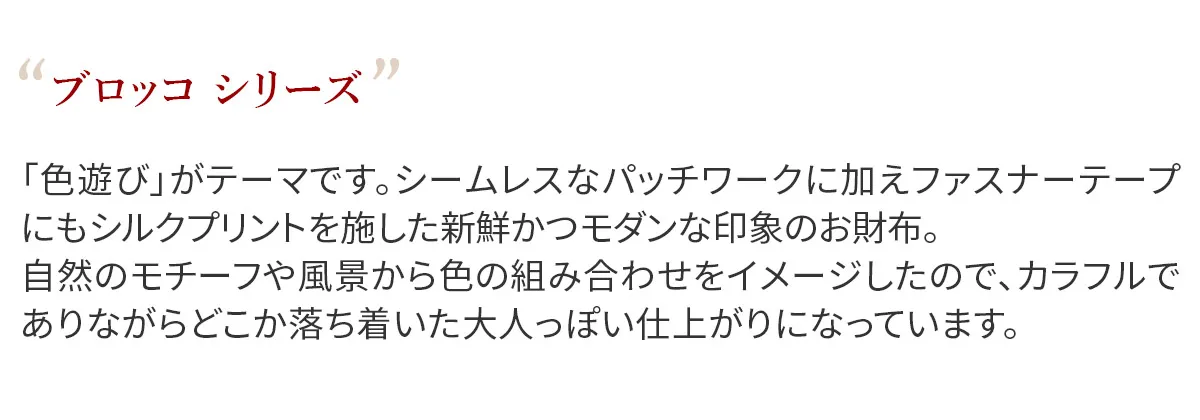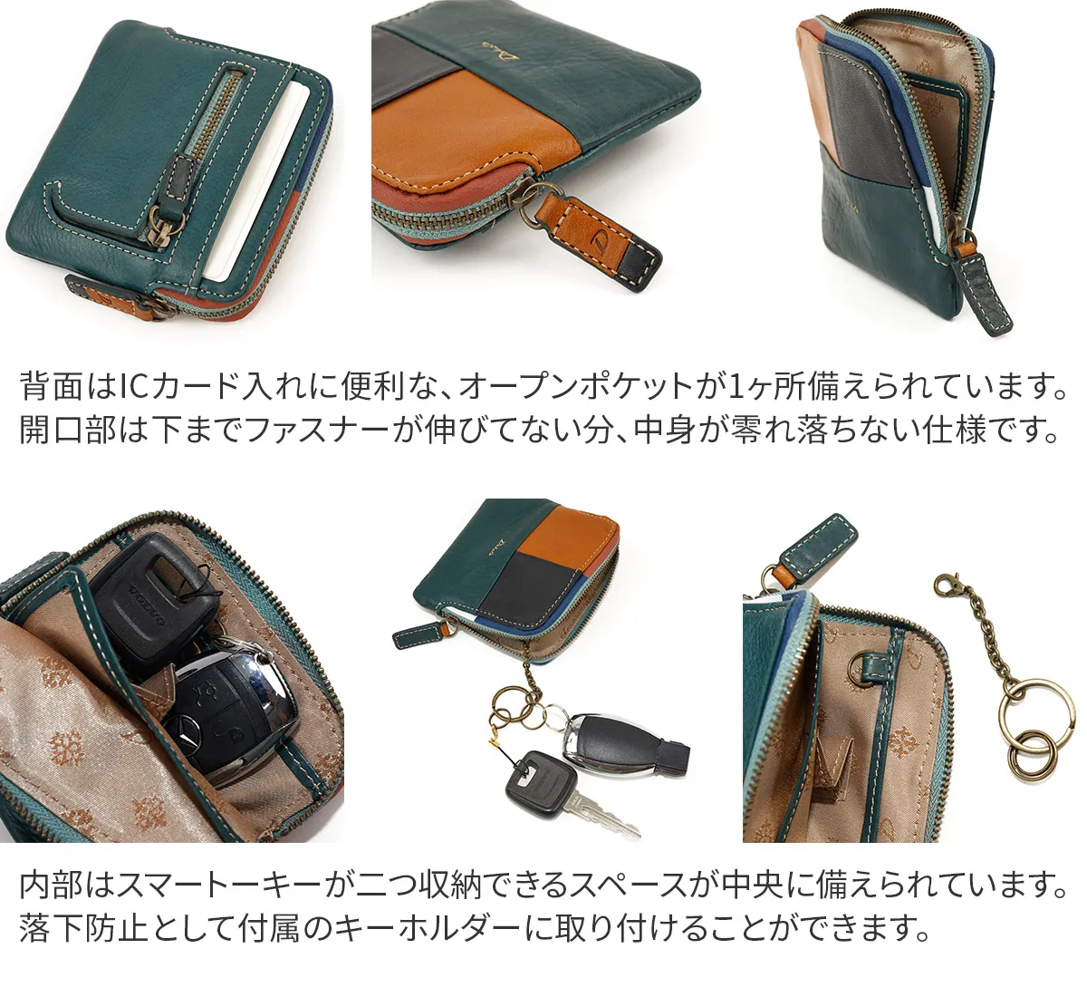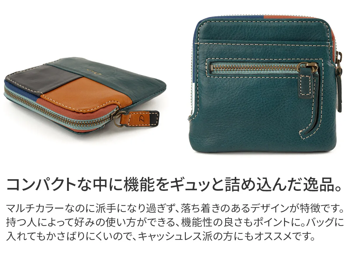 「色遊び」がテーマです。シームレスなパッチワークに加えファスナーテープにもシルクプリントを施した新鮮かつモダンな印象のお財布。自然のモチーフや風景から色の組み合わせをイメージしたので、カラフルでありながらどこか落ち着いた大人っぽい仕上がりになっています。 しっとりと手に吸い付く、しなやかな手触りが魅力のレザーを使用しています。パズルピースの様なマルチカラーの組み合わせが楽しいデザインです。スマートキー入れとキーホルダー、仕切りとポケットが備えられた色々な使い方に対応するアイテムです。