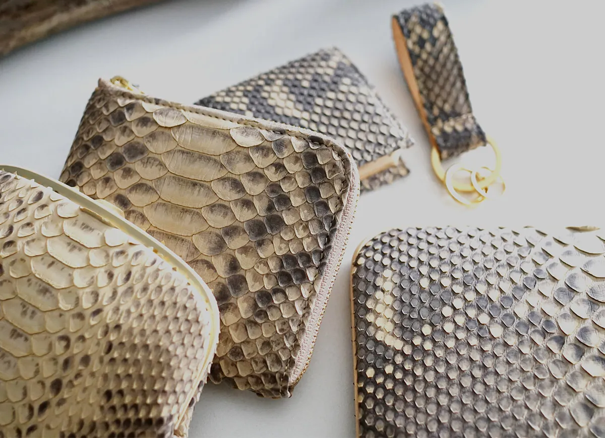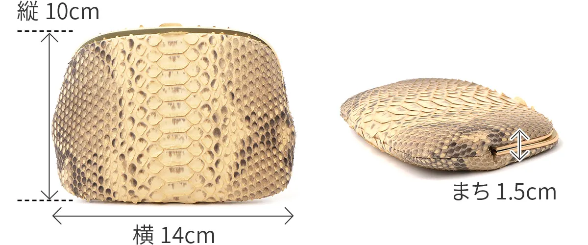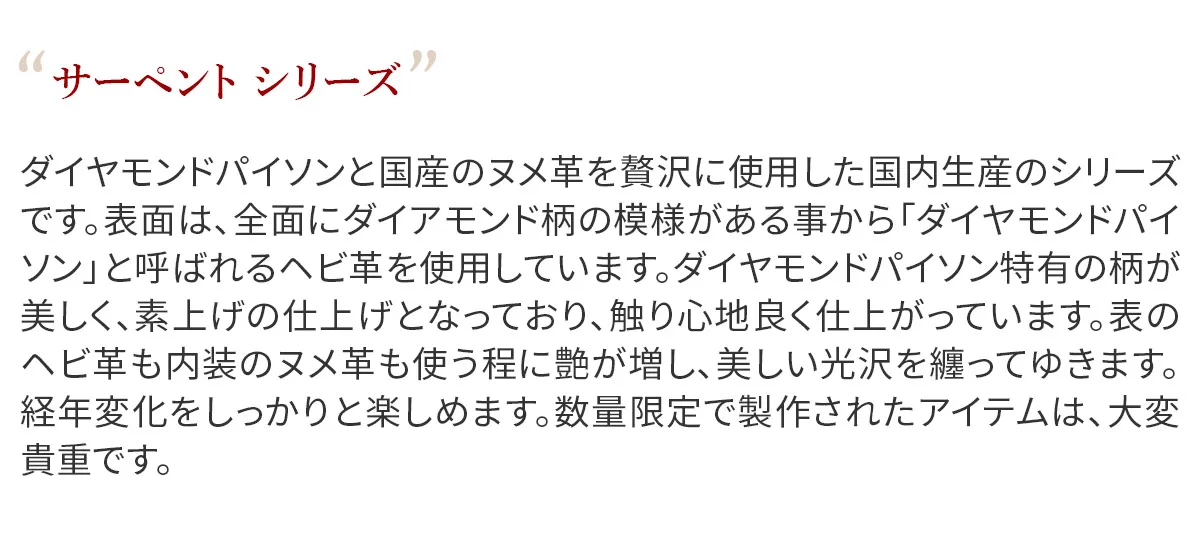 ダイヤモンドパイソンと国産のヌメ革を贅沢に使用した国内生産のシリーズです。表面は、全面にダイアモンド柄の模様がある事から「ダイヤモンドパイソン」と呼ばれるヘビ革を使用しています。ダイヤモンドパイソン特有の柄が美しく、素上げの仕上げとなっており、触り心地良く仕上がっています。表のヘビ革も内装のヌメ革も使う程に艶が増し、美しい光沢を纏ってゆきます。経年変化をしっかりと楽しめます。数量限定で製作された大変貴重なアイテムです。 がま口を開けると、中身をすぐに確認できる視認性の良い作りとなっています。薄マチながらカード入れと小銭、お札入れが分かれていて、出し入れのしやすさなど使い勝手を重視したい方にオススメです。丁度良い容量で、荷物を少なく身軽に出かけたい時に便利なアイテムとなっています。