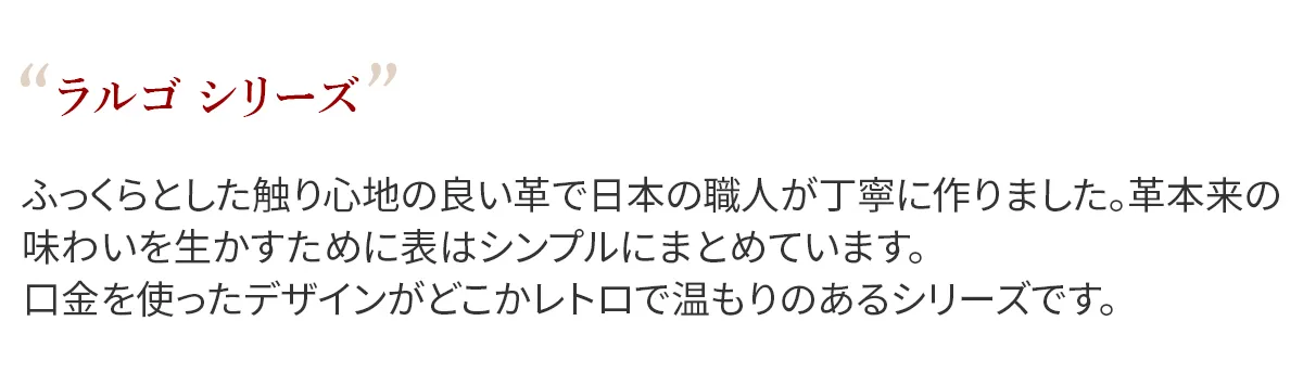 ふっくらとした触り心地の良い革で日本の職人が丁寧に作りました。革本来の味わいを生かすために表はシンプルにまとめています。口金を使ったデザインがどこかレトロで温もりのあるシリーズです。手の中に納まるコンパクトなサイズ感ですが、紙幣やカードもしっかりと収納できる実用性の高いウォレットです。