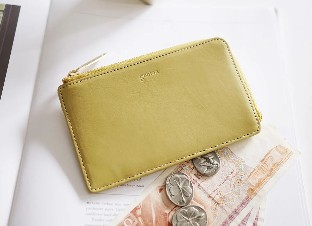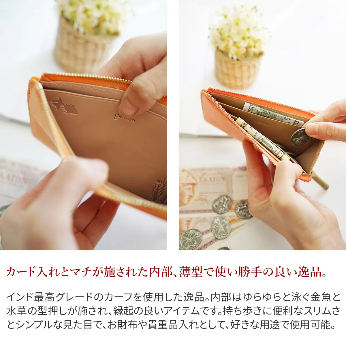 ラッキーモチーフをそっと忍ばせる福財布の新シリーズです。 今回のモチーフは、「金魚と水草」~ゆらゆらと優雅にダンスするように泳ぐ1匹の更紗琉金が、住処である水草へと向かっている様を素押しで表現しています。金魚は金運アップの象徴とされており、金魚のゆっくりとした泳ぎ方も風水的に縁起が良いとされています。また、中国語で「金魚」はお金が余るという意味の「金余」や、お金が意のままになるという意味の「金如」と同じ(ジンユィ)発音をすることからも大変縁起物とされています。水は金運や財運に関わりが深く、金魚はゆっくりと泳ぎ回ることから水に動きを与え、腐ることのない「活水」にし、大きな波の無い安定した財運をもたらす意味も。金魚は数も重要で、風水で水を意味する1匹か、金に相性の良い6か7匹が良いとされています。 色はトレンドカラーの「ピスタチオイエロー」と、持ち主に富をもたらすと言われている「サンゴ」の2色展開です。幸運要素盛りだくさんの福財布を迎えて、今年も良い年になりますように! 〈素材の特性・メリット〉インドの最高グレードのカーフを使用。 白鞣しの下地から染色をしているため、経年しても赤味が出にくいため、色が冷めていくのが特徴。非常に軽量で滑らかな手触りをお楽しみください。内装の牛革(カーフ)はピット鞣しの素上げなので、自然な地ツヤをお楽しみください。 最低限の貨幣やカードが入るフラグメントケース。お財布以外にも貴重品入れ等、好きな用途でお使いいただけます。薄マチなので、ミニバッグやポケットにスッと入り、かさばらずに持ち運びができます。キャッシュレス派の方や、贈り物としても喜ばれる万能アイテムです。
