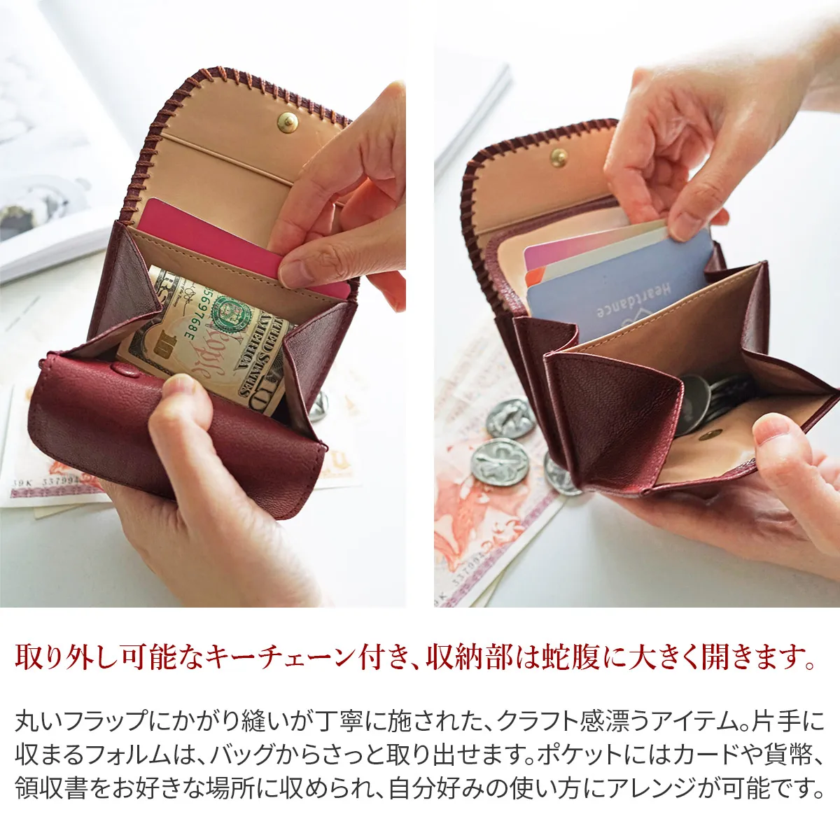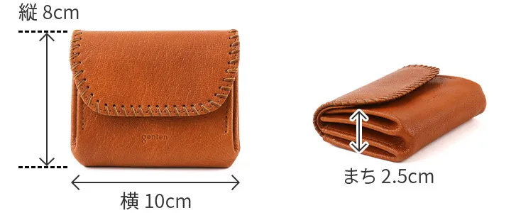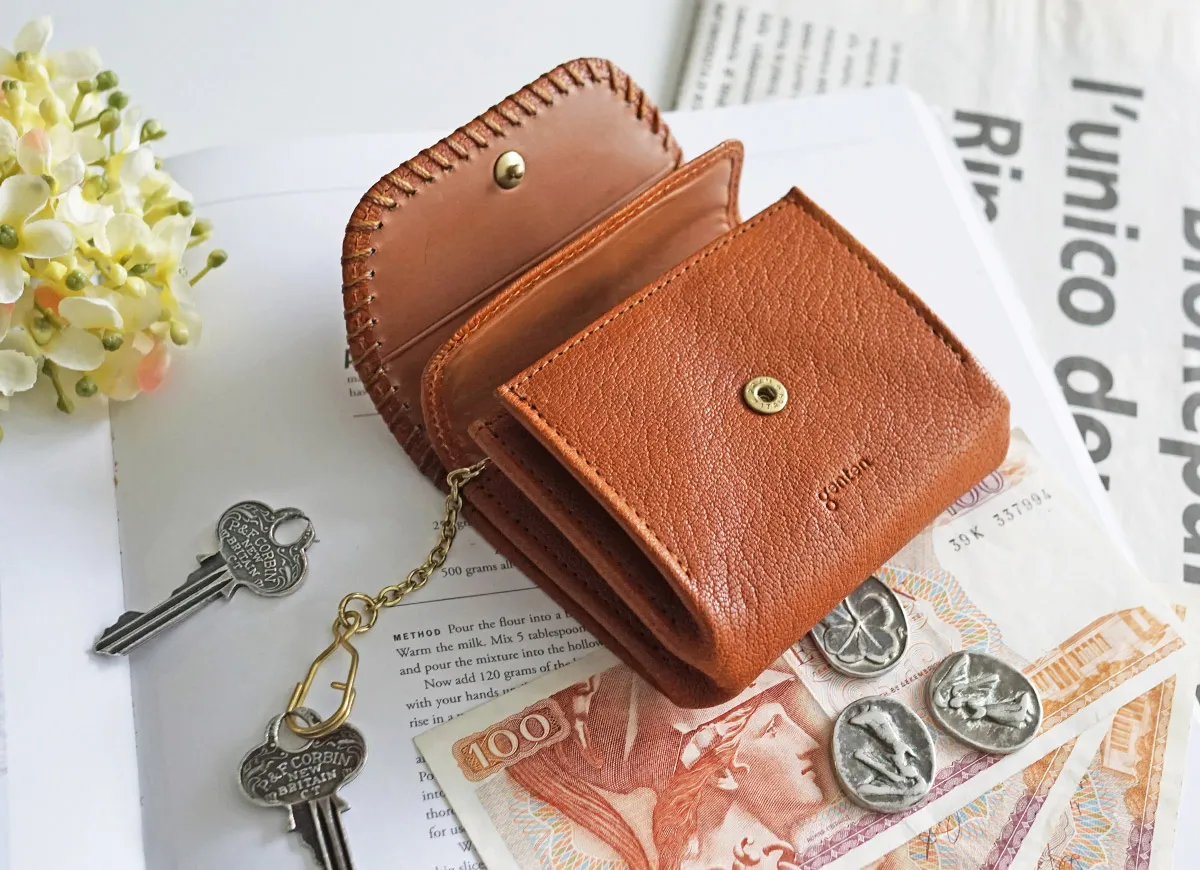Cornetto =伊で「角笛」の意。かがり糸は、革に対してあえて異素材の糸を使用することで繊細な印象のあしらいに。ひと針ひと針丁寧な手仕事で手掛るかがりは、2回づつ糸を通していることできれいに揃った仕上がりにしています。素材の柔らかさと、手仕事の温かさ、日々使いながら感じることのできる経年変化、革という素材だからこそ楽しむことのできる魅力を感じてもらえるよう作られています。 〈素材の特性・メリット〉定番ゴートベーシックで使用しているゴートを採用。軽くて丈夫な繊維、透明感のある染料仕上げ。メノウ石で磨くグレージング加工による焦げとツヤの濃淡が魅力です。 ふっくらとしたフォルムに、片手サイズで優しく手にフィットします。中には大きなマチを3つ備え、その内2つには被せがあり、小銭入れに適しています。また、キーチェーンも備えているので鍵を入れて持ち運ぶことができます。カードは数枚重ねて収納もでき、フレキシブルに対応します。