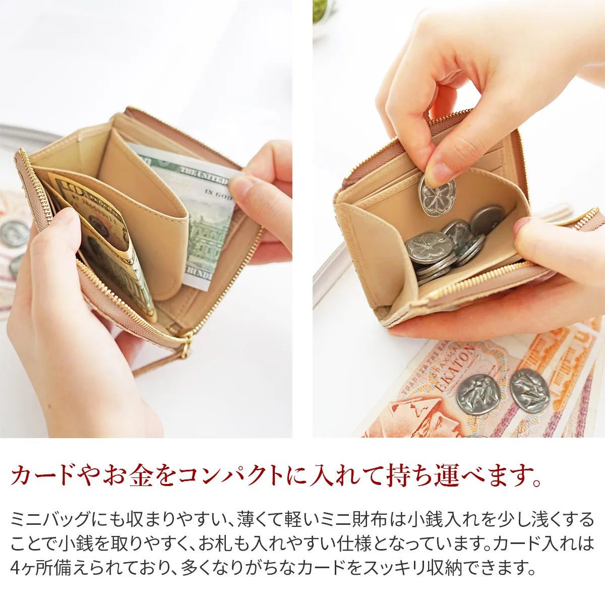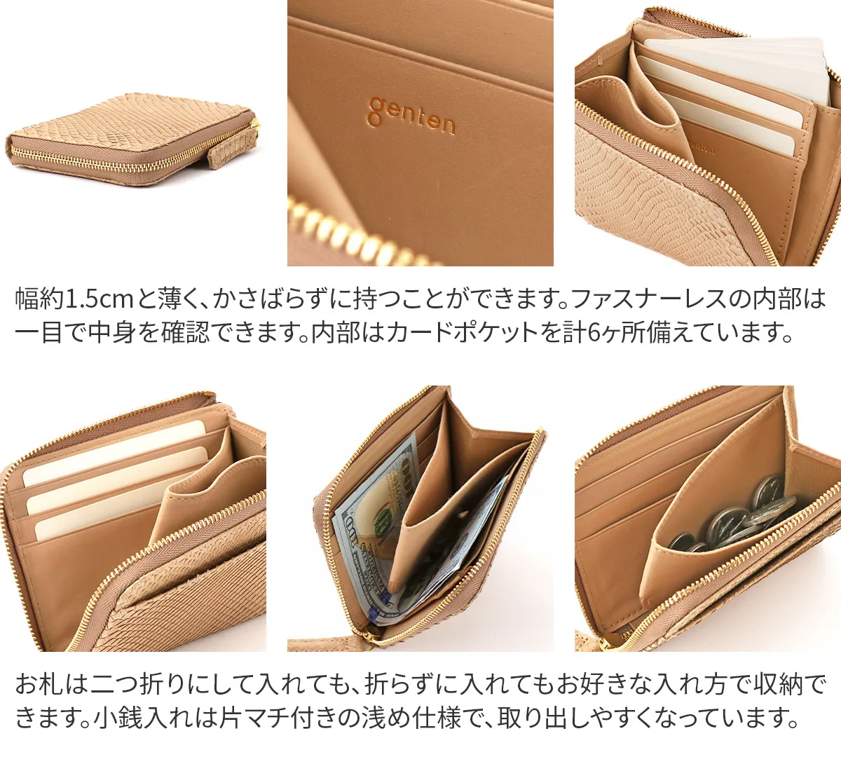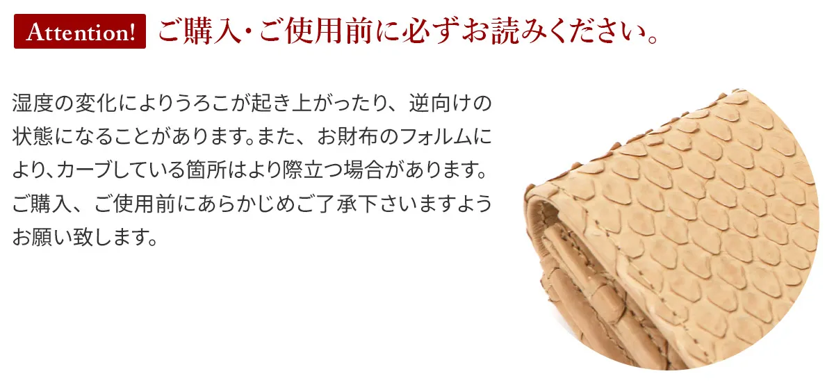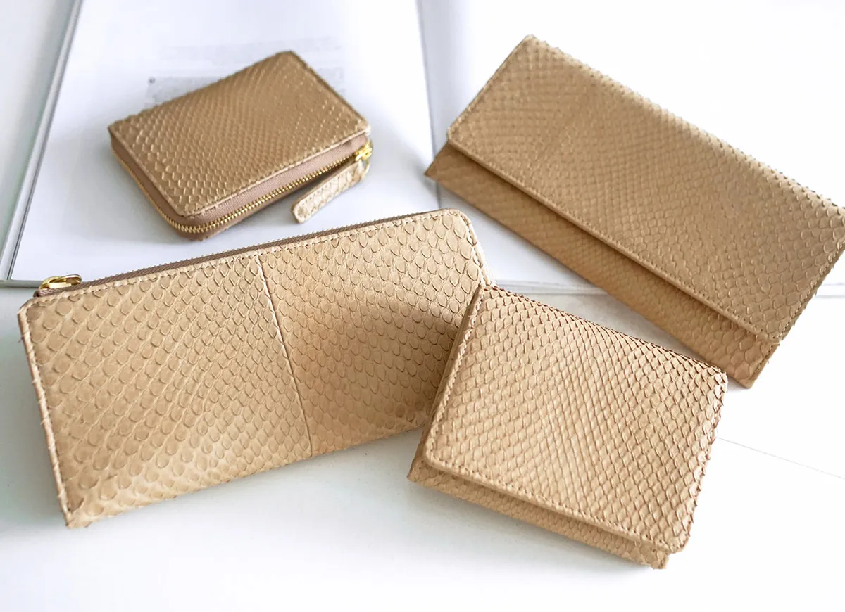 グレースパイソン=“優雅な蛇”金運を上げるといわれ縁起物の象徴とされる、蛇。性別を問わず、持つ人になじむのはgentenのパイソンレザーが革の本来のしなやかさ、うろこの風合いを大切に素上げでやわらかに仕上げているから。従来のダイヤモンドパイソンはパフっと柔らかな作りにしていましたが、グレースパイソンは革の薄さを活かすため芯材の厚みにも拘り、シャープですっきりとした仕様に。 〈素材の特性・メリット〉原皮:蛇革(東南アジア) 鞣し加工:日本 鞣しの種類:クロムフリー鞣し 特別なお手入れは必要ありませんが、お手入れ用品を使用する際はパイソン専用、もしくはエキゾチックレザー専用のものをご使用ください。使い込むごとにしっとりと手になじみ、銀面の艶が増してゆきます。 蛇革とカーフのオールレザーで仕立てられた二つ折り財布は、使う程にしっとりと手に馴染み艶が増していきます。キャッシュレスをメインとて、必要最低限のお金を持ち運びたい方にもオススメです。お札は折らずに入れられ、お支払いもスムーズに行えます◎