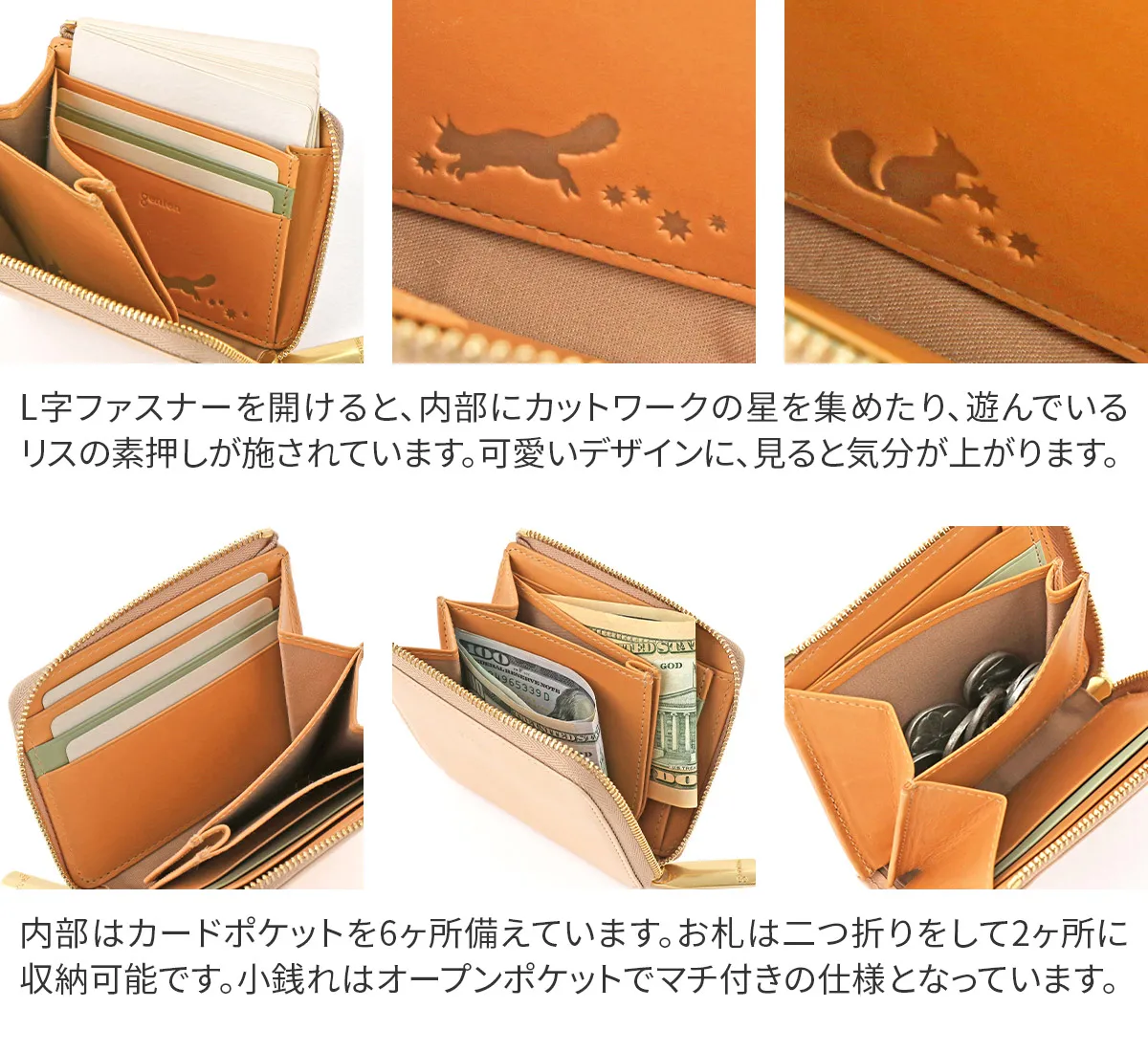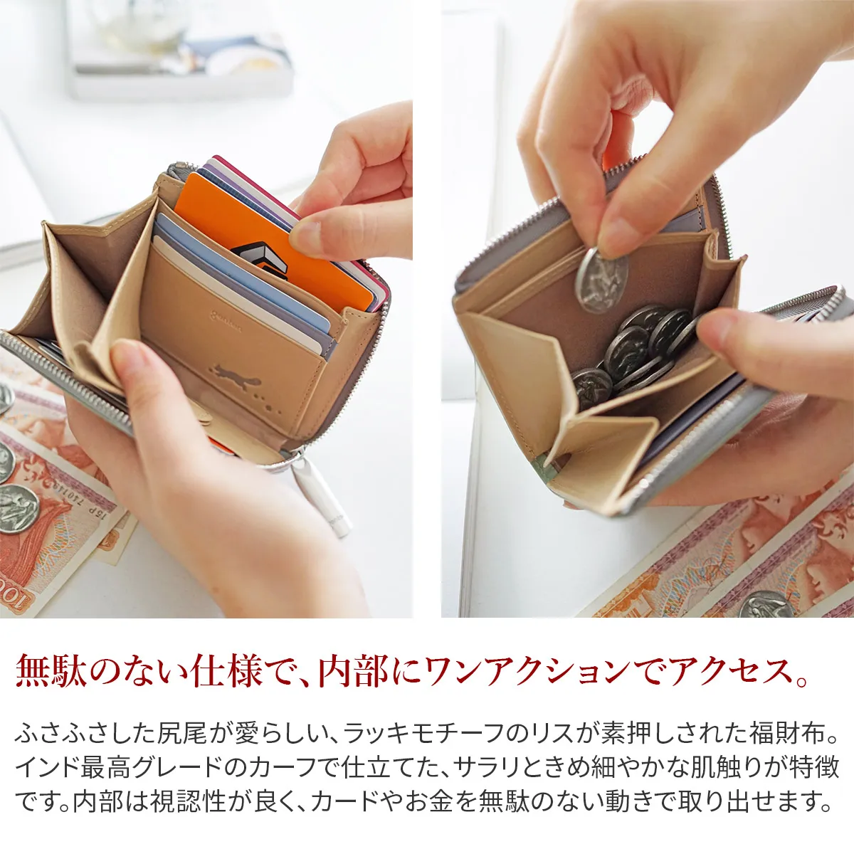 2025年の福財布には、ラッキーアイテムとしてリスがあしらわれています。ドングリや木の実を集めているイメージから、カットワークの星を集めたり、遊んでいる風のリスの刻印を。繁殖力旺盛で木の実を蓄える習性から、蓄財・豊かさ・成功などの象徴とされています。トレンドカラーのやわらかなペールグリーンとエクリュは、気持ちを穏やかにさせてくれます。 〈素材の特性・メリット〉白鞣しの下地から染色をしているため、経年しても赤味が出にくく色が冷めていくのが特徴。非常に軽量で、きめ細やかな手触りをお楽しみください。 お財布内部にラッキモチーフのリスが素押しされた、愛らしいデザインのミニウォレットです。ラインレザーの差し色もアクセントになりこだわりが詰まっています。小ぶりながら、カードポケットとお札、小銭と分けて収納可能。インドの最高グレードのカーフを使用した、上品に持てるウォレットです。