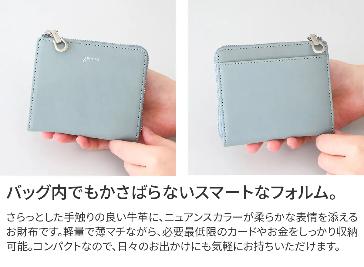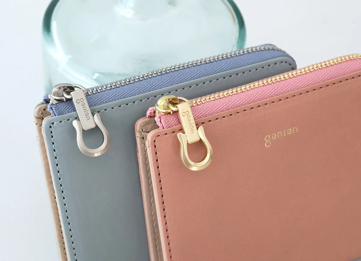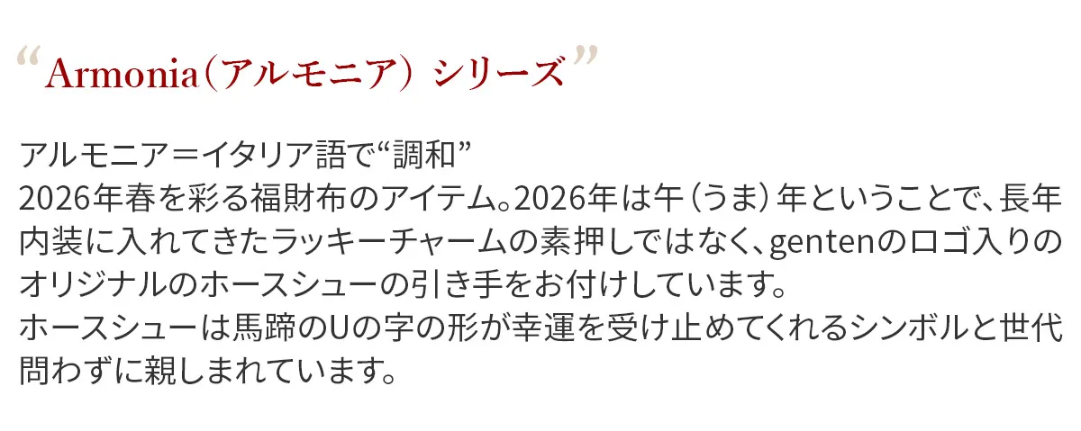 アルモニア=イタリア語で“調和” 2026年春を彩る福財布のアイテム。2026年は午(うま)年ということで、長年内装に入れてきたラッキーチャームの素押しではなく、gentenのロゴ入りのオリジナルのホースシューの引き手をお付けしています。ホースシューは馬蹄のUの字の形が幸運を受け止めてくれるシンボルと世代問わずに親しまれています。財布を開くと内装には光を受けて煌めく箔押しのカード段が一段でアクセントに。 〈素材の特性・メリット〉 鞣しの種類:白鞣し 白鞣しの下地から染色をしているため、経年しても赤味が出にくく色が冷めていくのが特徴。非常に軽量で、きめ細やかな手触りをお楽しみください。 シンプルなデザインの二つ折り財布は、上質な革の魅力を手に取って実感できる一品です。カード入れとマチ付きポケットを備え、お札も折らずに収納可能。薄マチとは思えないほど充実した機能性を備えています。
