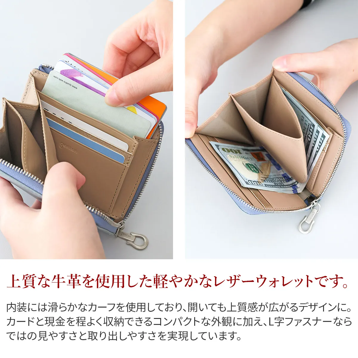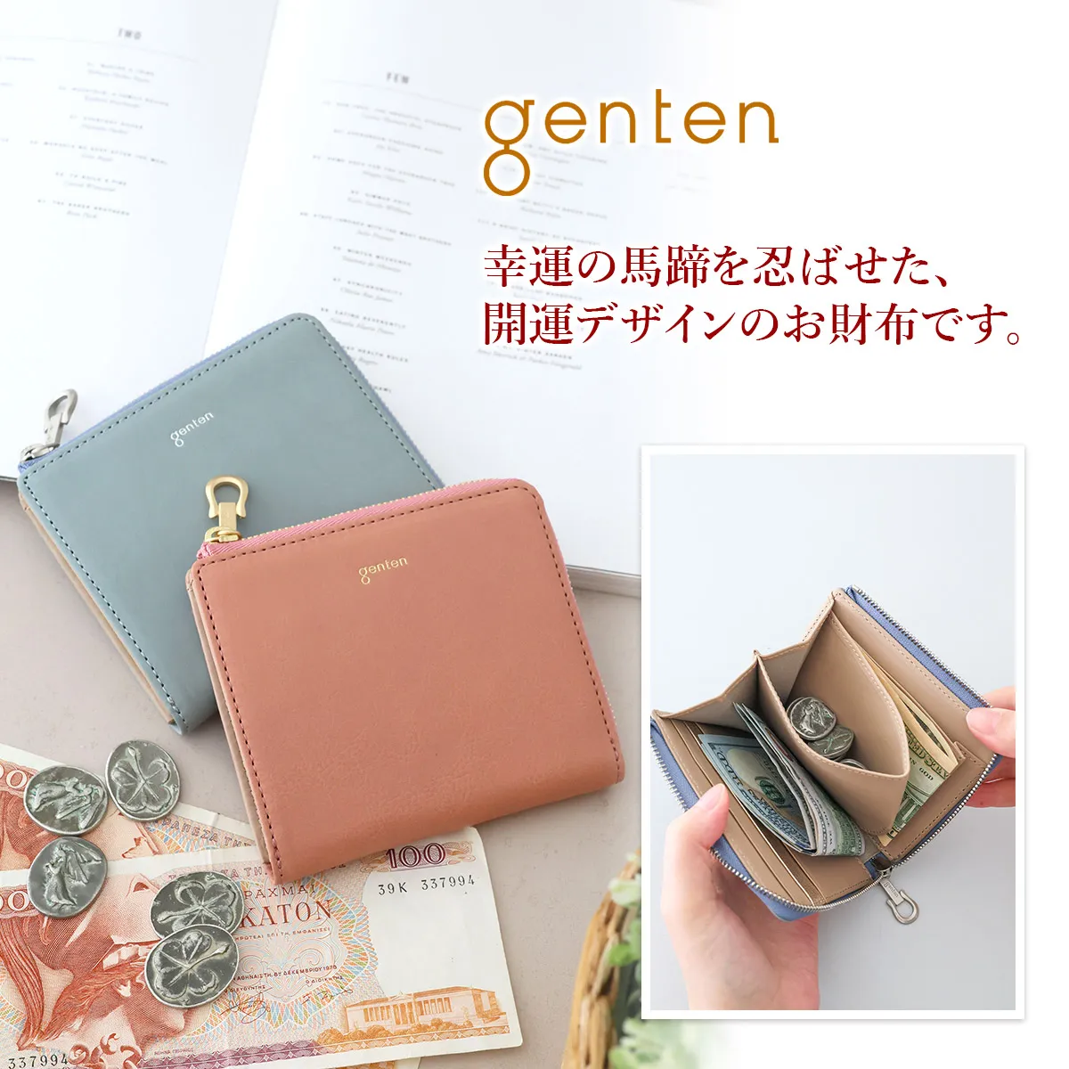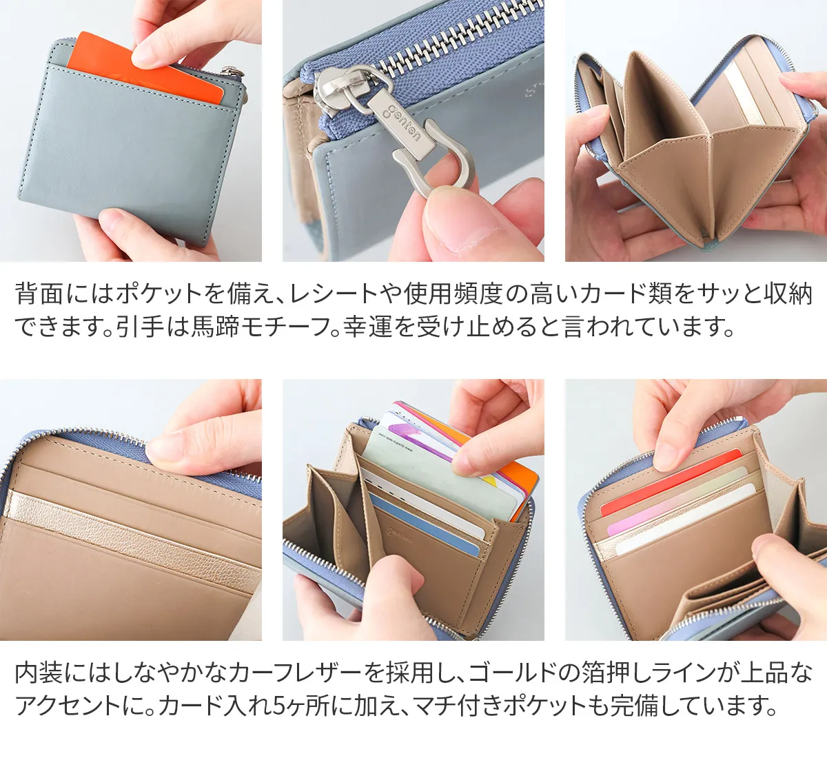 アルモニア=イタリア語で“調和” 2026年春を彩る福財布のアイテム。2026年は午(うま)年ということで、長年内装に入れてきたラッキーチャームの素押しではなく、gentenのロゴ入りのオリジナルのホースシューの引き手をお付けしています。ホースシューは馬蹄のUの字の形が幸運を受け止めてくれるシンボルと世代問わずに親しまれています。財布を開くと内装には光を受けて煌めく箔押しのカード段が一段でアクセントに。 〈素材の特性・メリット〉 鞣しの種類:白鞣し 白鞣しの下地から染色をしているため、経年しても赤味が出にくく色が冷めていくのが特徴。非常に軽量で、きめ細やかな手触りをお楽しみください。 シンプルなデザインの二つ折り財布は、上質な革の魅力を手に取って実感できる一品です。カード入れとマチ付きポケットを備え、お札も折らずに収納可能。薄マチとは思えないほど充実した機能性を備えています。
