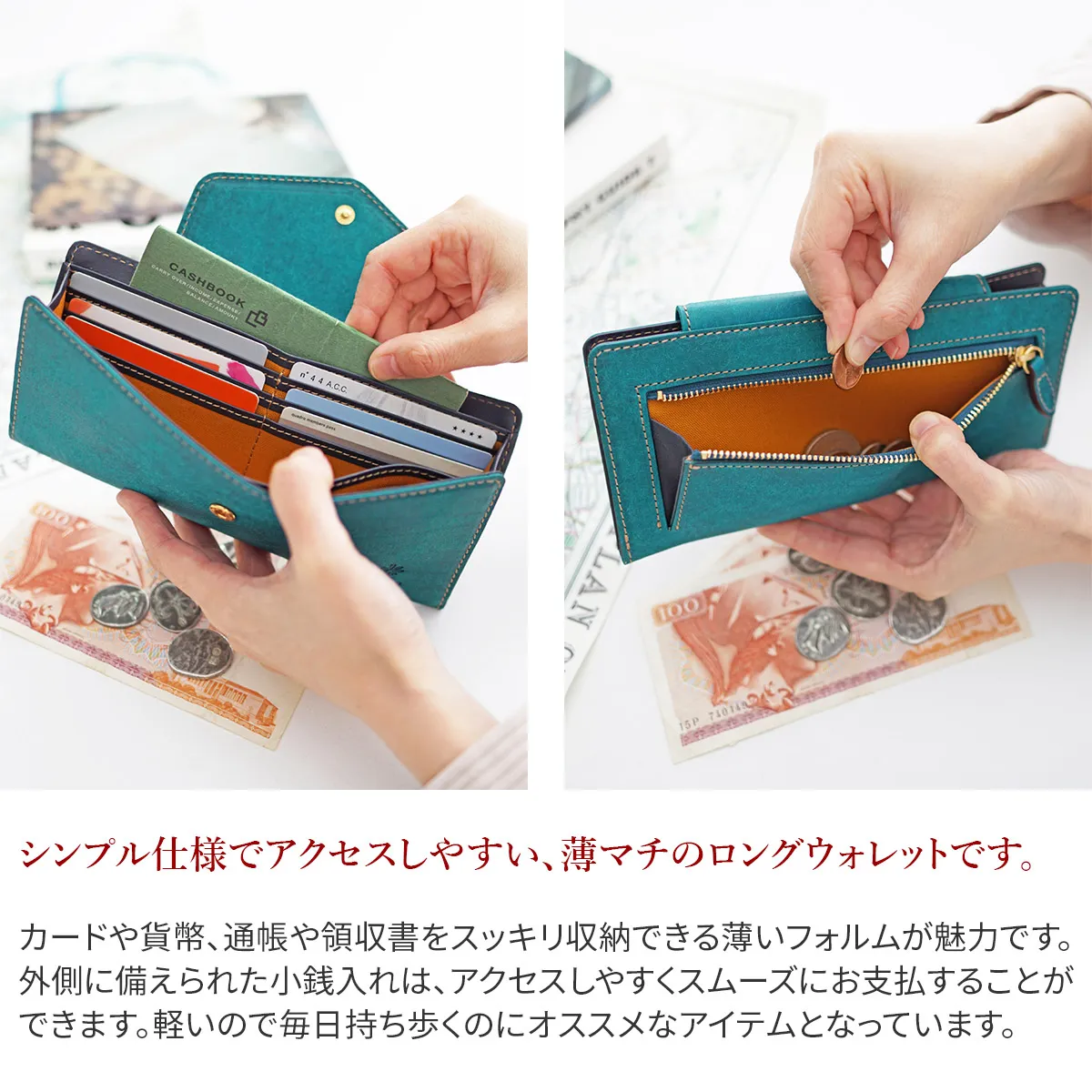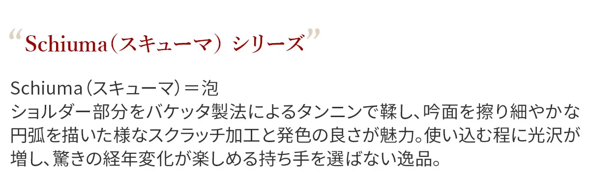 Schiuma(スキューマ)=泡 ショルダー部分をバケッタ製法によるタンニンで鞣し吟面を擦り細やかな円弧を描いた様なスクラッチ加工と発色の良さが魅力。使い込む程に光沢が増し驚きの経年変化が楽しみの持ち手を選ばない逸品 左右に施されたマチで大きく開き中は見通しの良い仕様です。薄マチながら12ヶ所のカード入れを備えています。通帳も収納できるサイズ感で、一万円札もゆったりと入れていただくことができます。