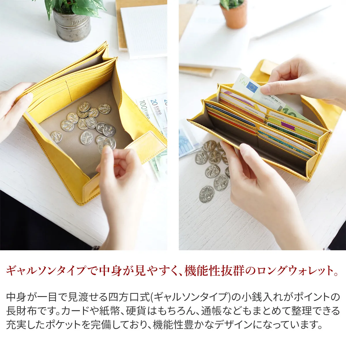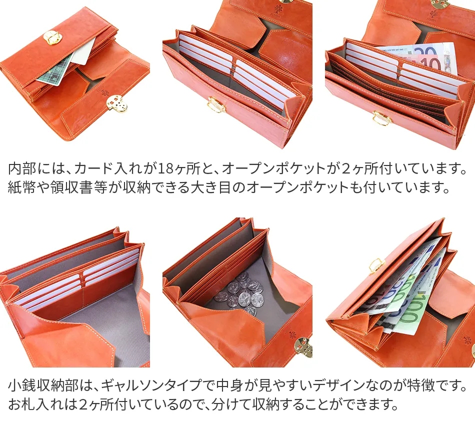 Tamponatoと呼ばれるトスカーナ地方の伝統技法による手染めの革を使用。つや感としわ感が特徴です。 中身が一目で見渡せる四方口式の小銭入がポイントの長財布です。カード入れも豊富で、とっても機能的なお財布です。
