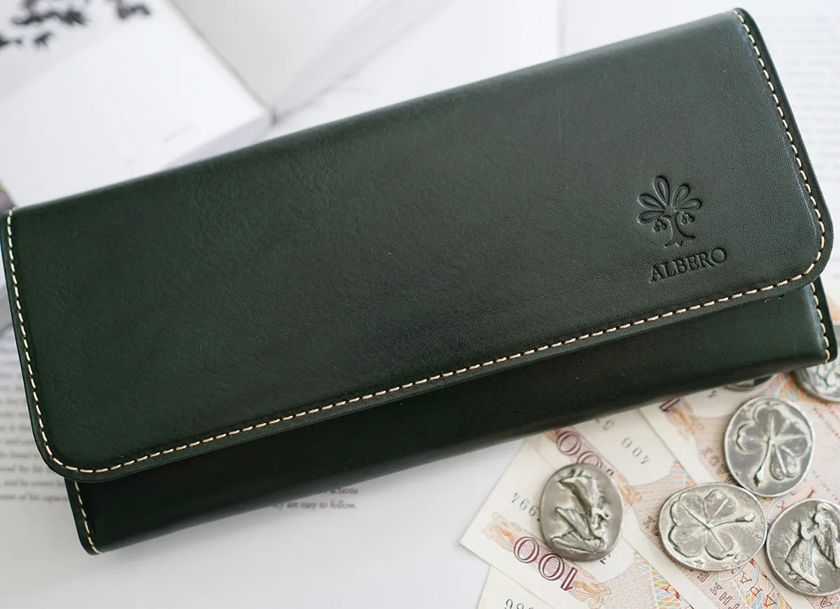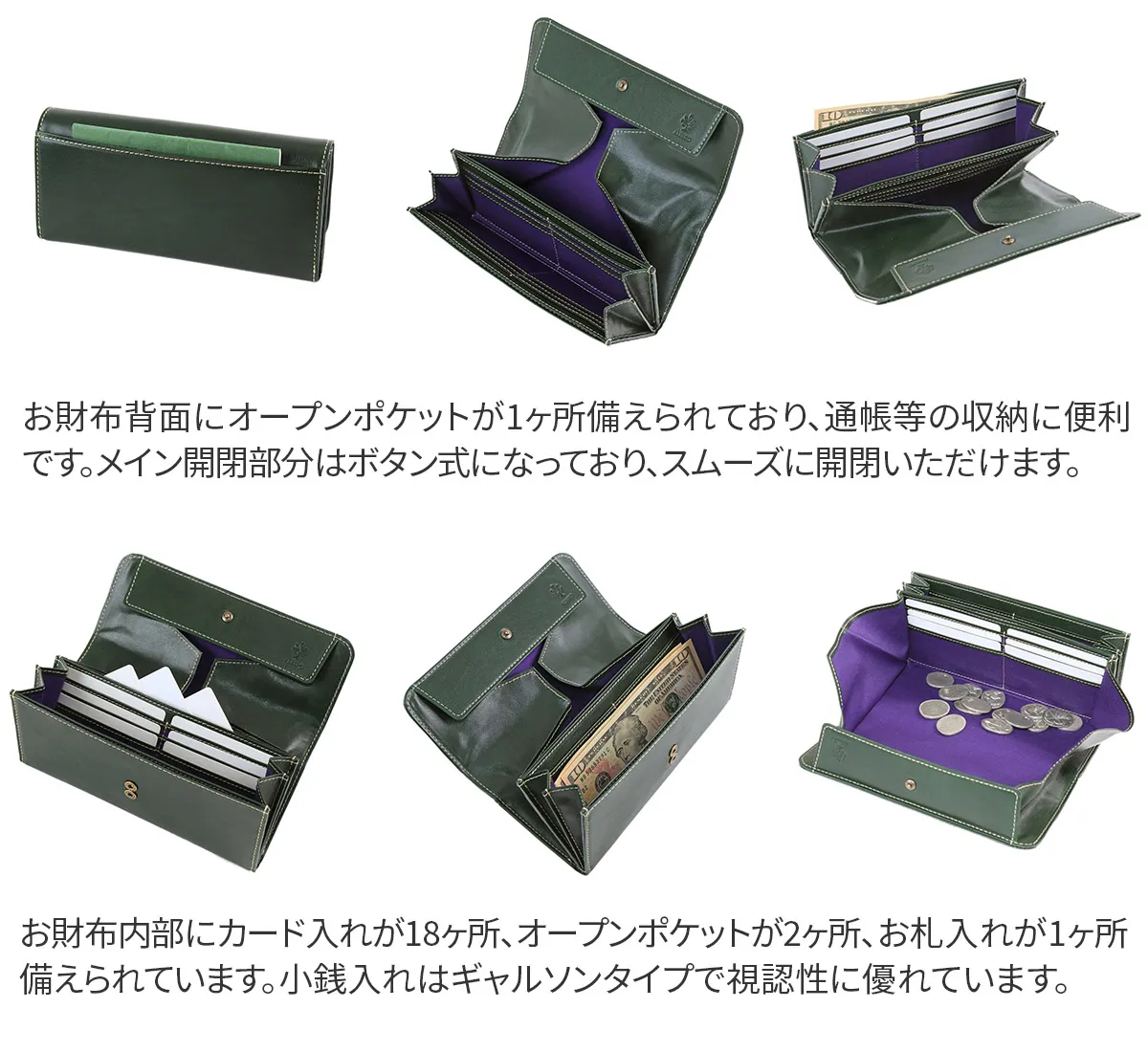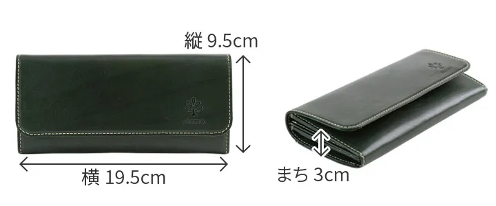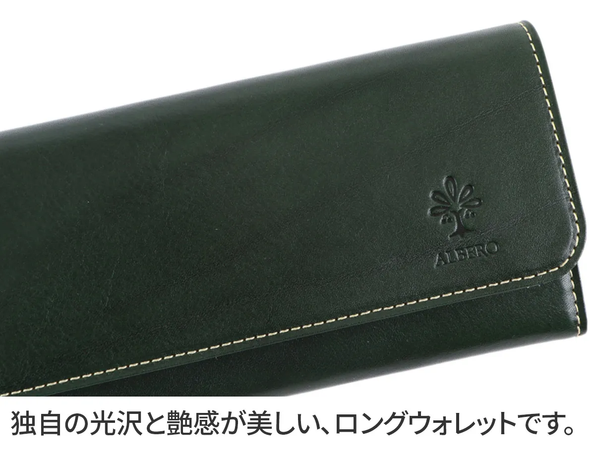 イタリア製牛革のフロント部分にタンポナートと呼ばれる手染めを施し光沢を出した素材。 素材の透明感と、素材のショルダー(肩)に刻まれたトラ(シワ)が特徴。 カード、紙幣、硬貨を、ワンアクションで取り出すことができるシンプルな機能性が特徴のロングウォレットです。収納力も抜群で、お財布内部にカード入れが18ヶ所、オープンポケットが2ヶ所備えられており、通帳も収納いただけます。
