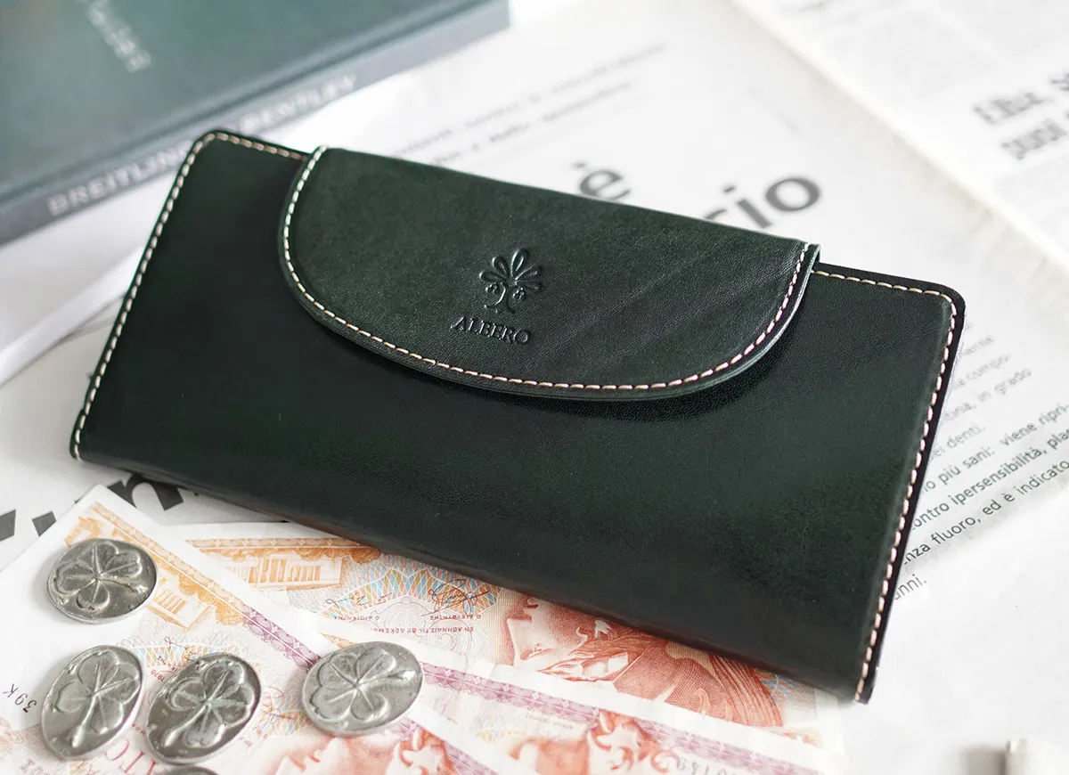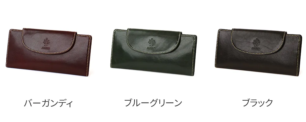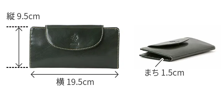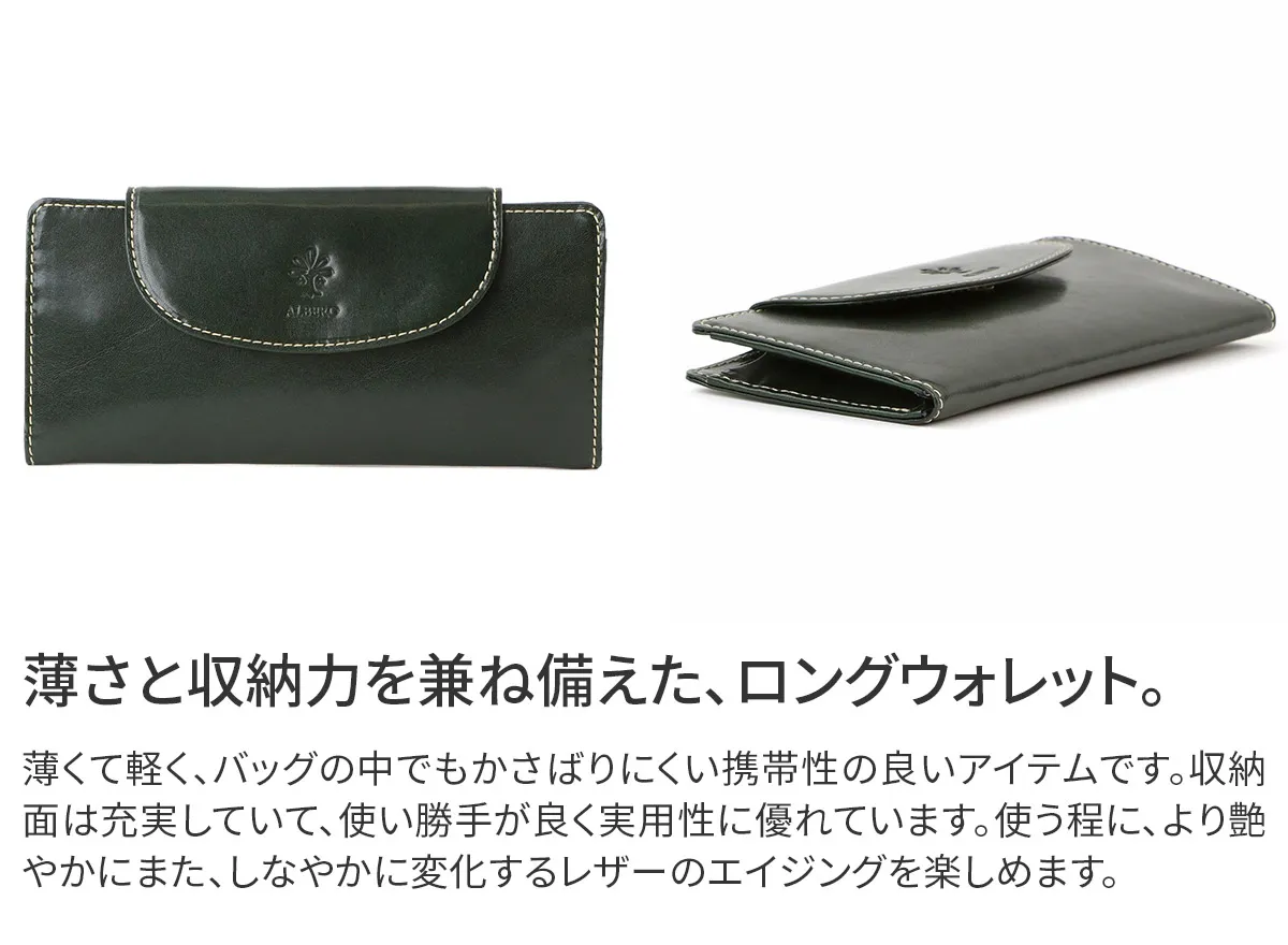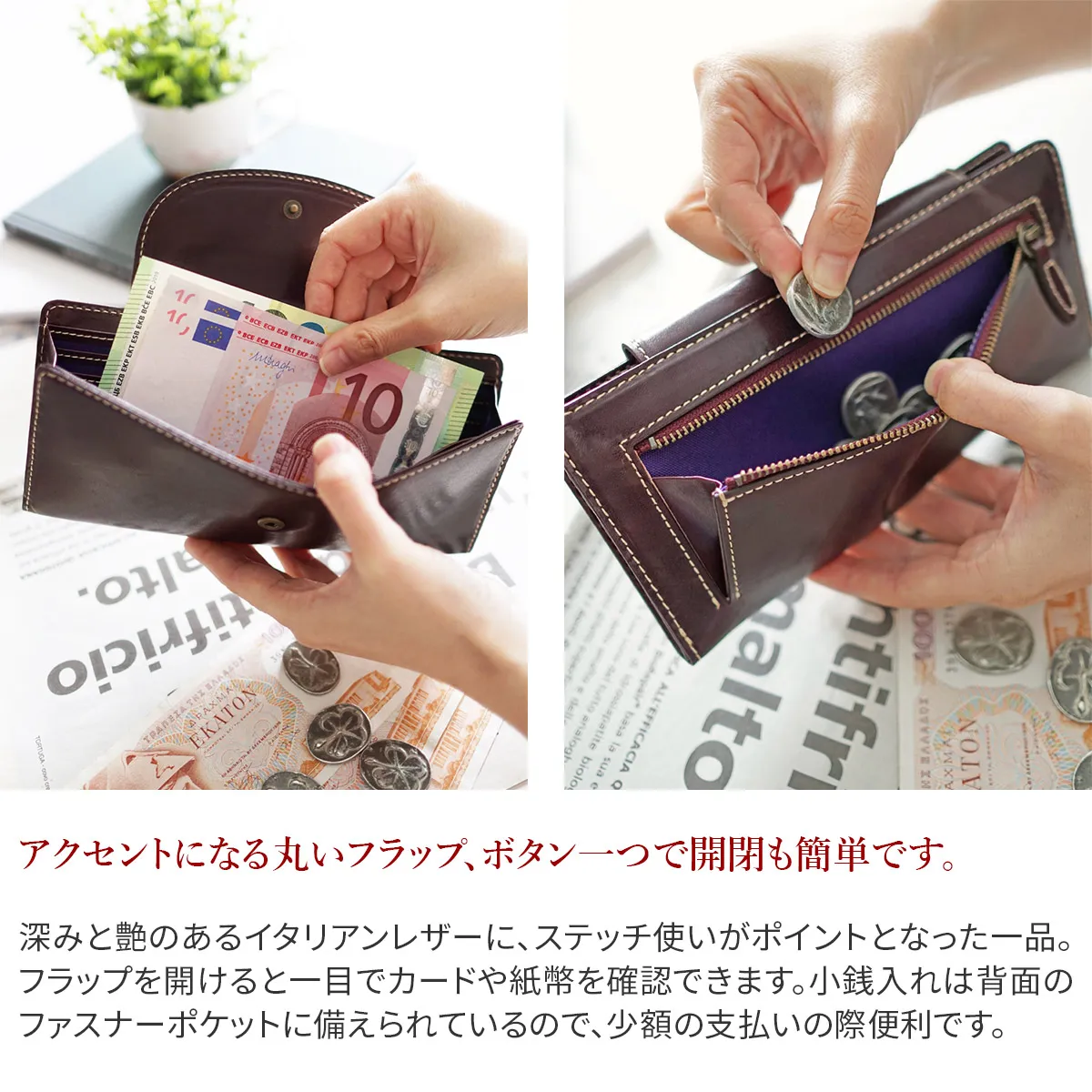 イタリア製牛革のフロント部分にタンポナートと呼ばれる手染めを施し光沢を出した素材。素材の透明感と、素材のショルダー(肩)に刻まれたトラ(シワ)が特徴。 フラップを開けると、カードや紙幣を見渡せる視認性の良い作りです。ワンアクションで目的の物を取り出せます。外には小銭入れも備えられているのでアクセスの良い仕様となっています。