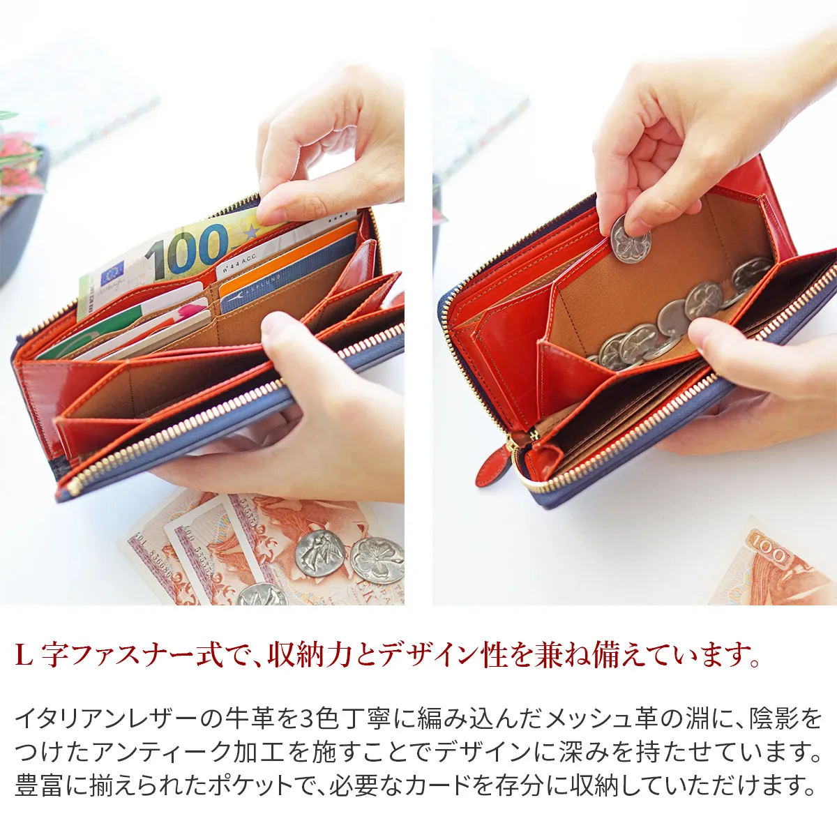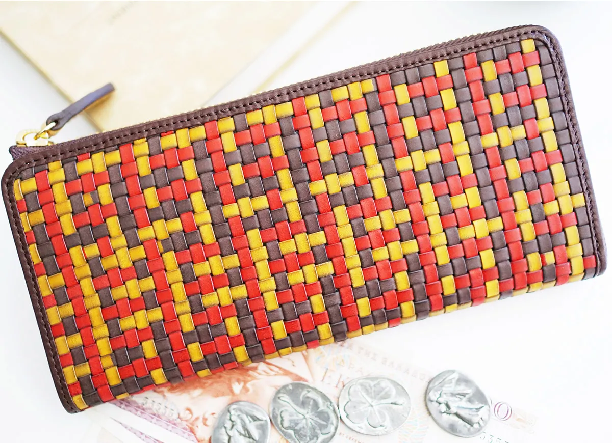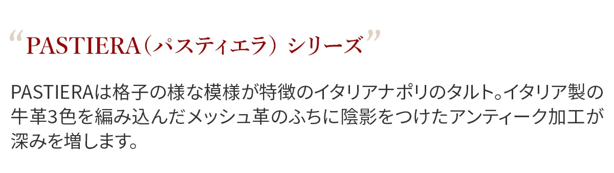 PASTIERAは格子の様な模様が特徴のイタリアナポリのタルト。 イタリア製の牛革3色を編み込んだメッシュ革のふちに陰影をつけたアンティーク加工が深みを増します。 L字ファスナーの引き手は大きめなので掴みやすく、スムーズに開閉できます。内側はアコーディオンの様に開くので、中身の取り出しがスムーズです。 カード入れが12ヶ所、フリーポケットが4ヶ所備わっており、十分なカードが収納できます。薄マチでスリムなフォルムの収納力抜群のロングウォレットです。