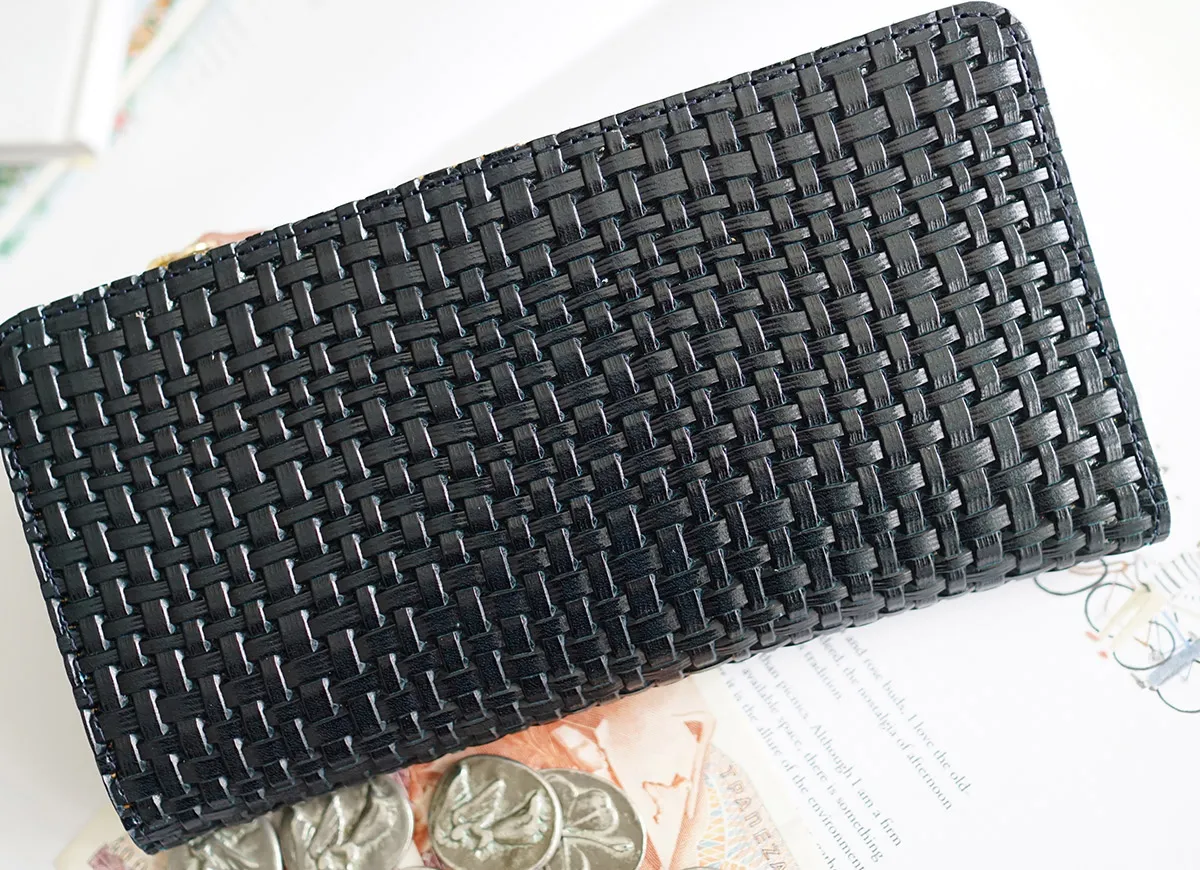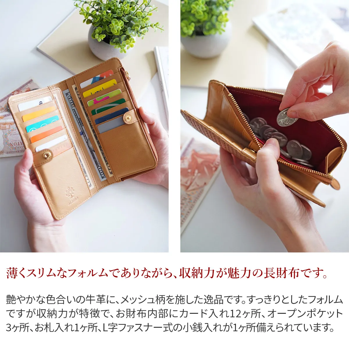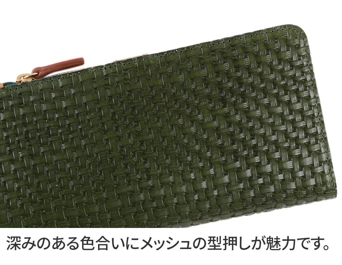 イタリア製牛ショルダーをタンニンでなめし、縄網の様なメッシュ柄を深く型押しをした素材。 コバは切れ目を磨き込んだスタイリッシュでユニセックスなニューラインです。 艶やかな色合いの牛革に、メッシュ柄を施した逸品です。すっきりとしたフォルムですが収納力が特徴で、お財布内部にカード入れ12ヶ所、オープンポケット3ヶ所、お札入れ1ヶ所、L字ファスナー式の小銭入れが1ヶ所備えられています。