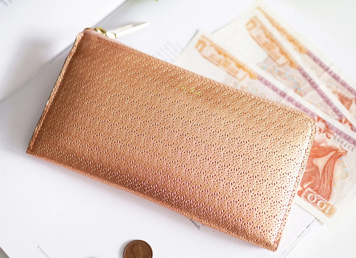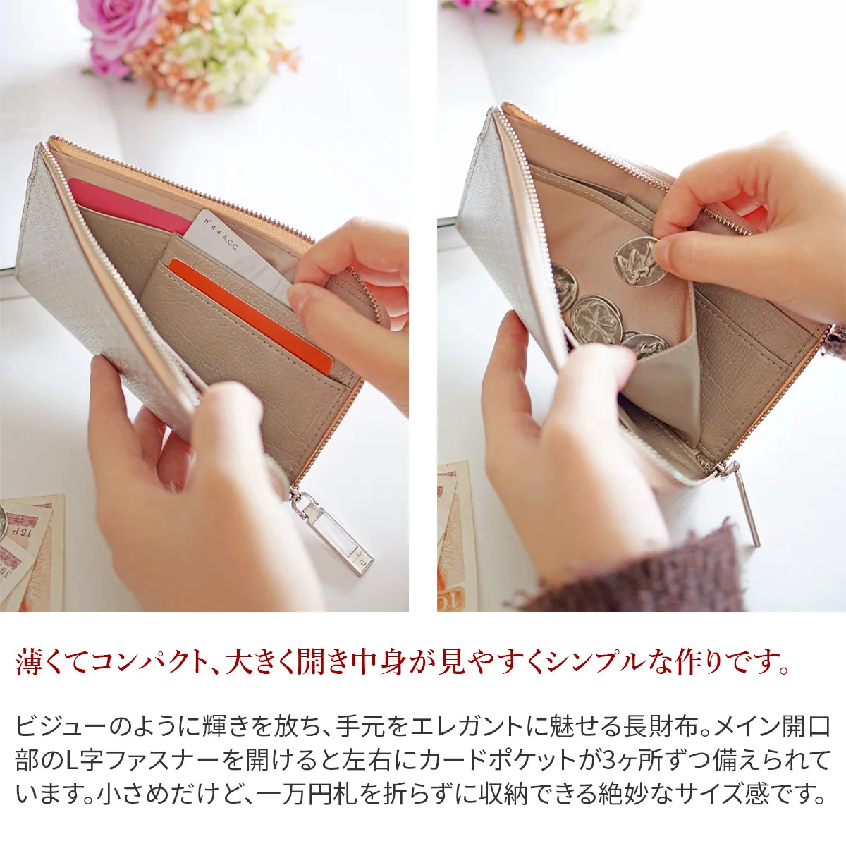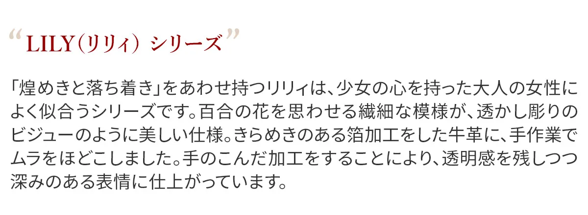 「煌めきと落ち着き」をあわせ持つリリィは、少女の心を持った大人の女性によく似合うシリーズです。百合の花を思わせる繊細な模様が、透かし彫りのビジューのように美しい仕様。きらめきのある箔加工をした牛革に、手作業でムラをほどこしました。手のこんだ加工をすることにより、透明感を残しつつ深みのある表情に仕上がっています。 上品な煌めきが手元を華やかに彩る大人のウォレット。引手のデザインなど細部までこだわりがうかがえます。内部はシンプルな構造で、視認性に優れています。多くなりがちなカード類は厳選して、スッキリ持つことができます。一万円札がジャストフィットし、手に収まりの良いサイズ感でバッグの中でもかさばりにくく、持ち運びに便利です。