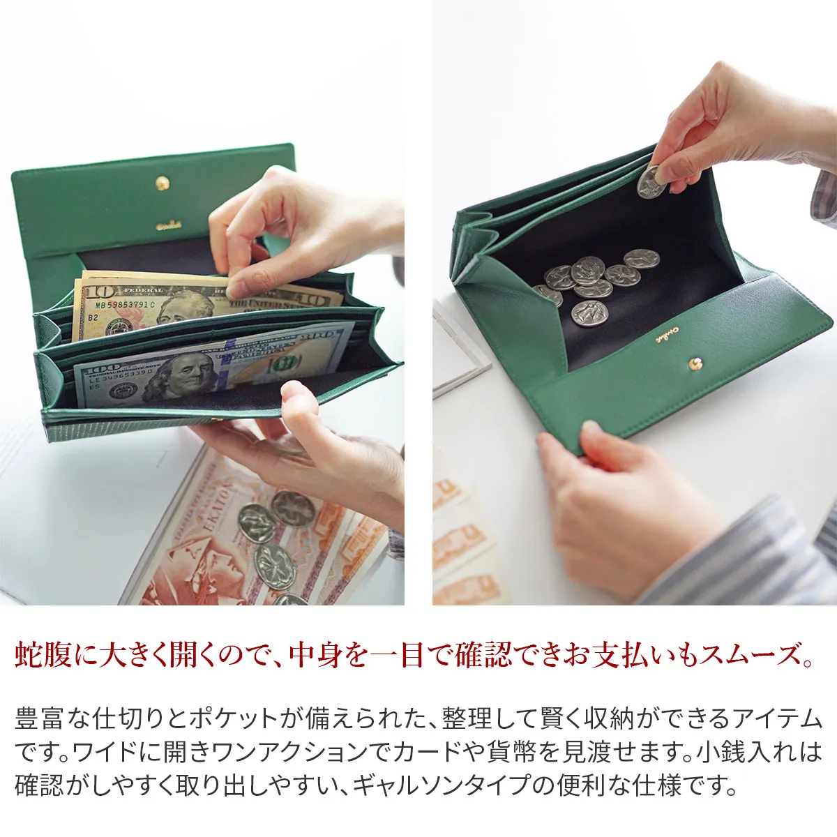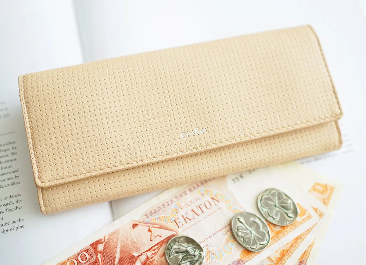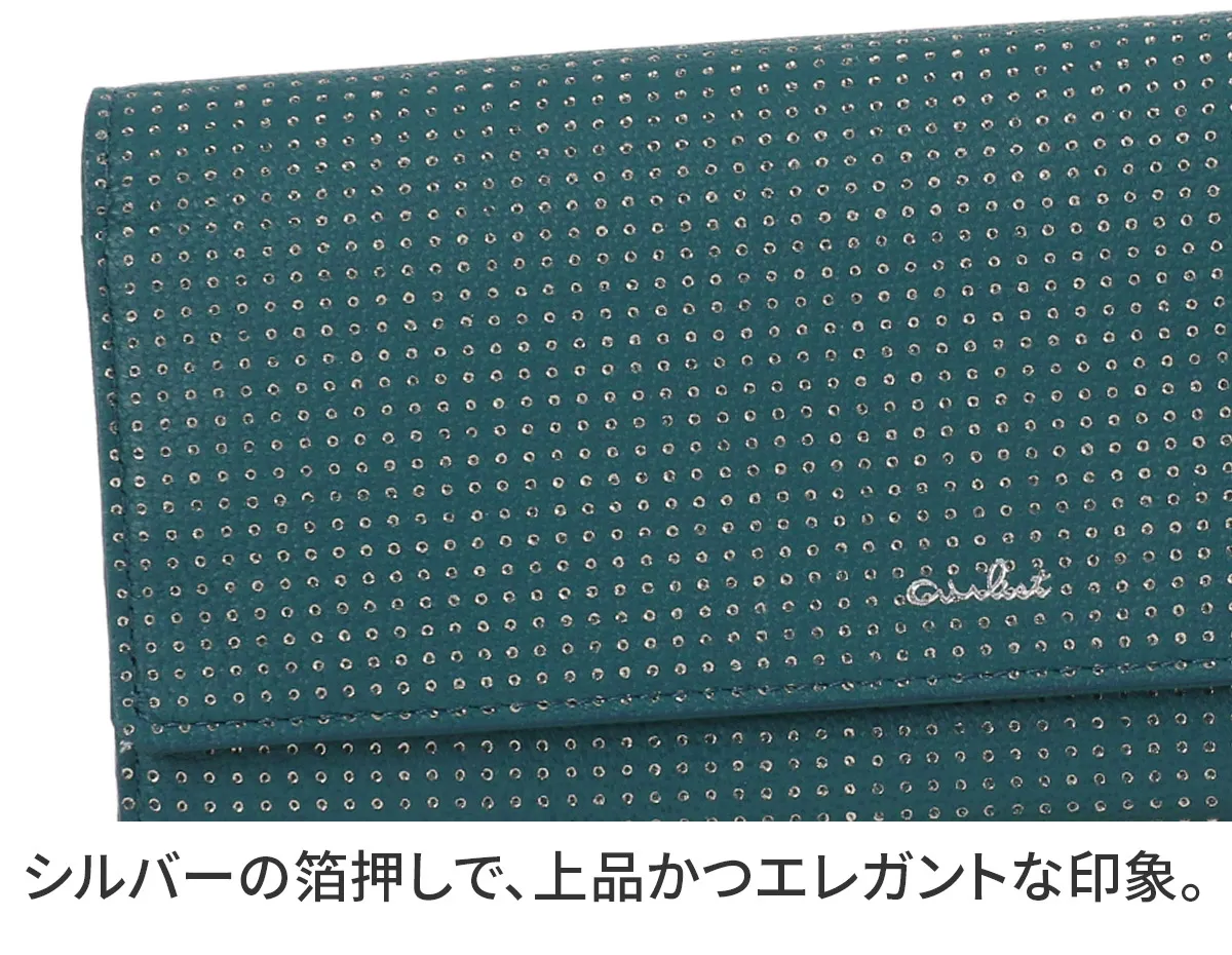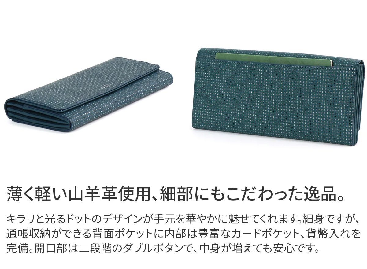 アイヌ語で美しいという意味。やわらかな山羊革に押した箔のドットが角度によって強くなったり儚くなったり…。美しくゆれる光が、星の瞬きにも似て、やさしく女性らしい気持ちにさせてくれます。軽さ、柔らかさが特長であるゴート(山羊革)を使用することでしなやかですっきりとしたお財布に仕上がっています。 少しスモーキーで、ロマンティックなカラーリング。型押しと同時に箔押しをすることで、パンチングしたような立体感のあるピンドットに仕上げられています。 細くスリムなフォルムで手元を上品に魅せてくれます。収納スペースを豊富に完備しており、蛇腹状に開き視認性も抜群。小銭入れはギャルソンタイプで出し入れが簡単。機能性にも優れてたアイテムとなっています。