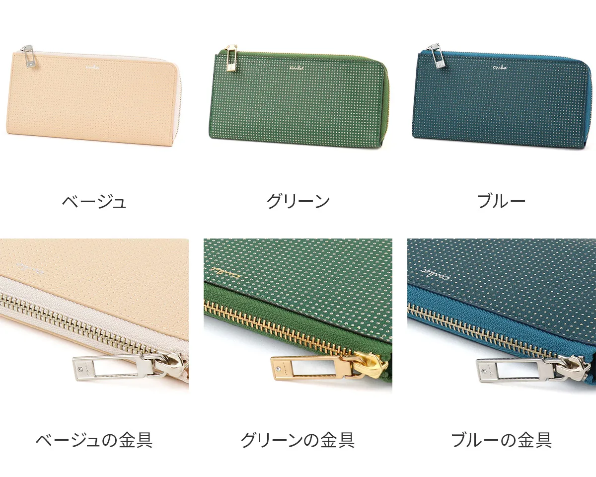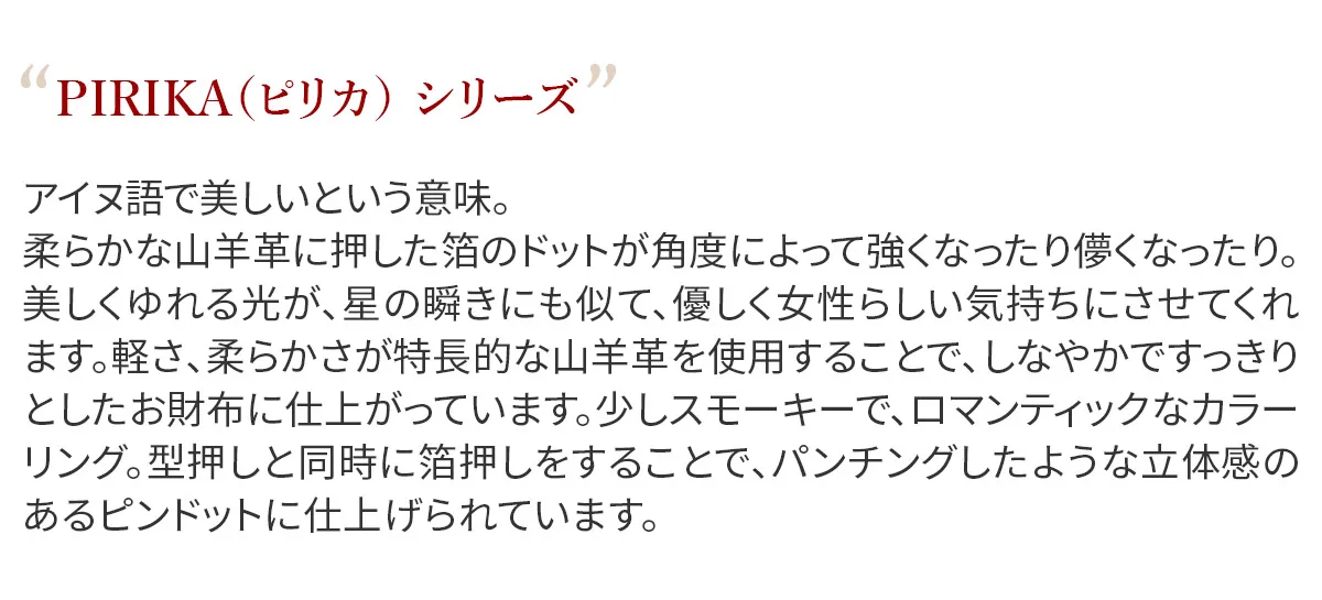 アイヌ語で美しいという意味。やわらかな山羊革に押した箔のドットが角度によって強くなったり儚くなったり…。美しくゆれる光が、星の瞬きにも似て、やさしく女性らしい気持ちにさせてくれます。軽さ、柔らかさが特長であるゴート(山羊革)を使用することでしなやかですっきりとしたお財布に仕上がっています。 少しスモーキーで、ロマンティックなカラーリング。型押しと同時に箔押しをすることで、パンチングしたような立体感のあるピンドットに仕上げられています。 銀の箔押しと引手のストーンがエレガントさを引き立てるロングウォレットです。スムーズに開閉ができるL字ファスナーを開けると、内部はファスナーレスで、カードや貨幣を一目で見渡せ取り出すことができます。軽くて耐久性の良いレザーは、デイリー使いに最適です。