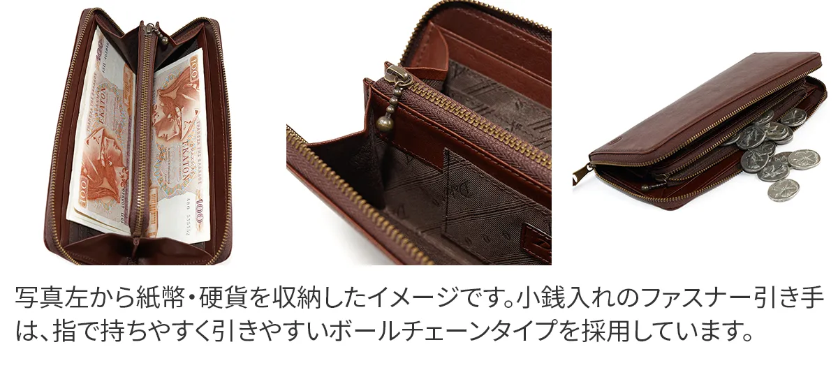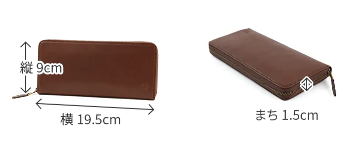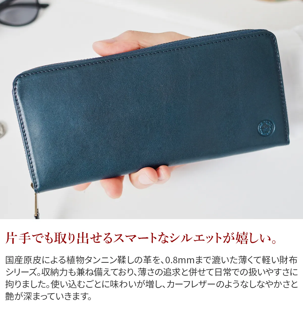 国産原皮による植物タンニン鞣しの革を0.8mmまで漉いた薄くて軽い財布シリーズ。 収納力も兼ね備えており、薄さの追求と併せて日常での扱いやすさに拘りました。使い込むごとに味わいが増し、カーフレザーのようなしなやかさと艶が深まっていきます。 少しアクセント効かせたステッチラインが、シンプルなフォルムを引き立てています。 カード類・硬貨・紙幣をスマートに収納できるラウンドファスナー式長財布。一般的なラウンドタイプよりもスリムなデザインでビジネスからプライベートまで幅広いシーンでお使いいただけるアイテムです。