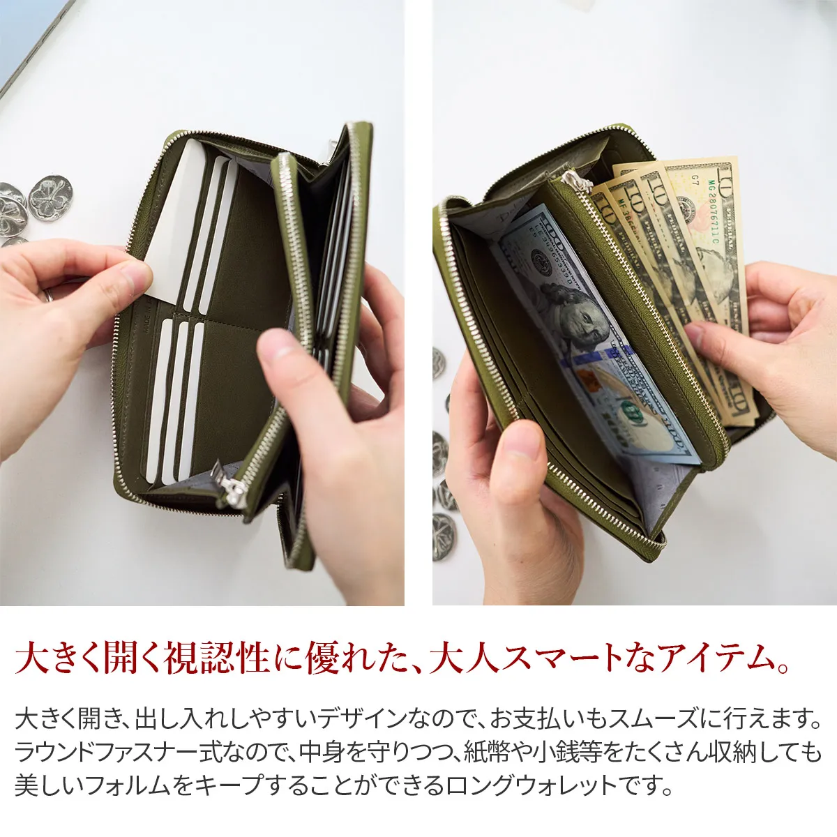 日本の職人が手掛ける、繊細な技術を取り入れたシリーズ。 カード段のラインや風琴マチなど、伝統的な技法を用いることで、機能性の高さと見た目の美しさを兼ね備えています。 しなやかで軽いタッチ感と透明感のある色合いが特徴で、日常での優美さを演出するアイテムです。 使い心地の良いシンプルな設計で長く使いたくなる長財布。 カード類・硬貨・紙幣をスマートに収納できます。ラウンドファスナー式で中身が落ちる心配もないので安心です。普段の生活やビジネスなど幅広いシーンでお使いいただける逸品です。