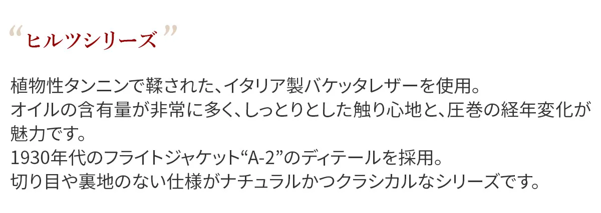 植物性タンニンで鞣された、イタリア製バケッタレザーを使用。 オイルの含有量が非常に多く、しっとりとした触り心地と、圧巻の経年変化が魅力です。 1930年代のフライトジャケット“A-2”のディテールを採用。 切り目や裏地のない仕様がナチュラルかつクラシカルなシリーズです。 シンプルな外観で革本来の魅力を楽しめるアイテム。 薄マチながらも、必要なものをしっかり収納できる使い心地抜群の逸品です。 L字ファスナー式で大きく開くので、中身を一目で確認できます。
