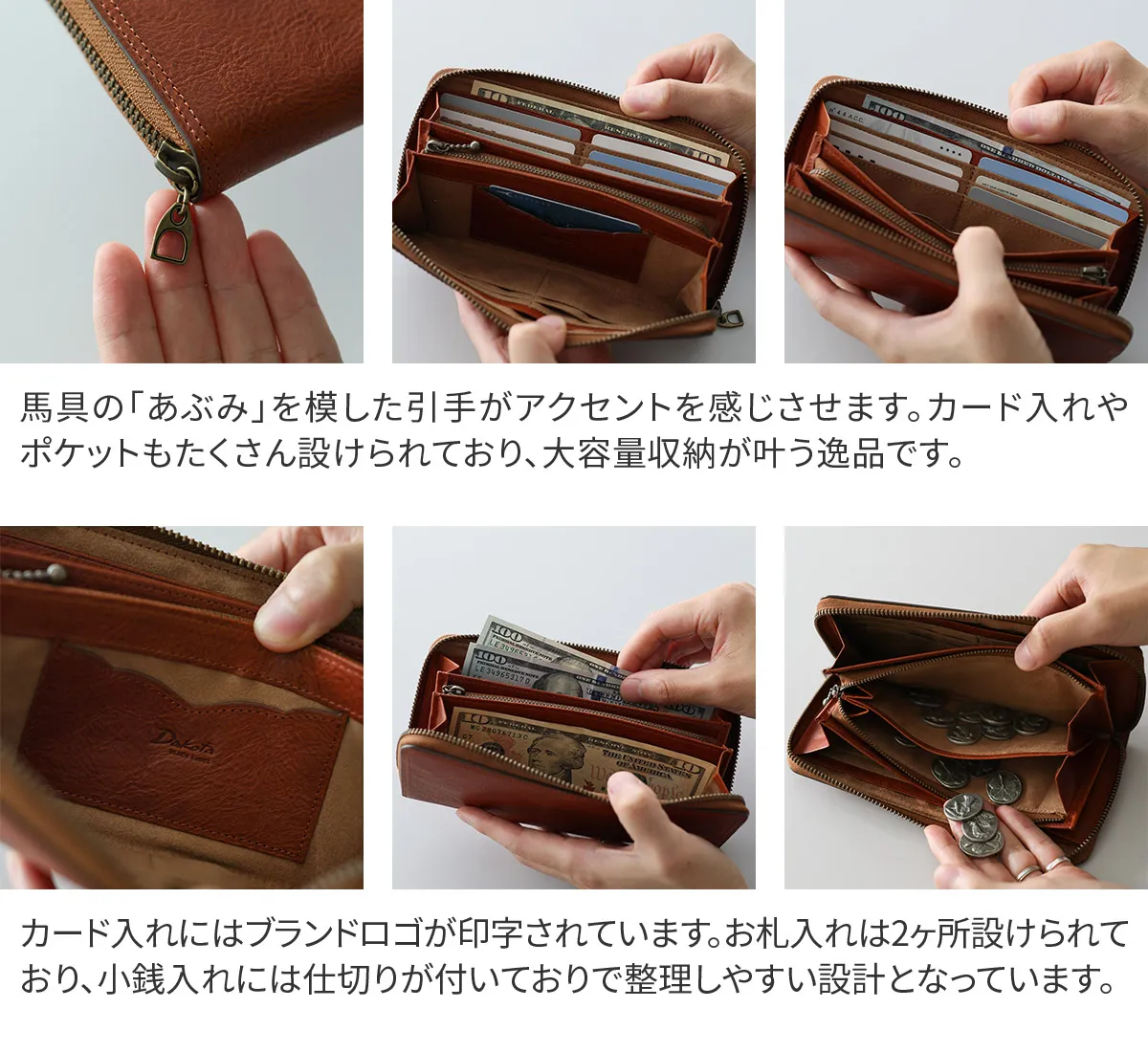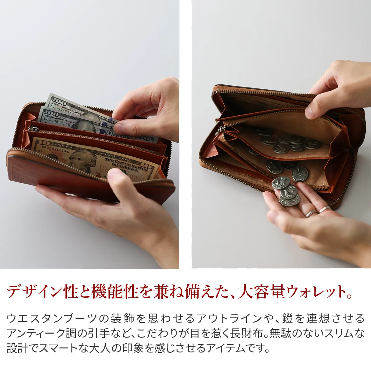 バケッタレザーに西部開拓時代のエッセンスを加えたシリーズ「ハイデ」。 普遍的なデザインに、ウエスタンブーツの装飾を思わせるアウトラインや、鐙を連想させるアンティーク調の引手など、さりげないアクセントが上品な表情を添えています。 荒野や未開拓地を思わせる色合いは、使い込むほどに革の風合いが増し、エイジングの楽しさを存分に味わえます。 伝統的な素材とディティールを大切にしながらも、現代のライフスタイルに合ったサイズ感と機能性を兼ね備えた逸品です。 西部開拓時代の空気感を纏った、ラウンドファスナー式の長財布。 イタリア製バケッタレザーが、使い込むほどに艶と風合いを深めます。 ウエスタンブーツを思わせる曲線のアウトラインが、個性を演出。 カード13枚収納、小銭入れは仕切り付きで整理しやすい設計。 クラシカルな佇まいと現代的な機能性を両立した逸品です。